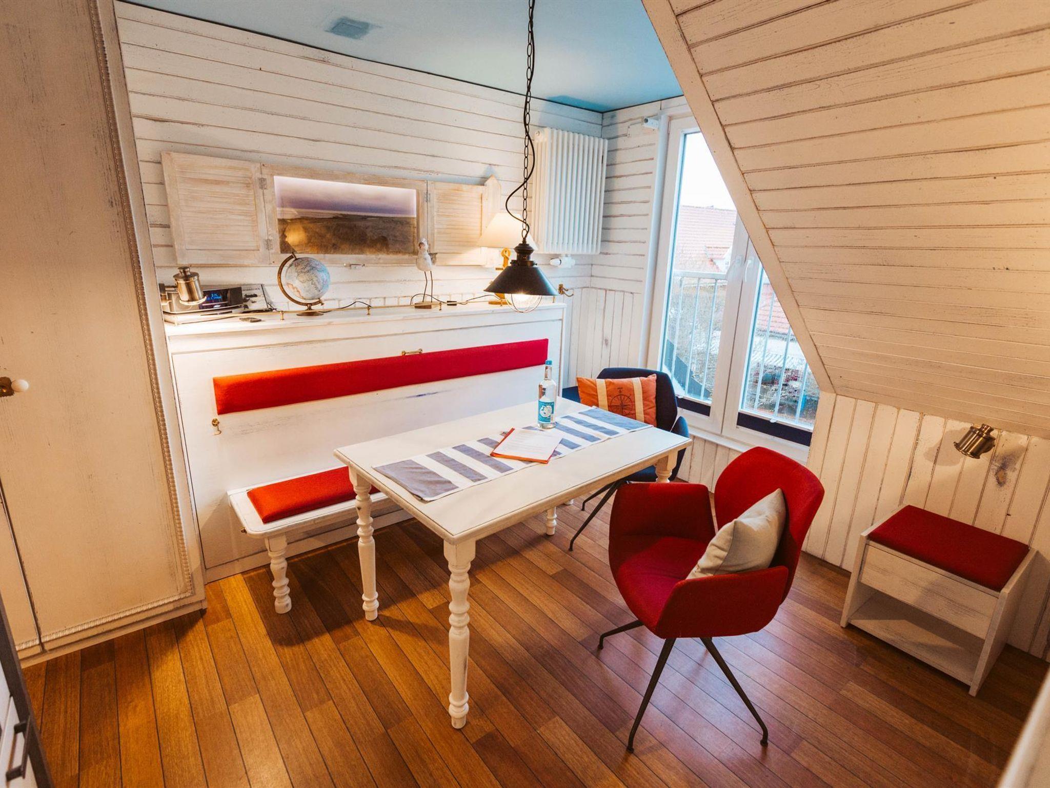 Motto: Stell dir vor, du strandest mit deinem Segelschiff am Strand und kommst nicht mehr weg dann baust dir dein Schiff zu einer gemütlichen kleinen Wohnung um - mit viel Holz, Bullaugen und allem möglichen, was man auf einem Schiff so hat - natürlich ohne den modernen Komfort zu vernachlässigen.