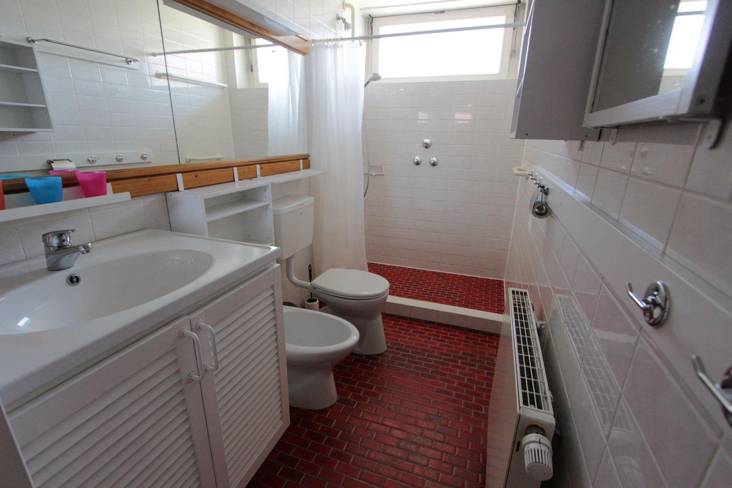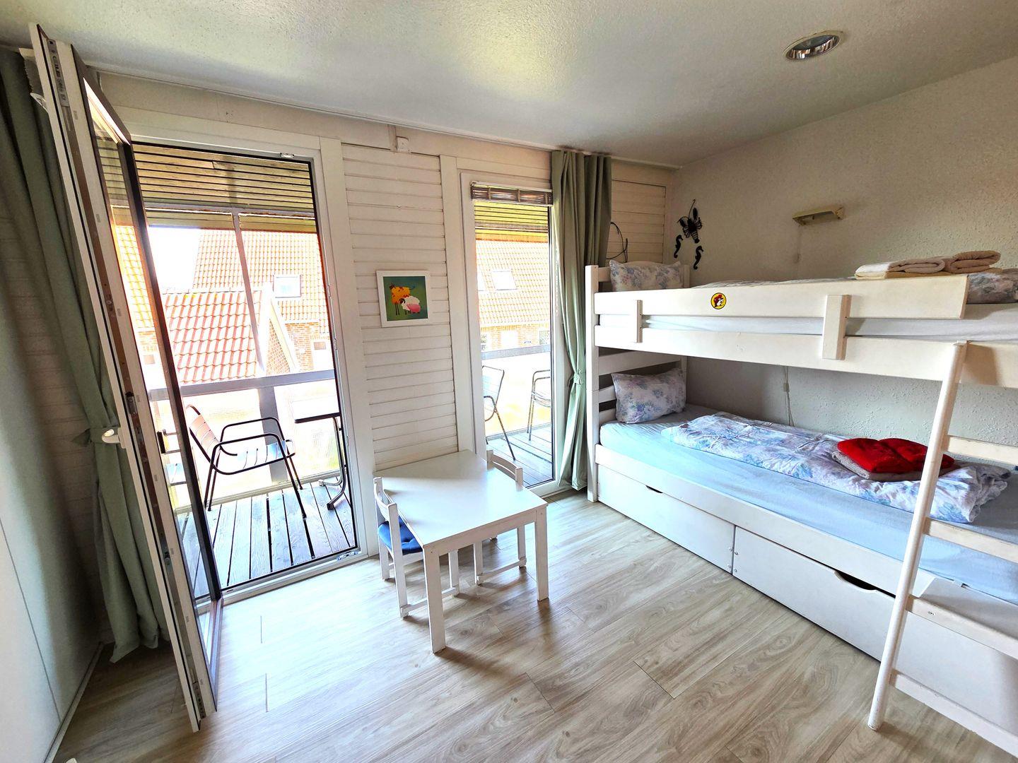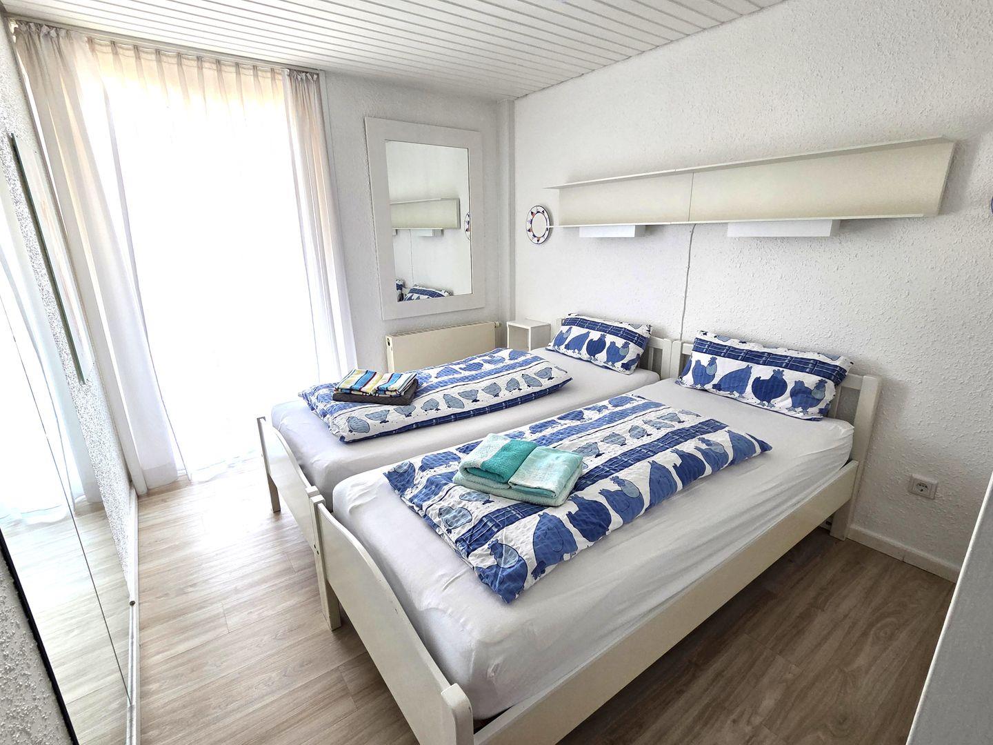 1 Schlafzimmer mit Doppelbett 180 cm x 200 cm Liegefläche und großen Einbauschränken. 1 Schlafzimmer mit Etagenbett 90 cm x 200 cm Liegefläche mit Übergang zum Balkon. Badezimmer mit Dusche und WC, inkl. WLAN