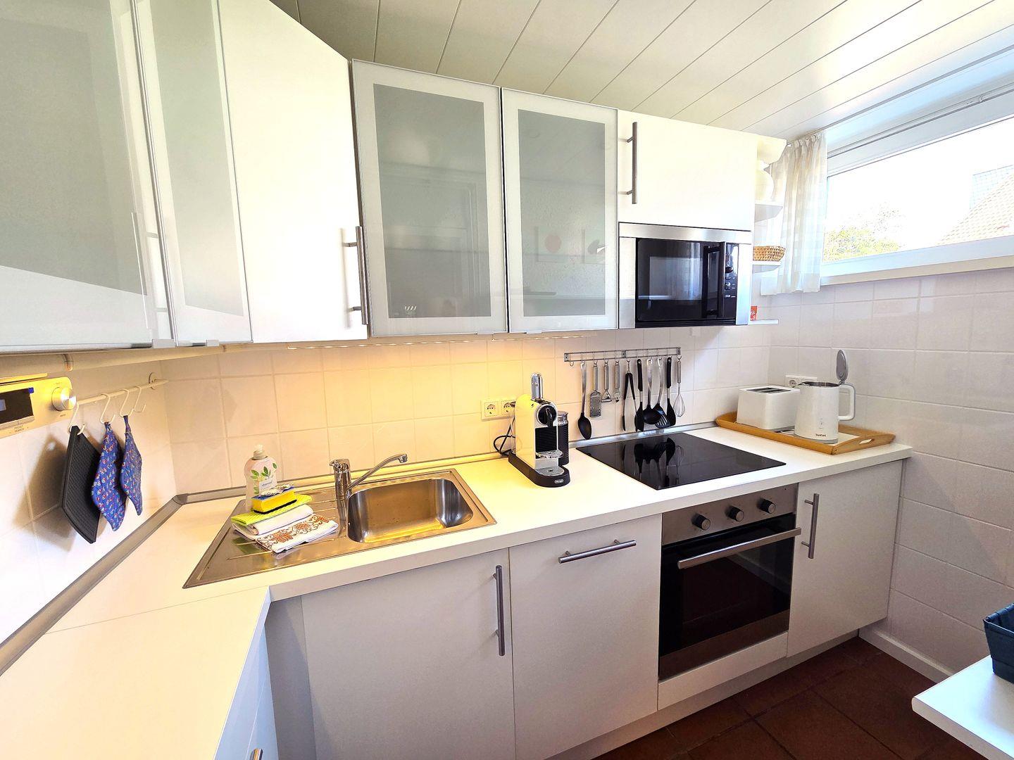 Im EG des Hauses befindet sich das großzügige Wohnzimmer mit TV, kleinem Sekretär, Sessel sowie zwei Sofas. Die Küche wurde im Jahr 2020 erneuert und ist voll ausgestattet mit Geschirrspüler, Kühlschrank und vielen weiteren Küchenhelfern. Ein großer Esstisch mit Sitzbank befindet sich gegenüber der Küche.