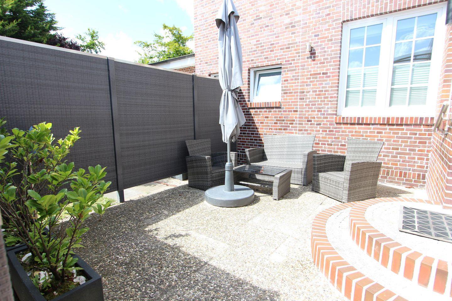 Wunderschöne, hochwertig ausgestattete Ferienwohnung, 40 m², mit Terrasse, eine Wohnküche mit Küchensofa und Flachbildfernseher, komplett ausgestatteter Einbauküche mit Cerankochfeld, Backofen und Geschirrspülmaschine, Toaster, Kaffeemaschine und Wasserkocher. Ein Schlafzimmer (Doppelbett mit TV-Flachbildschirm), modernes Bad mit Dusche und WC, Terrassenmöbel sind vorhanden.