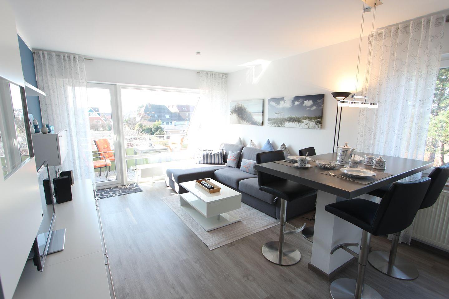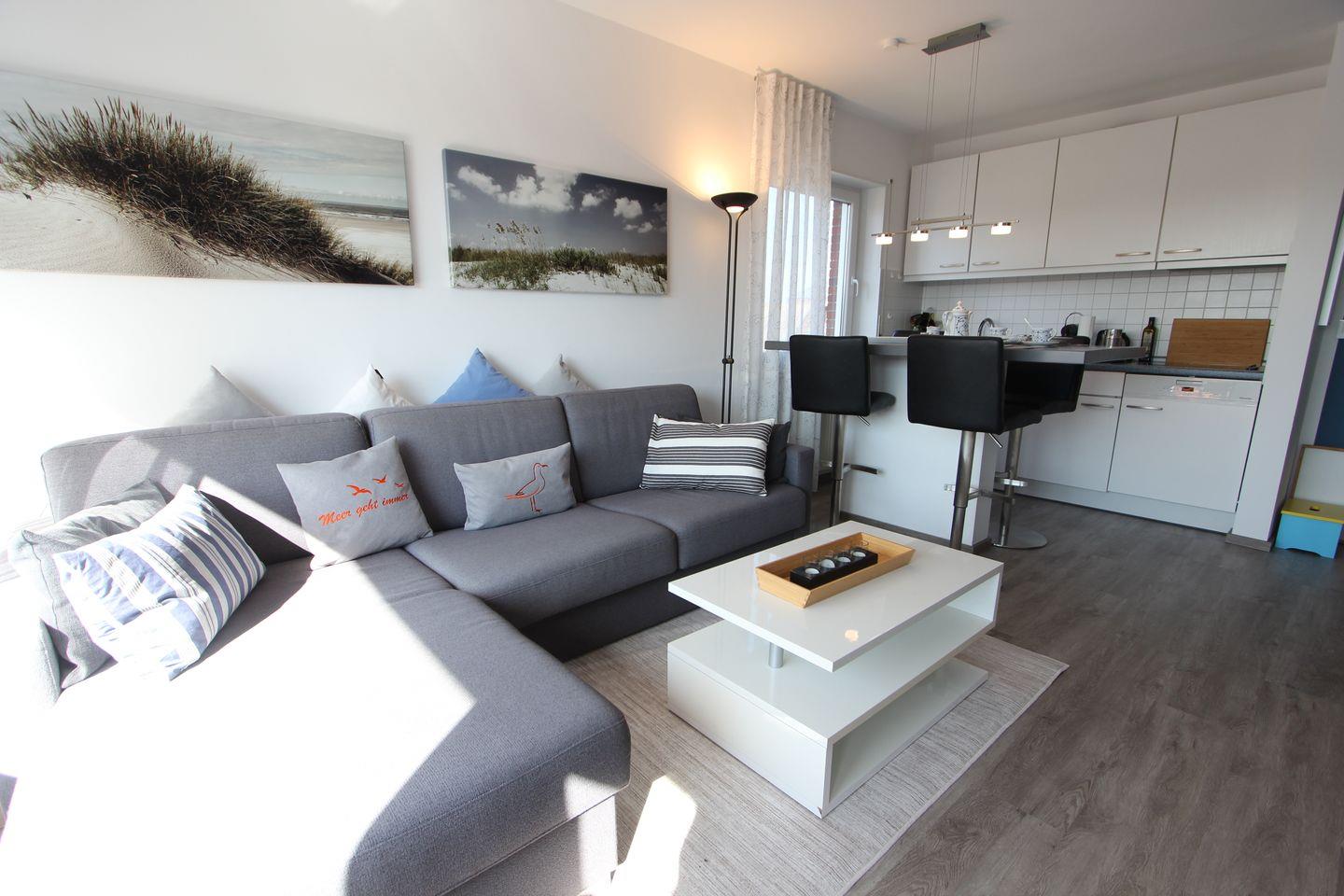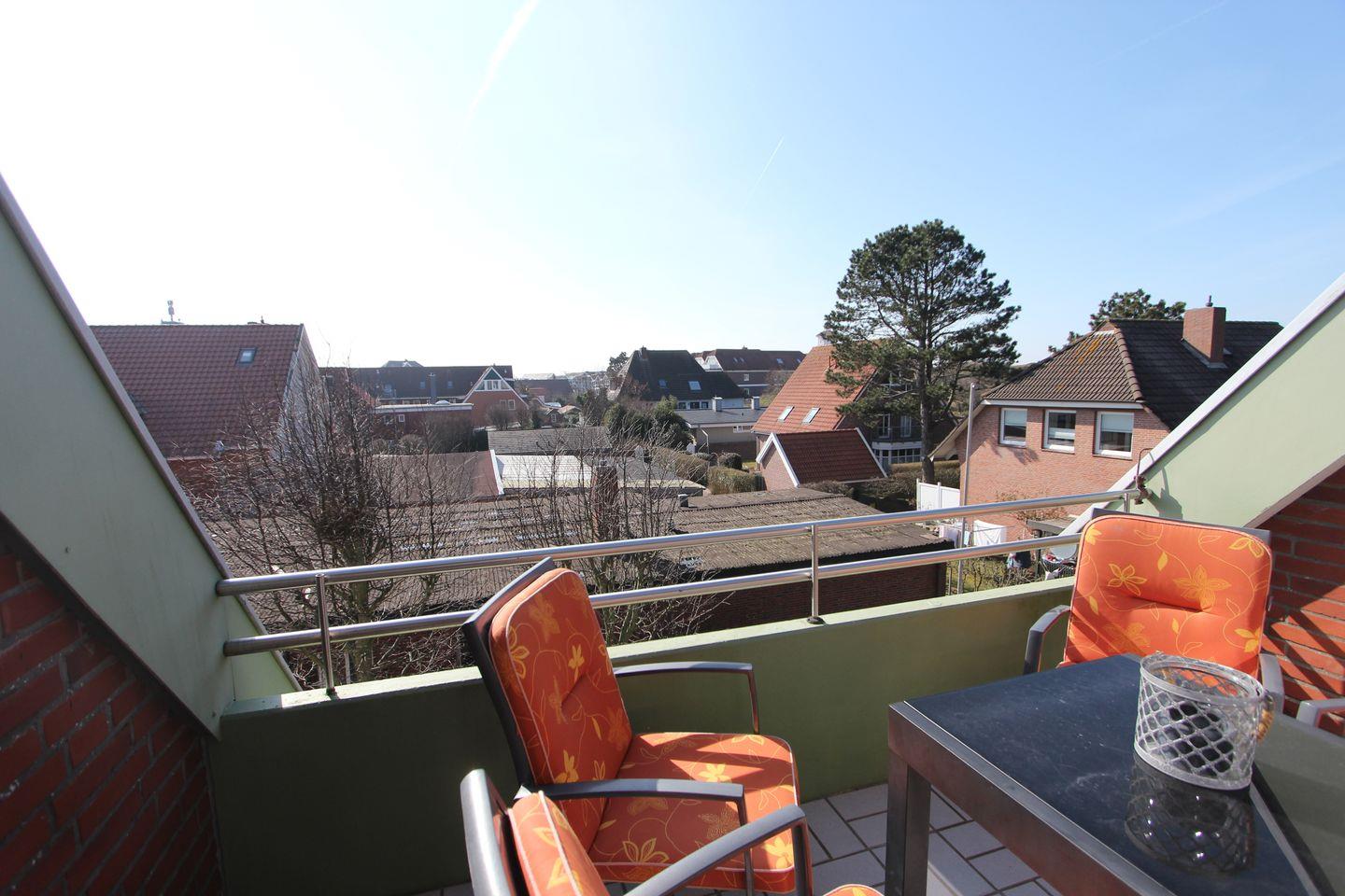 Die Wohnung liegt im 2. OG eines Mehrfamilienhauses mitten im Herzen von Langeoog. Die Wohnung bietet auf ca. 50 m² Platz für bis zu 2 Personen mit Baby. Wohnzimmer mit gemütlicher L-Couch, TV und Übergang zum Balkon. Auf dem Balkon stehen Ihnen in den warmen Monaten Möbel mit Auflagen zur Verfügung und ein toller Ausblick zum Wahrzeichen Langeoogs. Küchenzeile mit Geschirrspüler und Kochfeld. Im Schlafzimmer befindet sich ein modernes Boxspringbett mit den Maßen 180 cm x 200 cm, dort ist auch genug Platz für das Babyreisebett. Badezimmer mit Badewanne und WC.