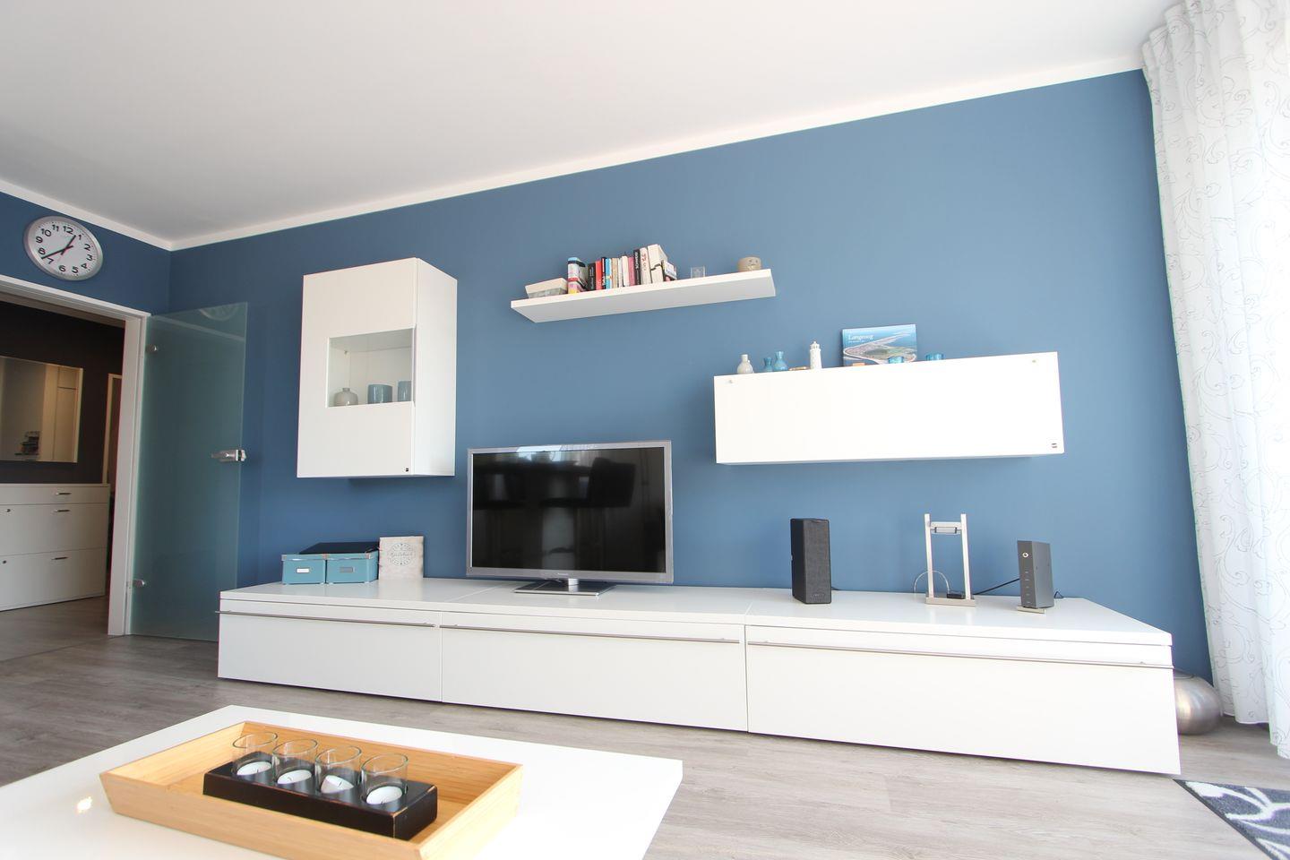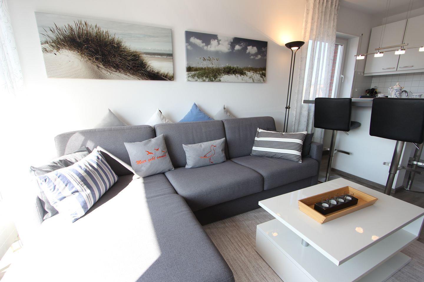 Wohnung im 2. OG, ca. 50 m², für bis zu 2 Personen mit Baby. Wohnzimmer mit gemütlicher L-Couch, TV, Übergang zum Balkon.
