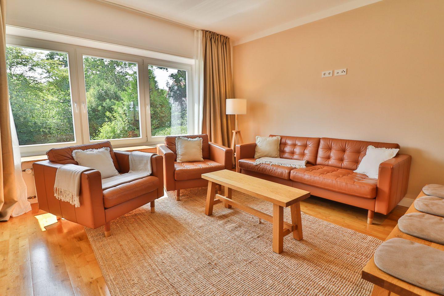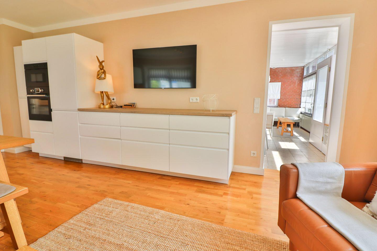 Das Wohnzimmer empfängt Sie mit einem bequemen Sofa, zwei Sesseln, einem Fernseher und einem gemütlichen Essbereich – perfekt für gemeinsame Stunden mit Familie oder Freunden. Besonderes Highlight ist der beheizbare Wintergarten, der vom Wohnzimmer aus zugänglich ist: Ein lichtdurchfluteter Rückzugsort, der selbst an kühleren Tagen zum Verweilen einlädt. Von dort aus gelangen Sie direkt in den großen, ruhigen Garten auf der Rückseite des Hauses, der mit einer Terrasse und viel Platz zum Spielen, Sonnen oder Entspannen begeistert.
