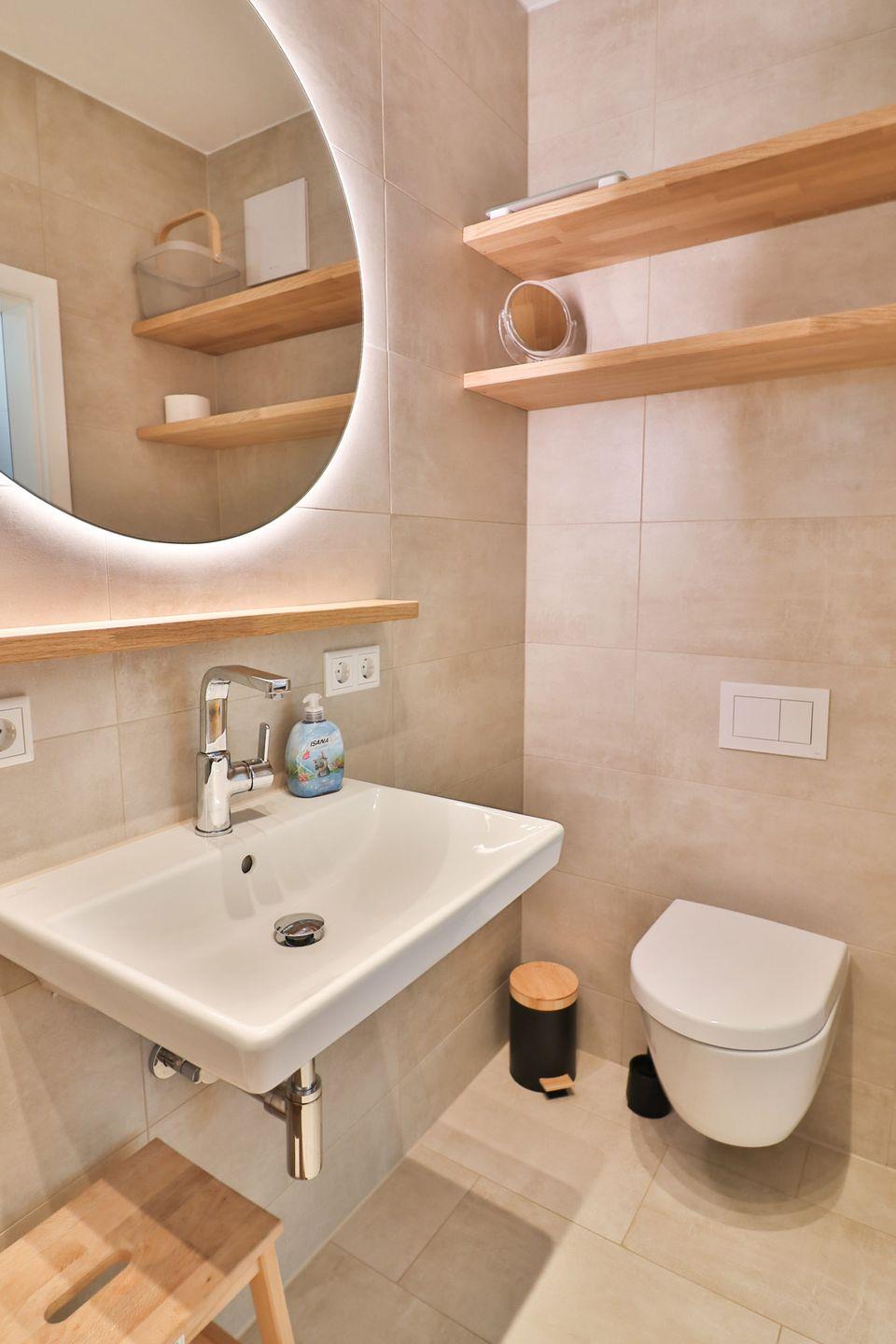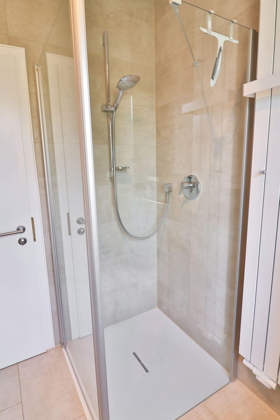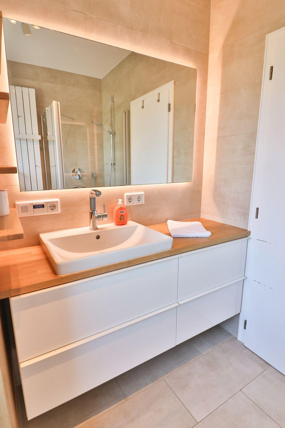 Alle drei Schlafzimmer sind mit bequemen Doppelbetten (zwei mit 180x200 cm, eines mit 160x200 cm), Kleiderschränken, Fernsehern und Vorhängen zur Verdunkelung ausgestattet. Eines der Schlafzimmer verfügt über ein eigenes Badezimmer mit bodengleicher Dusche, WC und Waschbecken – ideal für Eltern oder Gäste, die etwas mehr Privatsphäre wünschen. Ein zweites Badezimmer, ebenfalls mit Dusche und WC, ist zusätzlich mit einer Waschmaschine und einem Trockner ausgestattet, die Sie kostenfrei nutzen können.