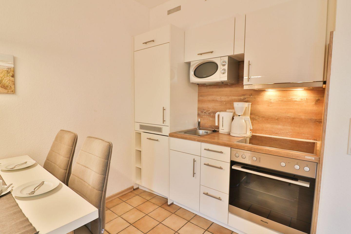 Die Küche ist offen zum Wohnzimmer gestaltet und vollständig ausgestattet: Sie finden einen 4-Platten-Ceran-Herd, Backofen, Mikrowelle, Kühlschrank mit Gefrierfach sowie eine Spülmaschine. Kaffeemaschine, Wasserkocher, Toaster und Eierkocher ergänzen die Küchenausstattung. Am Esstisch können Sie gemeinsame Mahlzeiten genießen oder in geselliger Runde ein Spiel spielen.