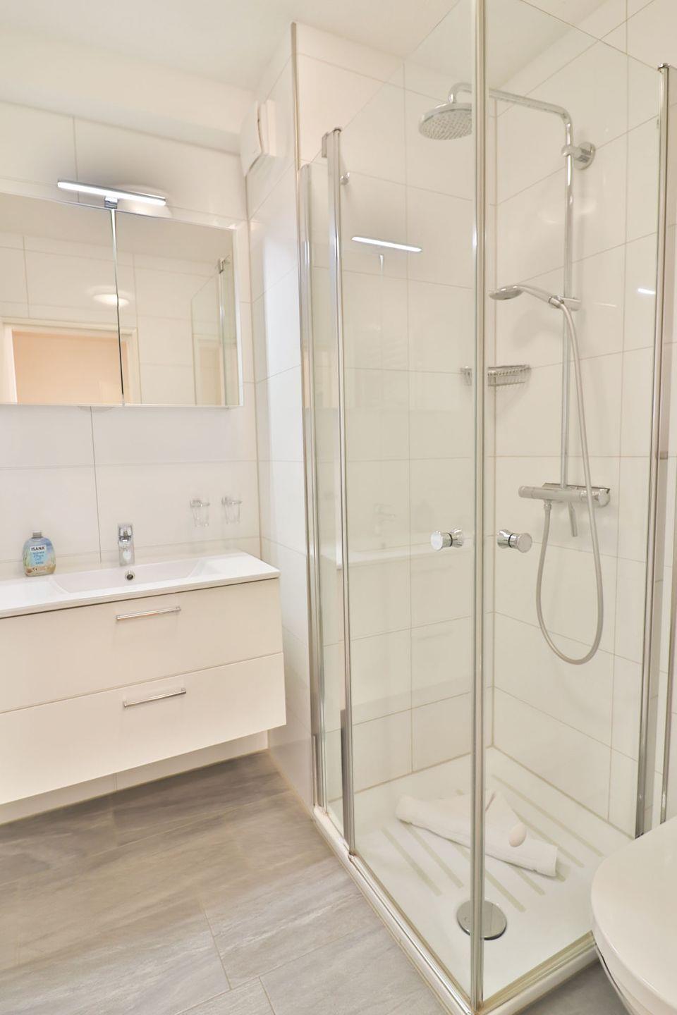 Das Badezimmer ist mit Waschbecken, WC sowie einer Dusche ausgestattet. Auch ein Haartrockner steht für Sie bereit. Ein Set Bettwäsche und Handtücher pro Person sind bereits im Preis enthalten.