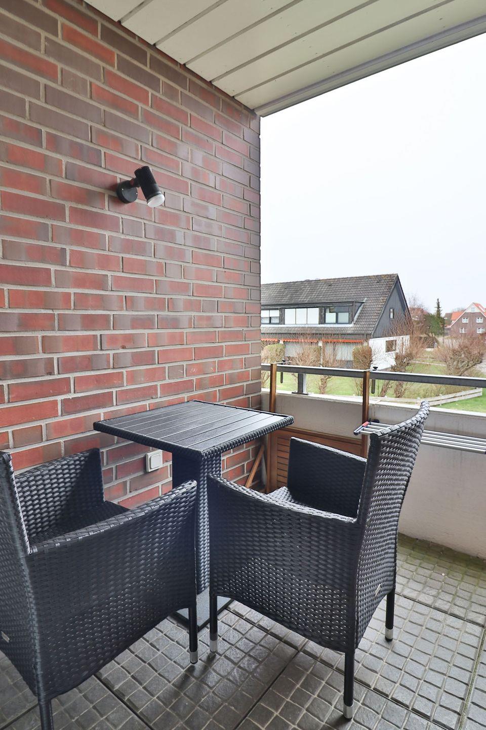 Der kleine, überdachte Balkon lädt zum Verweilen ein; auch bei schlechtem Wetter bietet er einen trockenen, geschützten Platz, um die gute Nordseeluft zu schnuppern. Für längere Aufenthalte praktisch: Waschmaschine und Trockner sind im Keller des Hauses vorhanden und werden gemeinschaftlich genutzt.
