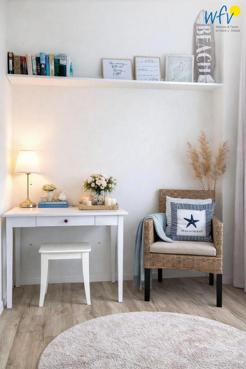Eine Wendeltreppe führt zu den zwei separaten Schlafzimmern im Obergeschoss. Beide Zimmer sind mit einem komfortablen Doppelbett ausgestattet (180 x 200 cm) und Kleiderschränken für die Urlaubsgarderobe. Von einem Raum aus haben Sie einen traumhaften Blick in die Langeooger Dünenwelt, ebenso von dem angrenzenden möblierten Ost-Balkon - sogar das Meer hören Sie hier rauschen! Das andere Schlafzimmer liegt zur Gartenseite hin und verspricht ebenfalls eine angenehme Nachtruhe. Hier befindet sich neben dem Doppelbett ein eingebautes Kinderbett (160 x 80 cm) und ein kleiner Schreibtisch. Die Couch im Wohnzimmer kann zu einem komfortablen kleinen Doppelbett umfunktioniert werden und bietet eine weitere Schlafmöglichkeit (160 x 200 cm).