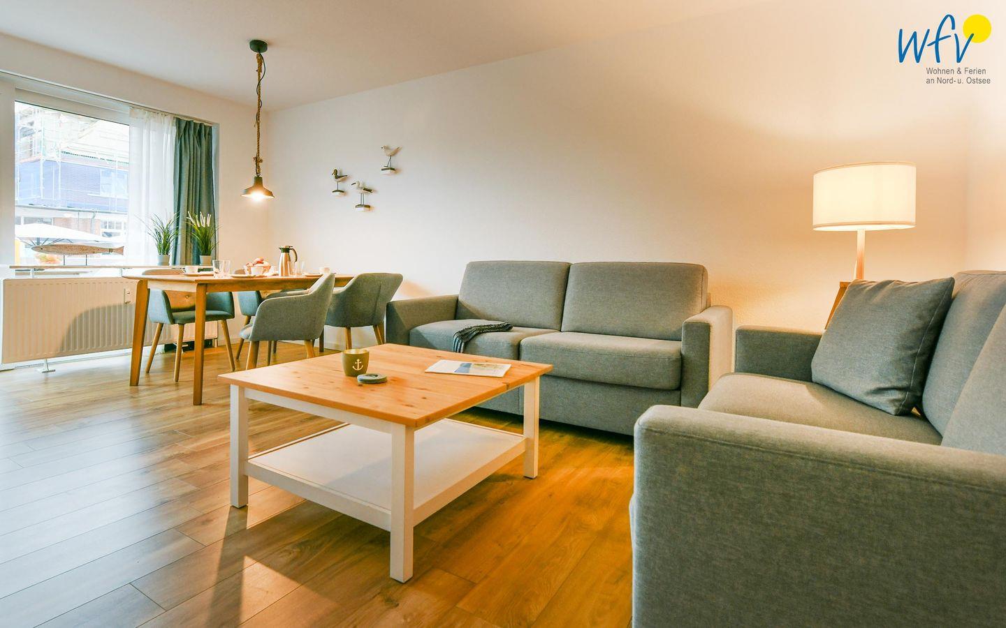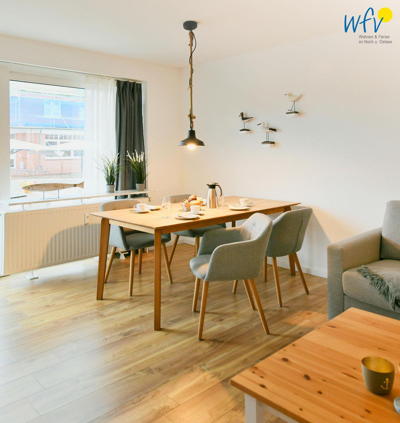 Es empfängt Sie ein geräumiger Flur mit Garderobe, der in ein helles Wohnzimmer mit Sofaecke und Essbereich führt. Hier können Sie nach dem Strandtag oder der Fahrradtour ruhige Stunden verbringen - fernsehen und lesen oder beisammen sitzen, klönen und gemeinsame Mahlzeiten genießen.