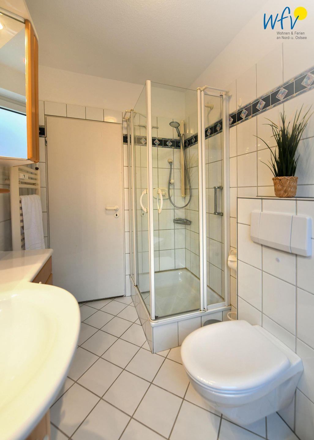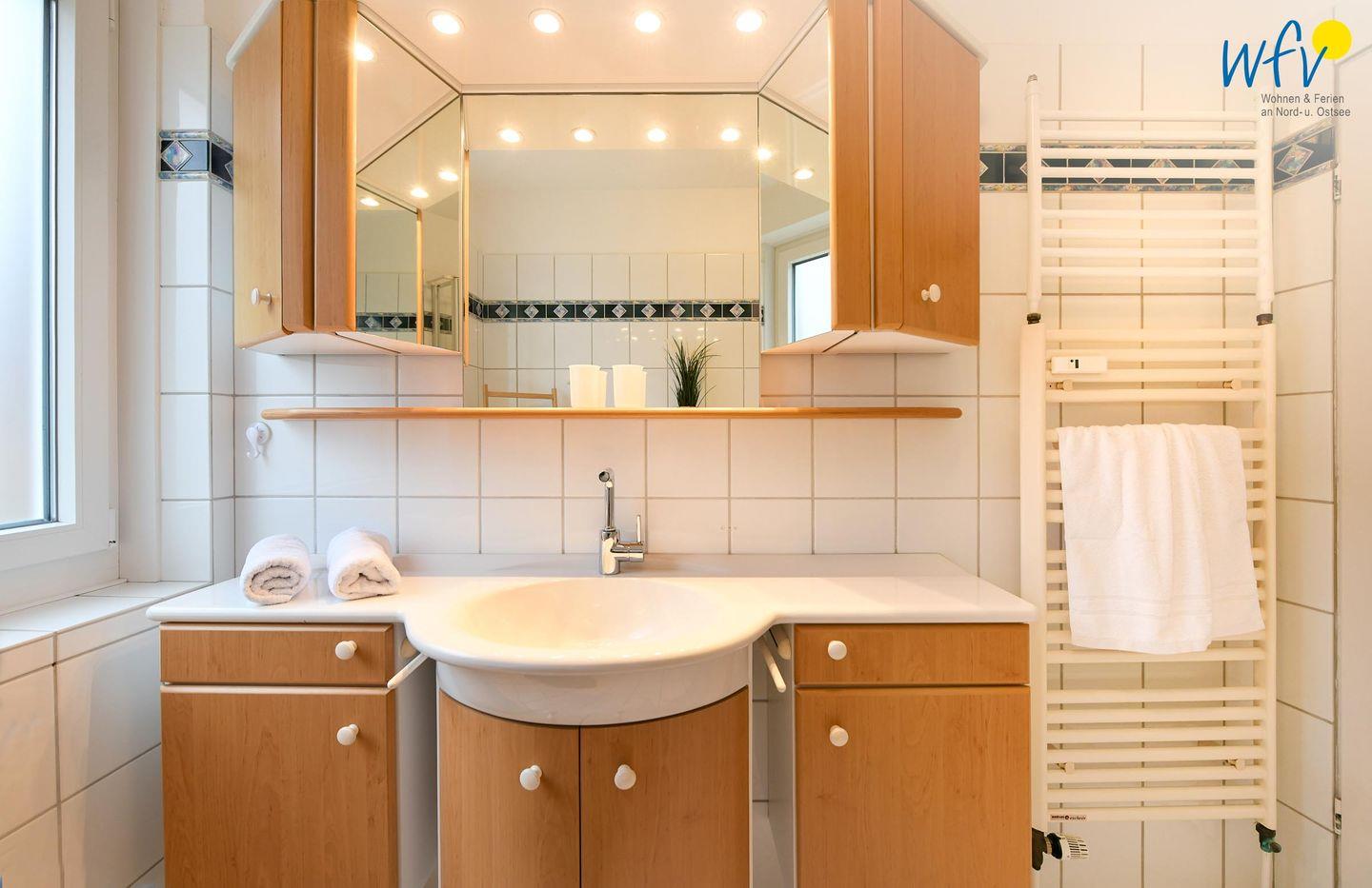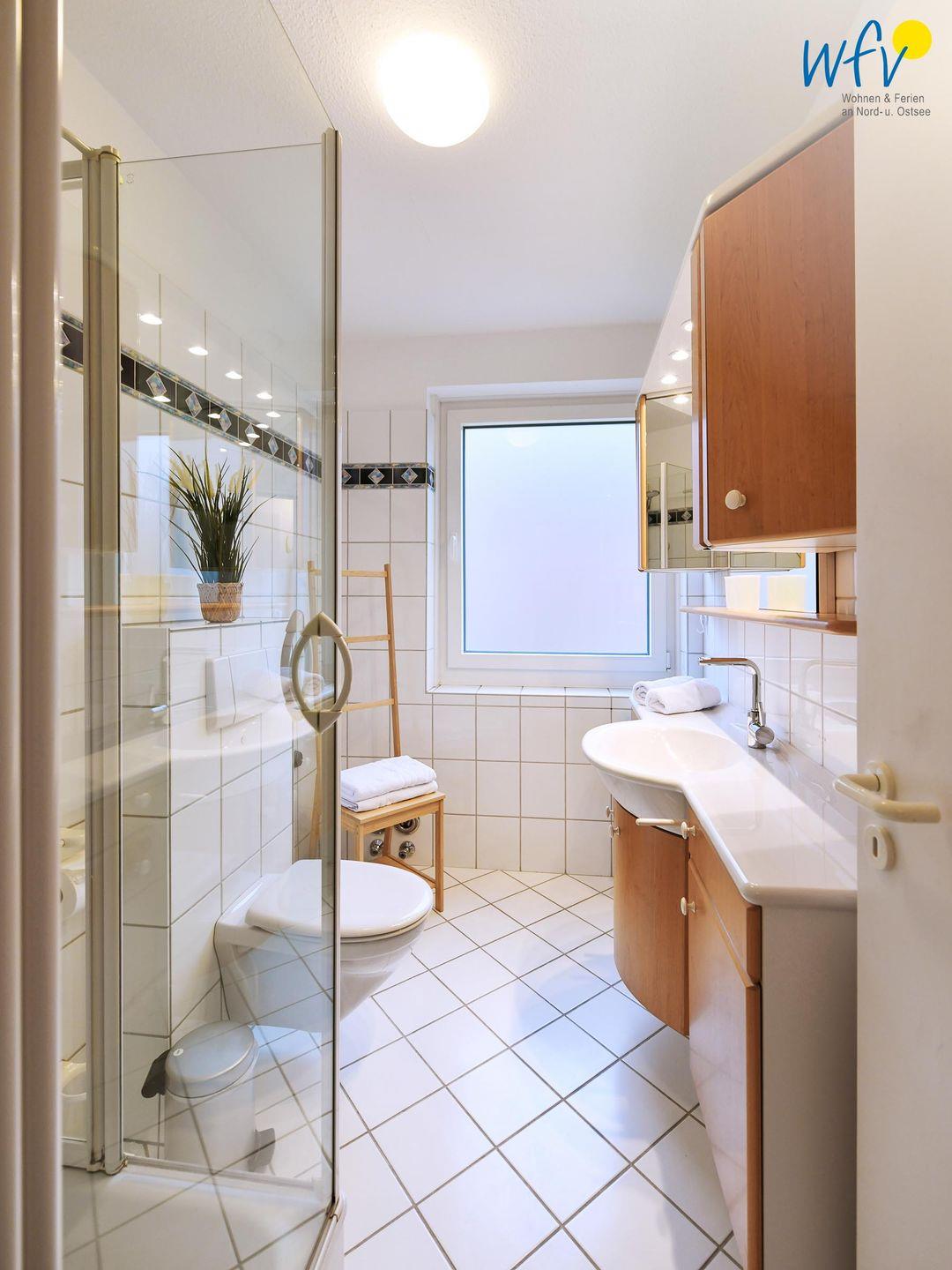 Das moderne Tageslichtbad mit Dusche, WC, Waschtisch und Spiegelschrank sowie Föhn und Kosmetikspiegel bietet weiteren Wohnkomfort.