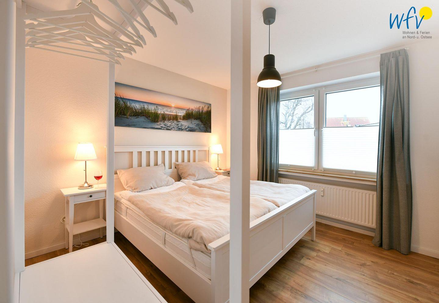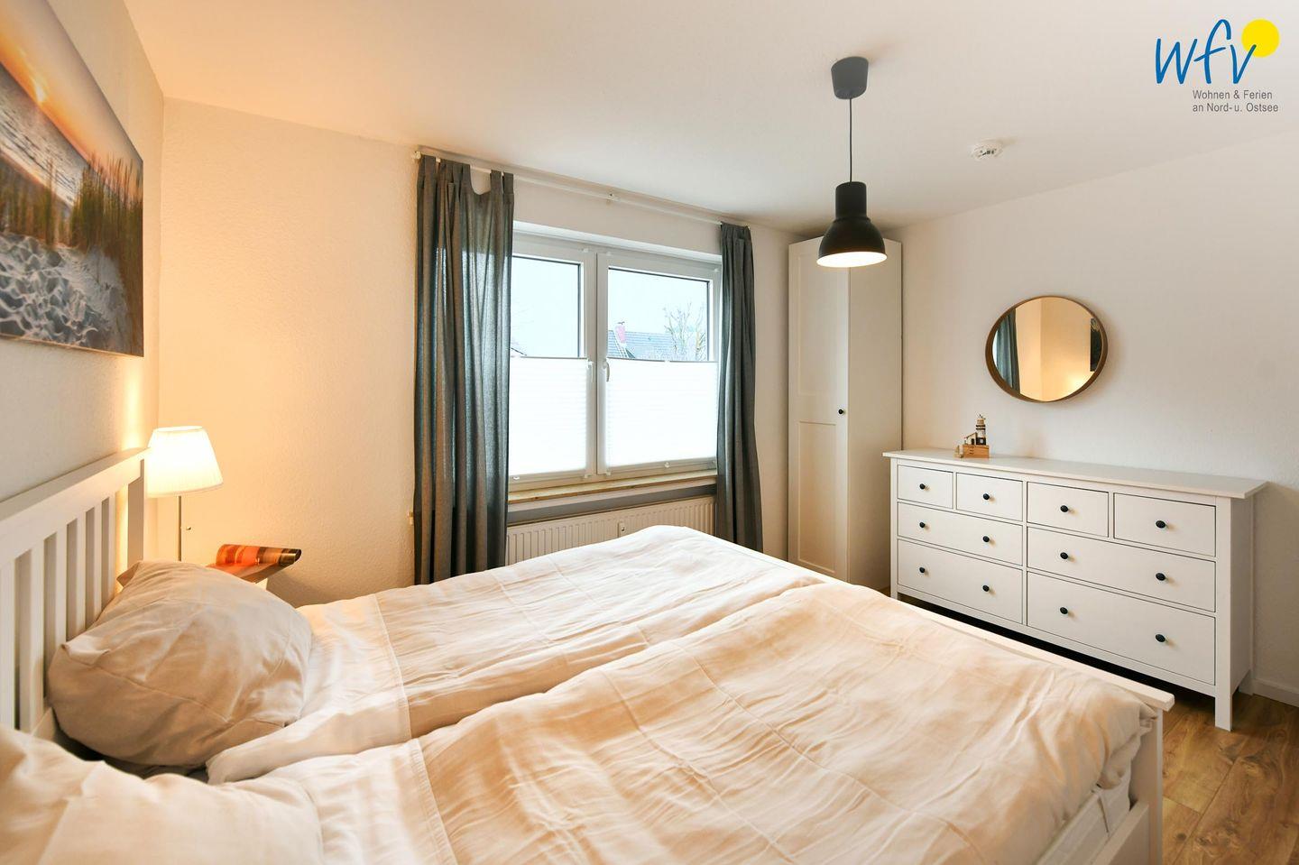 Das freundlich eingerichtete separate Schlafzimmer mit schönem Gartenblick bietet einen ruhigen Rückzugsort. Ausgestattet ist es mit einem komfortablem Doppelbett (180 x 200 cm). Die Couch im Wohnraum lässt sich schnell und einfach zu einem Bett umfunktionieren und bietet Schlafmöglichkeiten für eine weitere Person.
