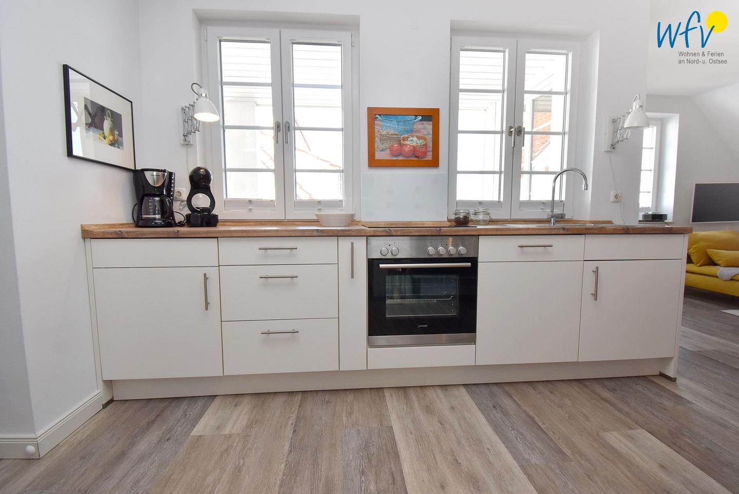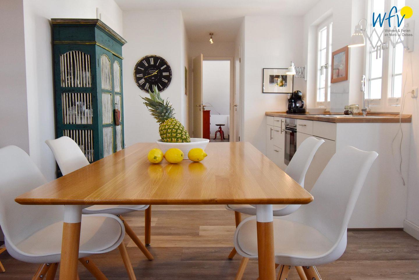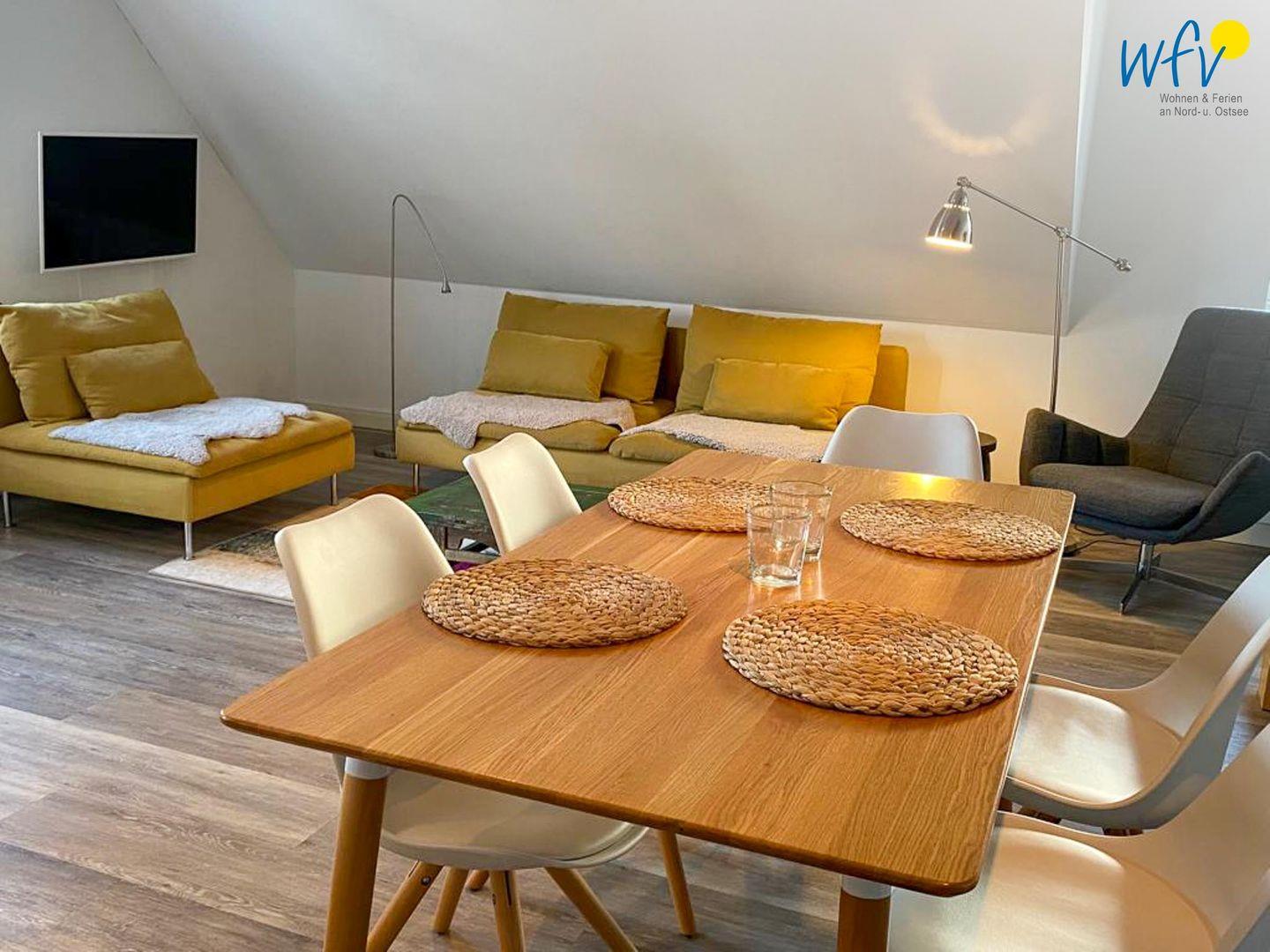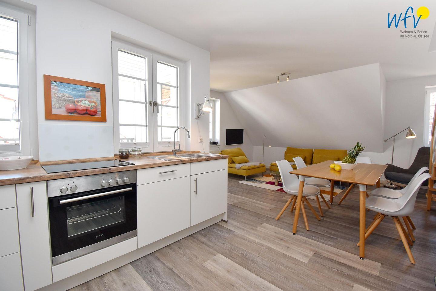 Der helle und offene Wohnraum bietet mit einem Ensemble aus Couchecke mit modernem Flachbildfernseher (Kabel-TV), großem Esstisch und moderner Küche Platz für gemeinsame Stunden. Die integrierte Einbauküche lässt Sie im Urlaub zu Gourmets werden - ausgestattet ist sie u.a. mit Ceranherd, Backofen, Kühlschrank mit Tiefkühlfach und Geschirrspüler. Als Kaffeeliebhaber wählen Sie zwischen einer klassischen Filterkaffeemaschine und einer Espressomaschine (Kapseln kostenlos). Vom Wohnbereich aus gelangen Sie auf die möblierte Loggia, auf der Sie bei klarer Meeresluft wunderbar entspannen können. Da sie überdacht und windgeschützt ist, sind auch an kühleren oder leicht regnerischen Tagen gemütliche Stunden im Freien möglich.