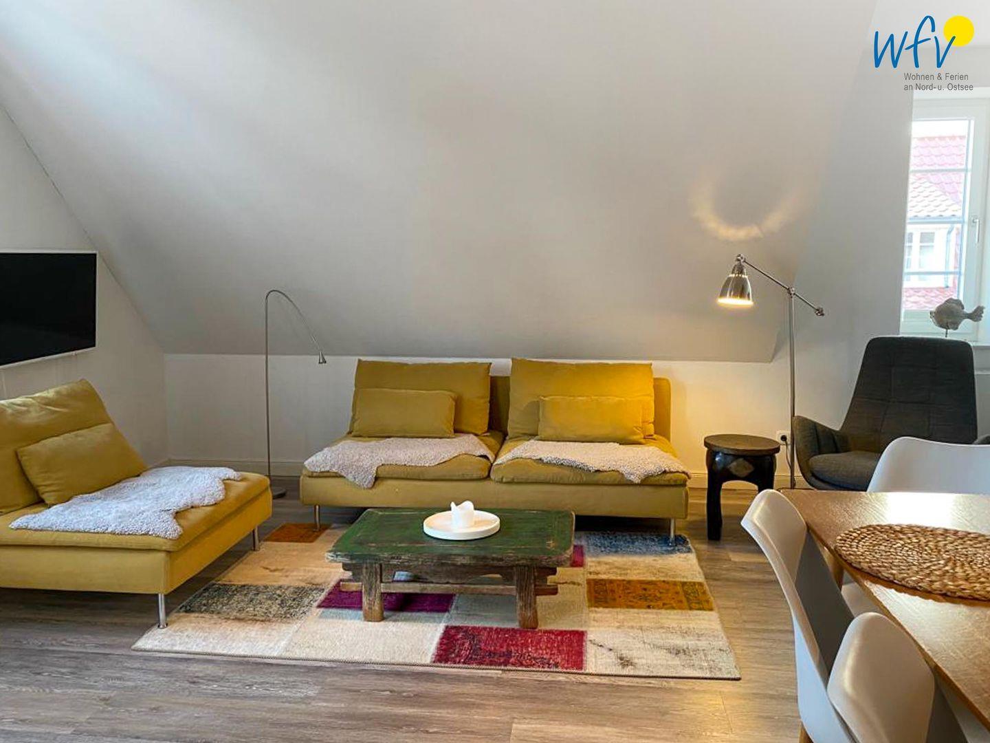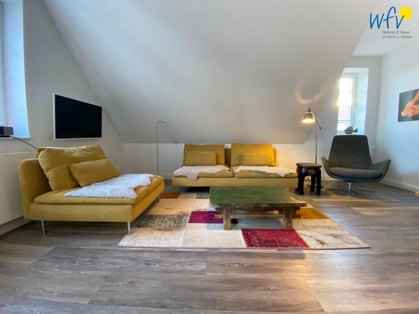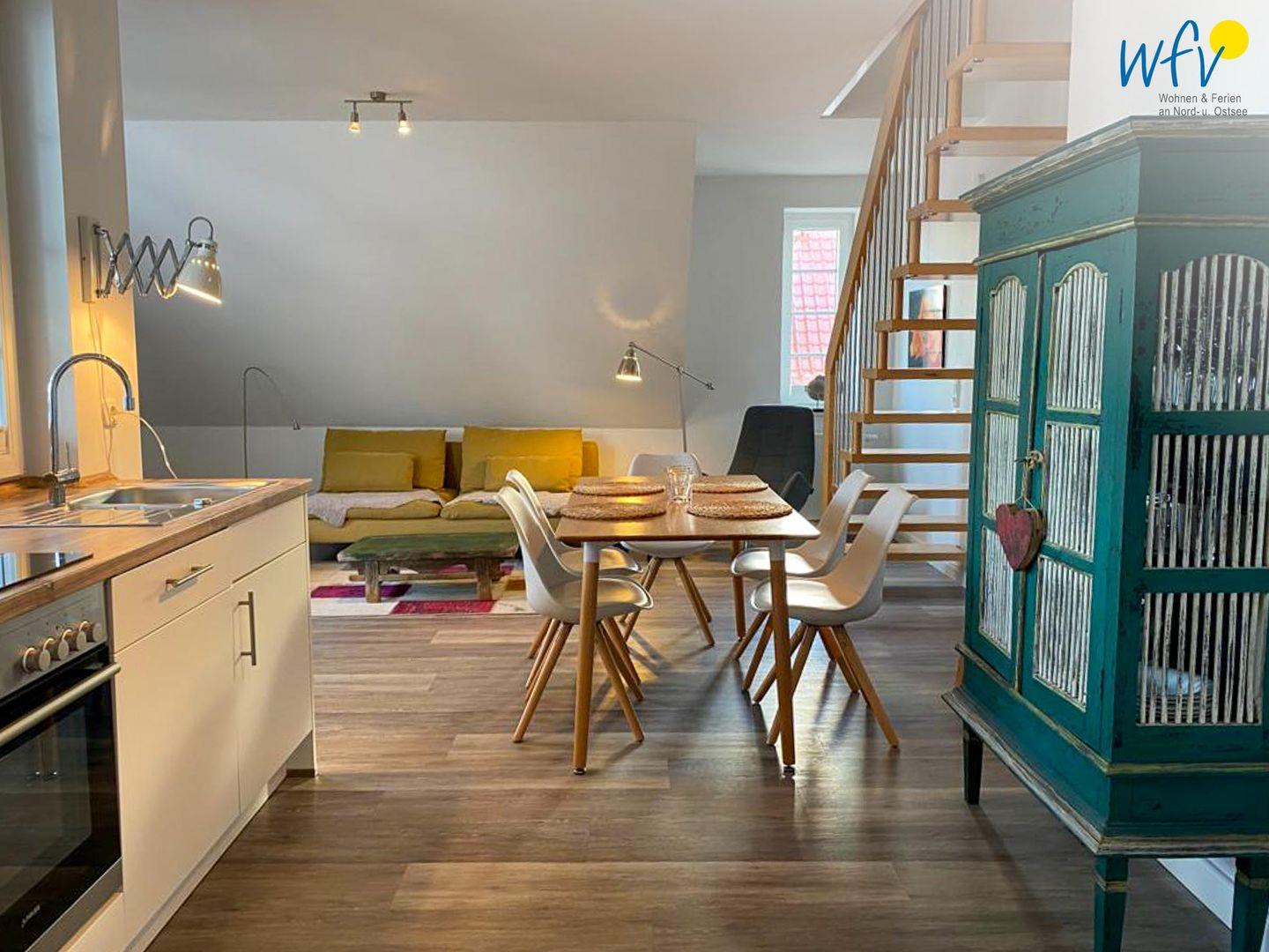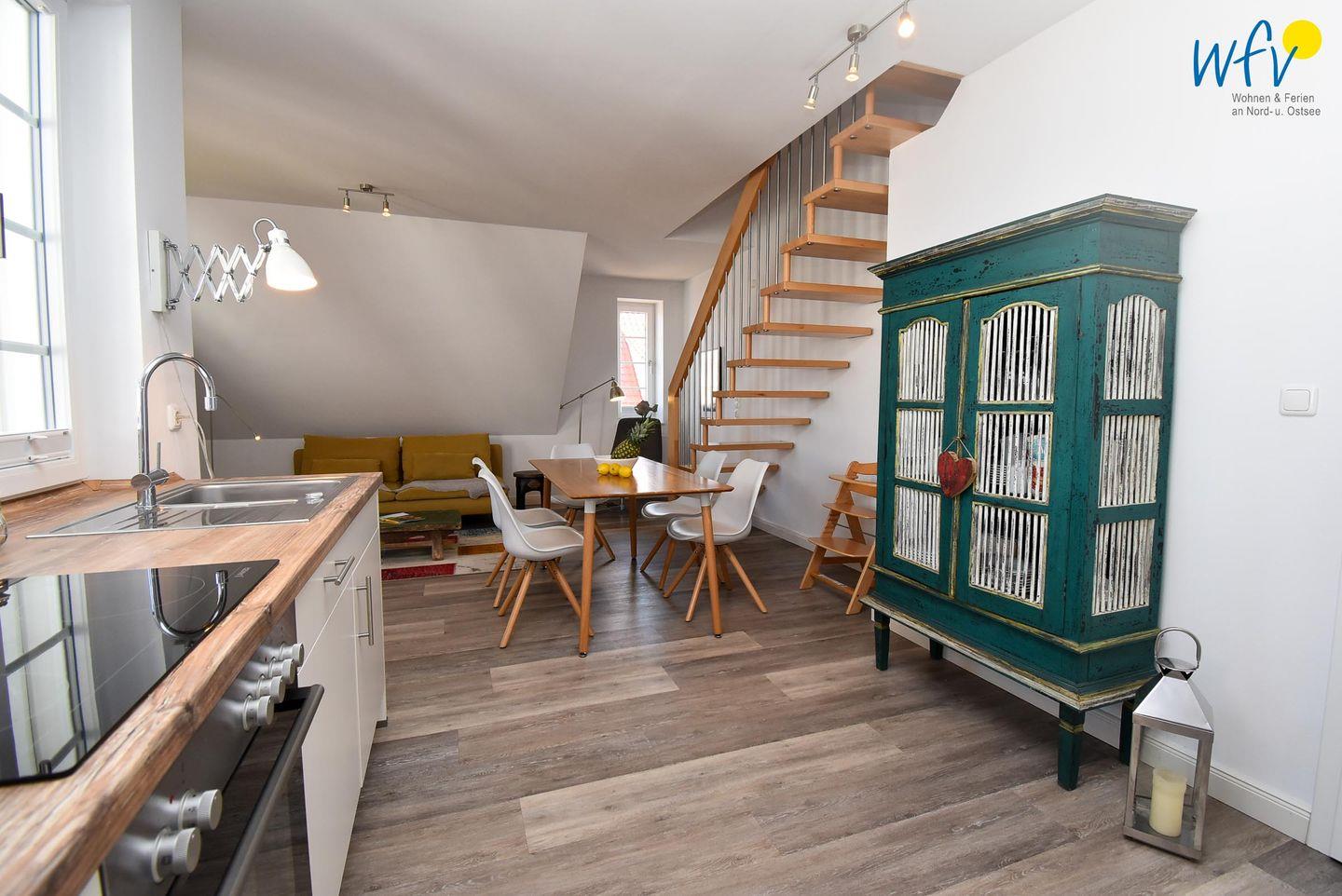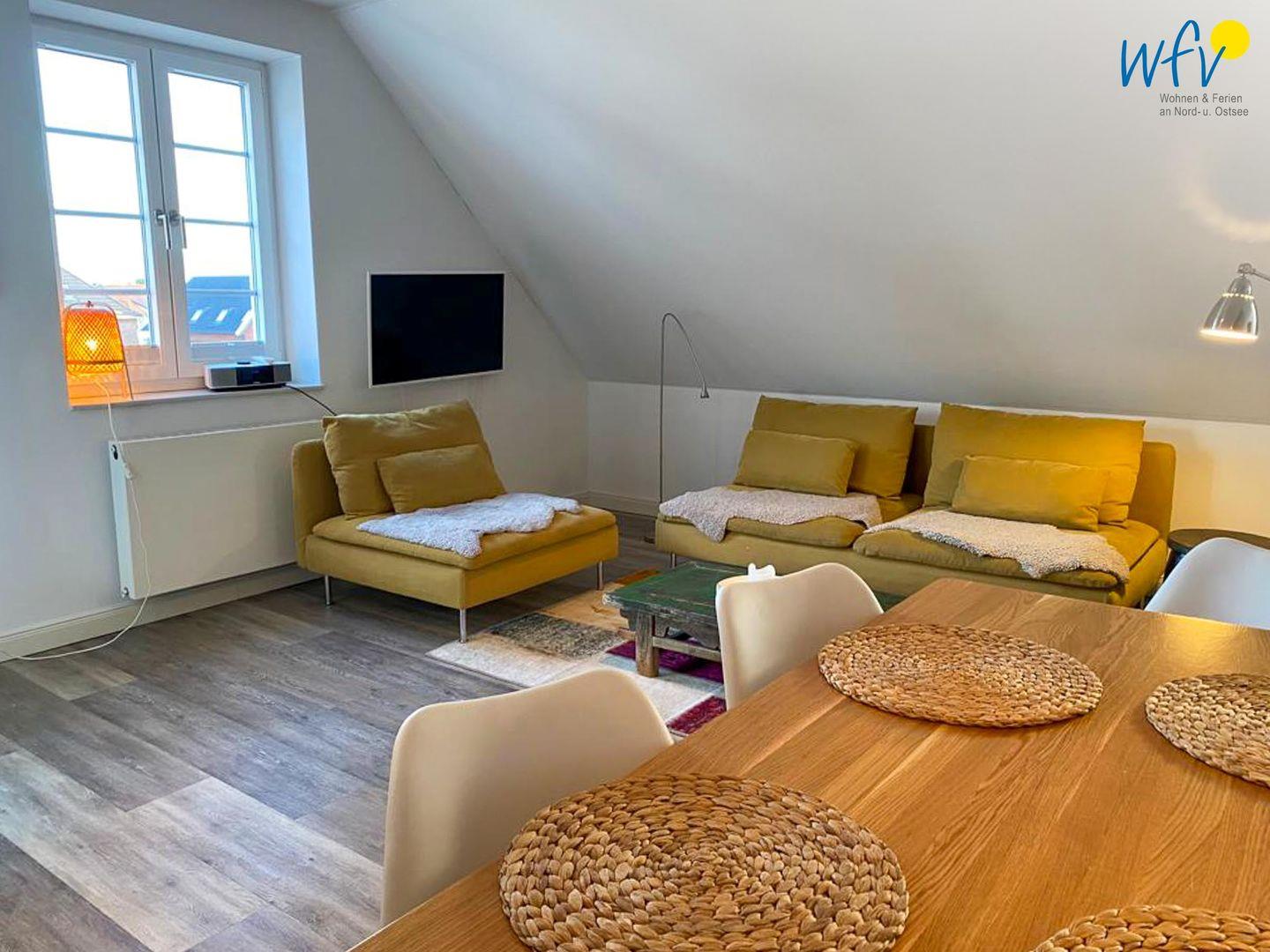 Der helle und offene Wohnraum bietet mit einem Ensemble aus Couchecke mit modernem Flachbildfernseher (Kabel-TV), großem Esstisch und moderner Küche Platz für gemeinsame Stunden. Die integrierte Einbauküche lässt Sie im Urlaub zu Gourmets werden - ausgestattet ist sie u.a. mit Ceranherd, Backofen, Kühlschrank mit Tiefkühlfach und Geschirrspüler. Als Kaffeeliebhaber wählen Sie zwischen einer klassischen Filterkaffeemaschine und einer Espressomaschine (Kapseln kostenlos). Vom Wohnbereich aus gelangen Sie auf die möblierte Loggia, auf der Sie bei klarer Meeresluft wunderbar entspannen können. Da sie überdacht und windgeschützt ist, sind auch an kühleren oder leicht regnerischen Tagen gemütliche Stunden im Freien möglich.