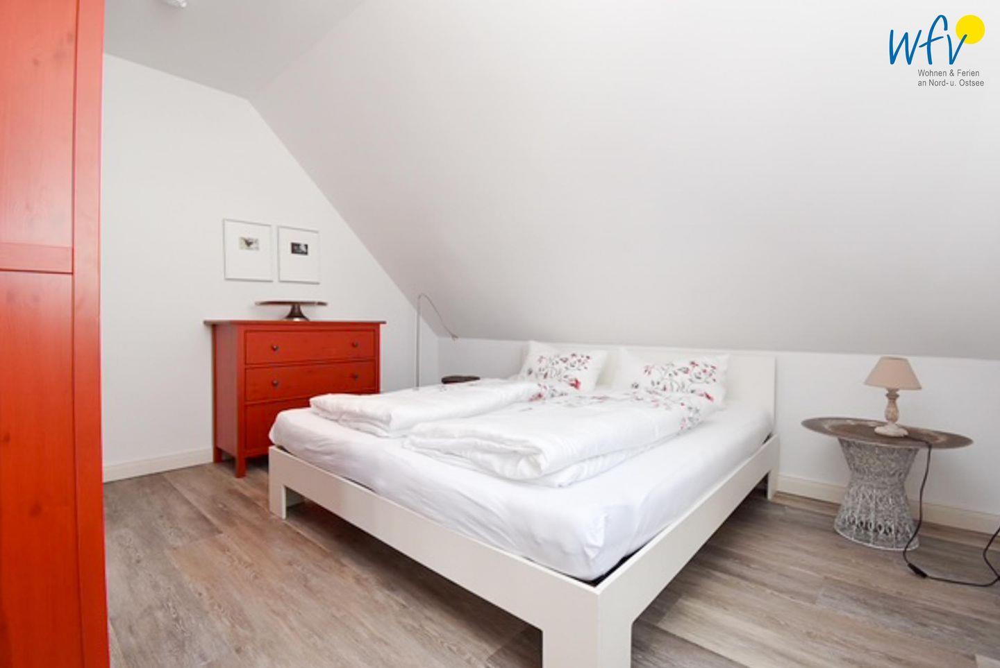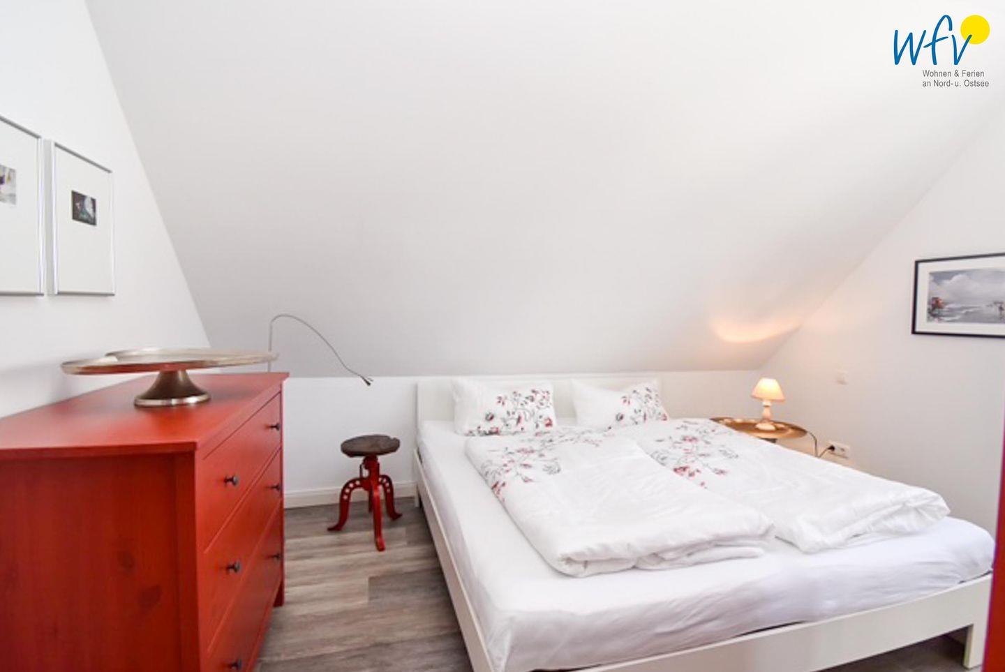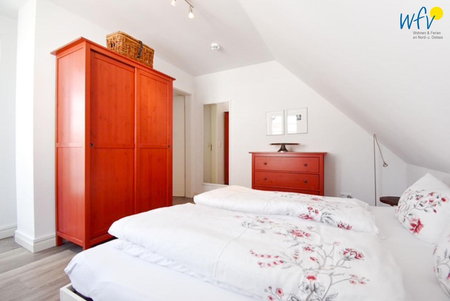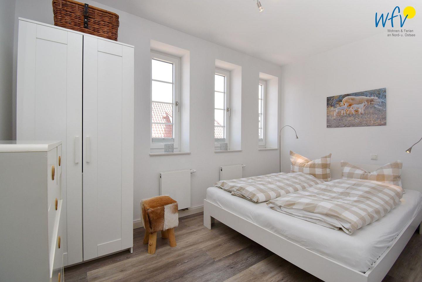 Zwei separate Schlafzimmern bieten angenehme Rückzugsorte und versprechen eine erholsame Nachtruhe. Beide Zimmer sind mit einem Doppelbett (180 x 200 cm bzw. 160 x 200 cm) und einem Kleiderschrank eingerichtet.