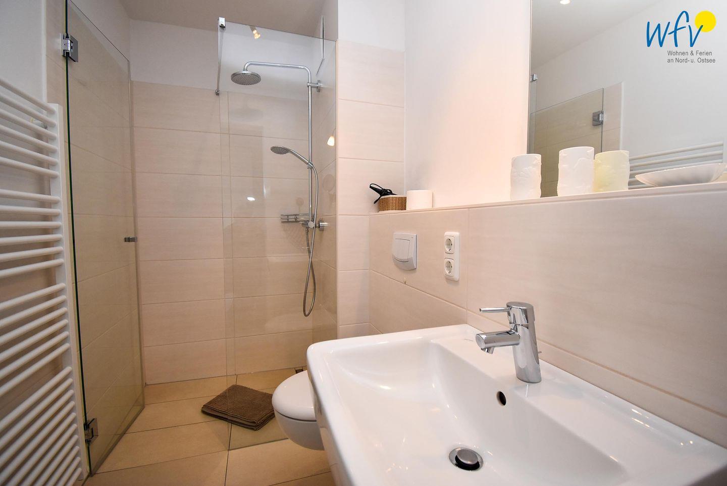 Das elegante Badezimmer sorgt für weiteren Wohnkomfort, u.a. mit bodengleicher Dusche, WC, Waschbecken und Handtuchheizkörper sowie Föhn und Kosmetikspiegel.