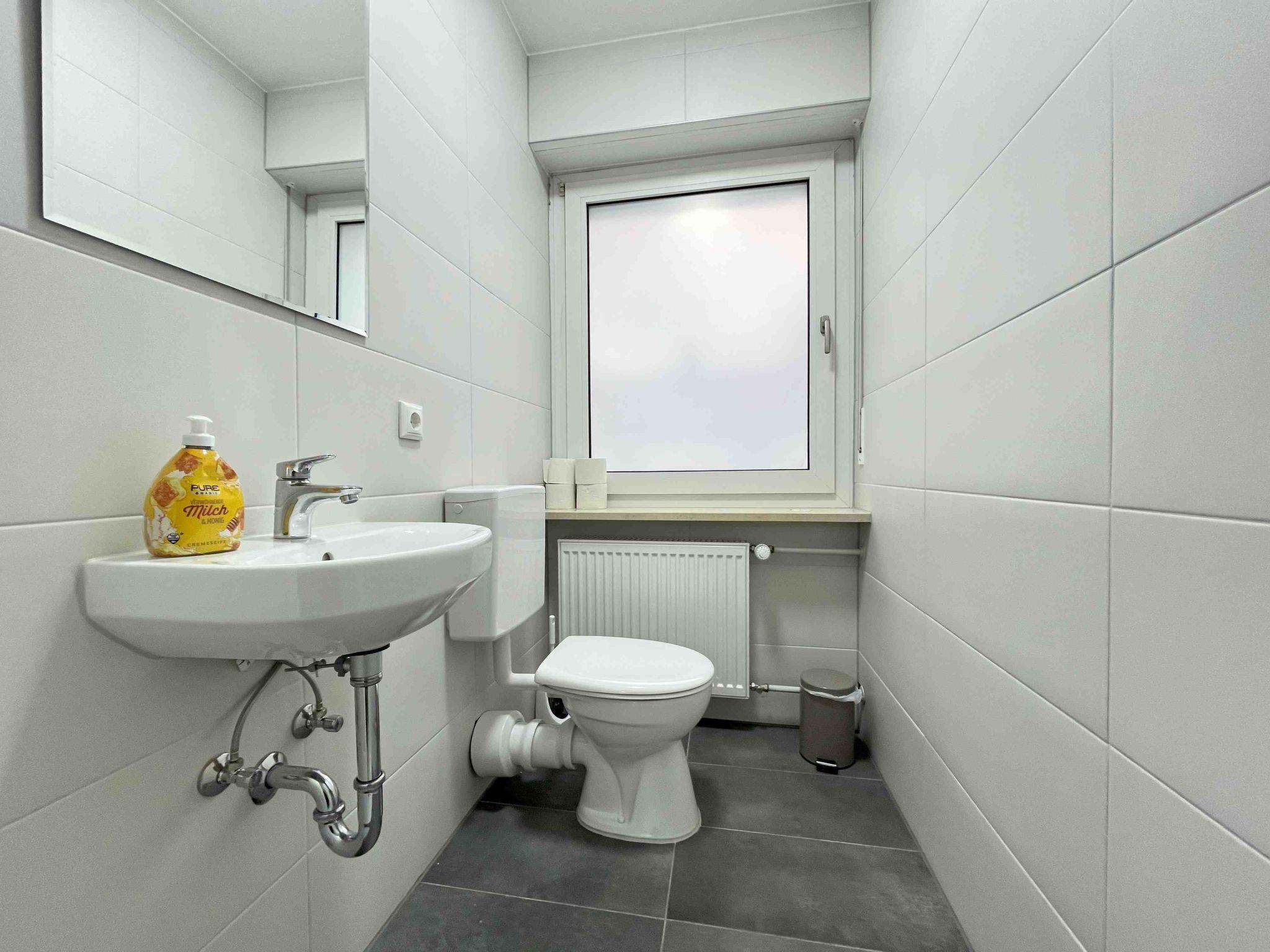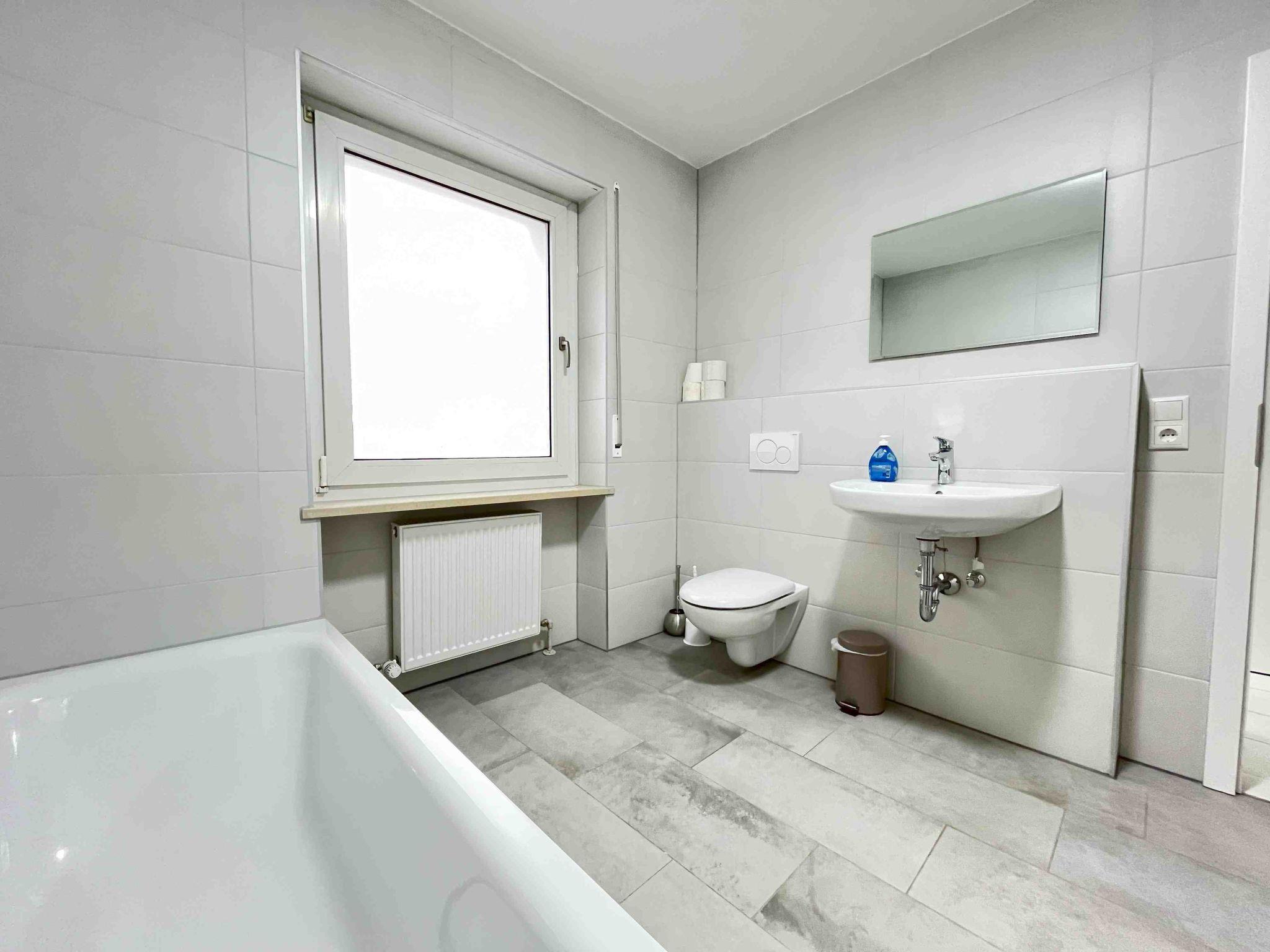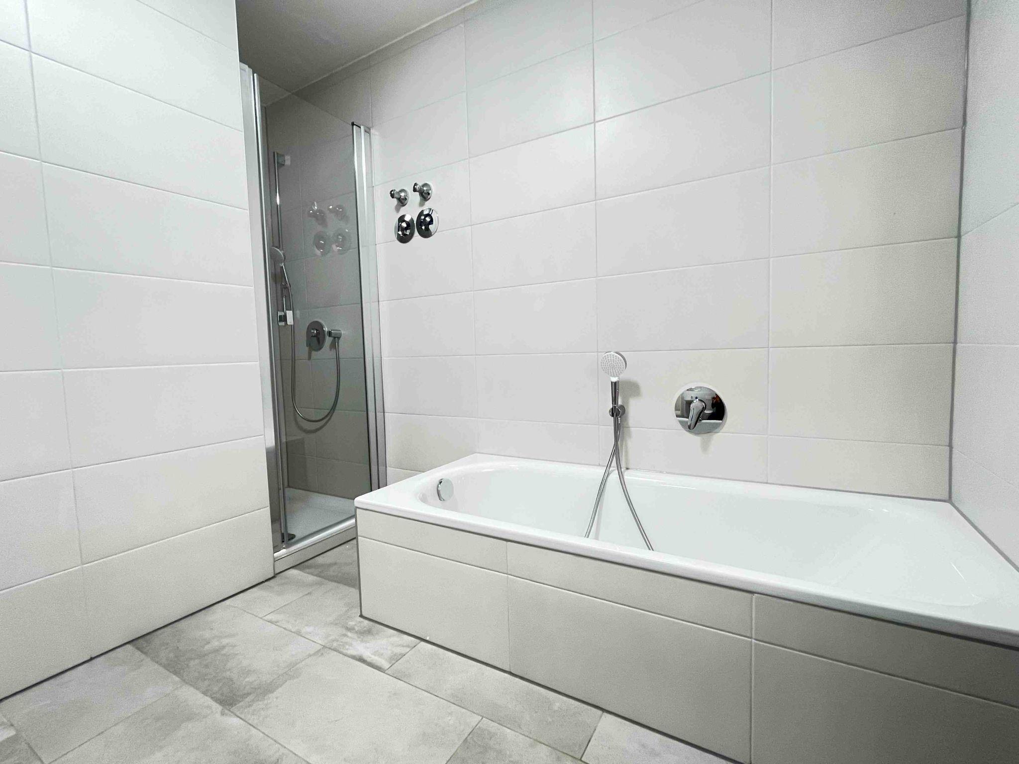 The bathroom consists of a WC, a washbasin, a shower and a bathtub. An additional WC is available.