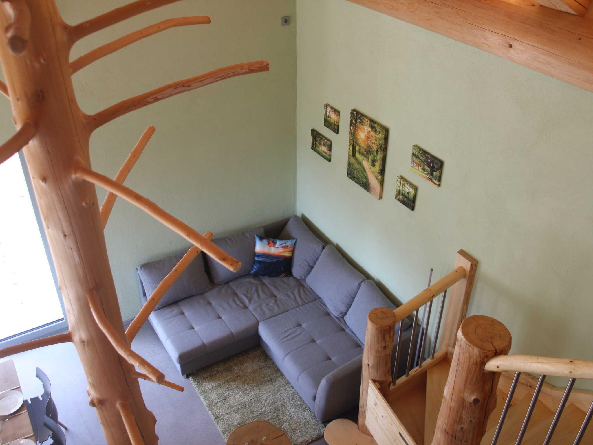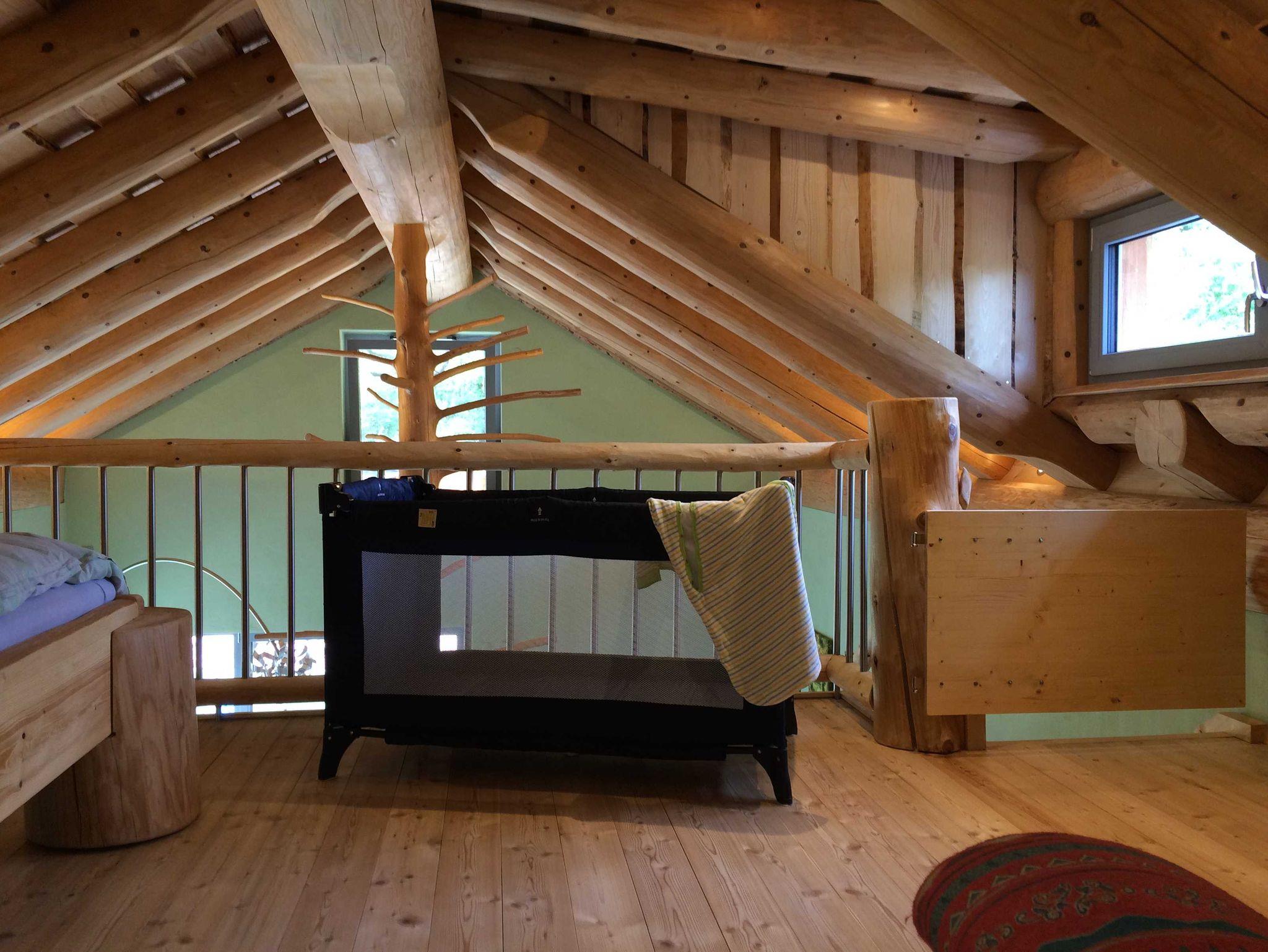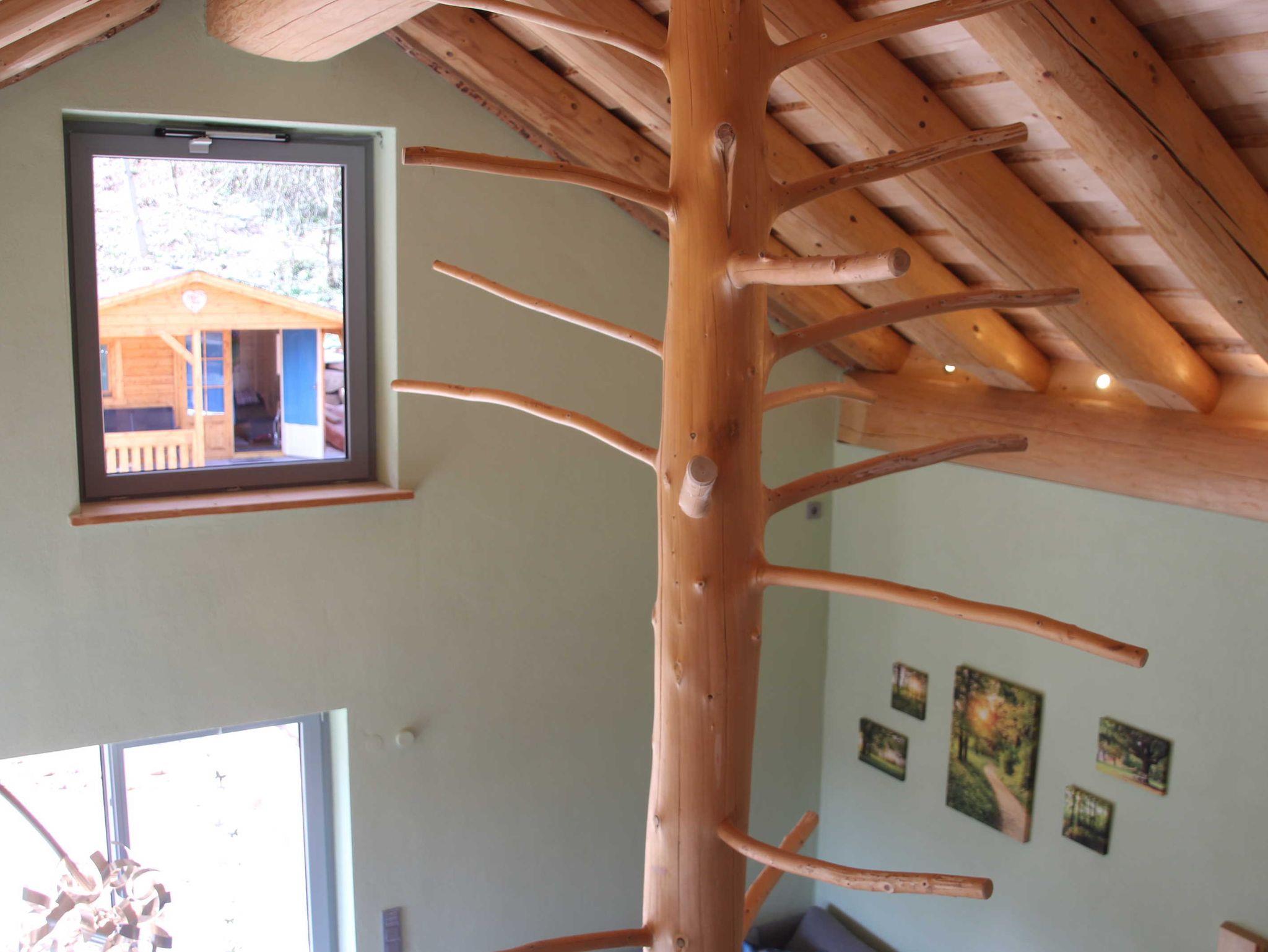 Die urige Außenansicht der großen Tannenstämme und der Lärchenverschalung gibt der Holzhauszeit einen Hüttencharakter. Innen setzt sich dieser mit einem offenen Dachstuhl mit Schwadenbrettern fort. Der zentral in der Mitte des Raumes stehende Stamm mit Ästen vermittelt den Eindruck einer Forsthütte. Die offene Galerie mit Fenster zum Wald ist ein bevorzugter Platz zum Lesen und Entspannen, oder einfach nur Musikhören.