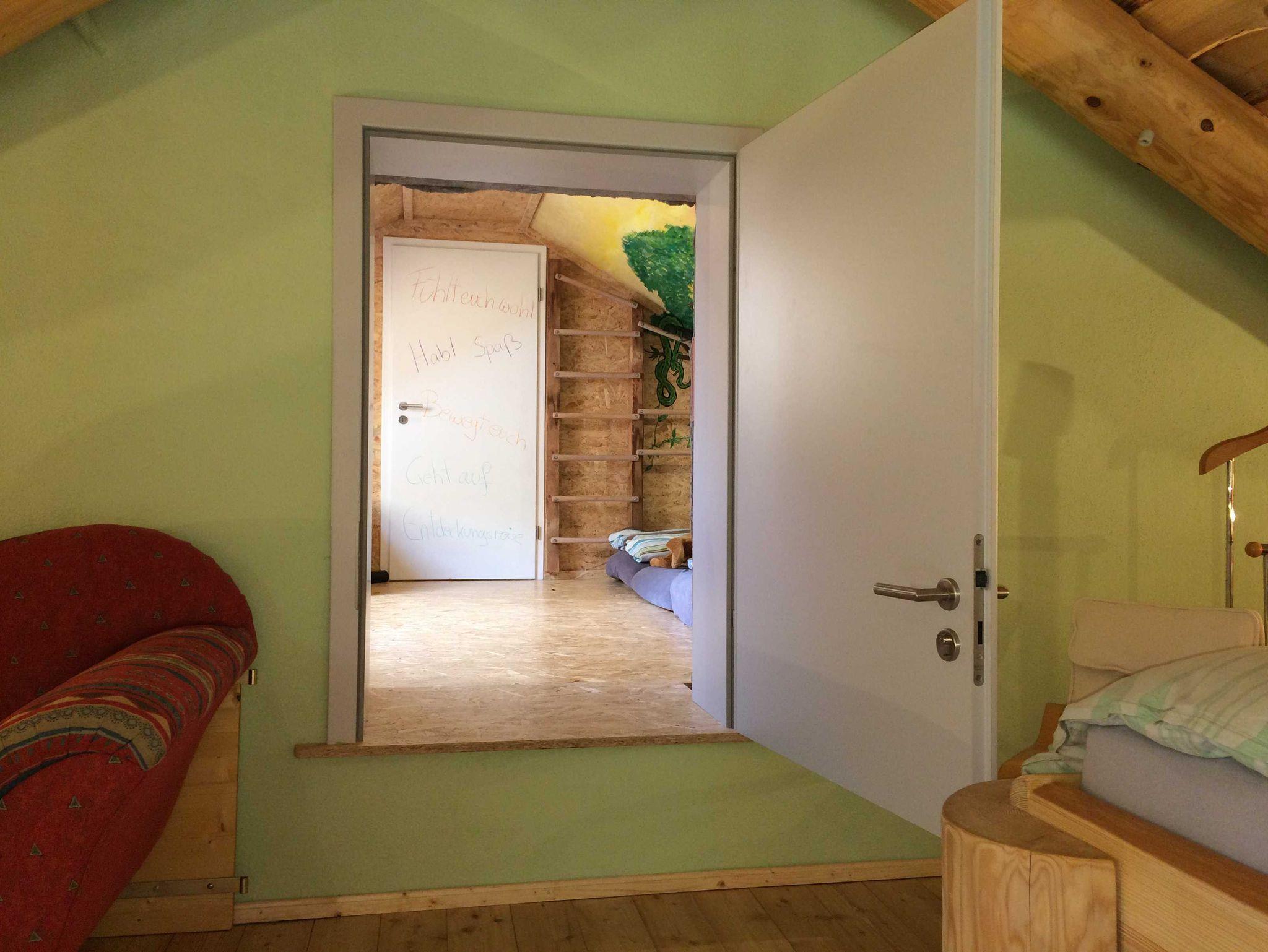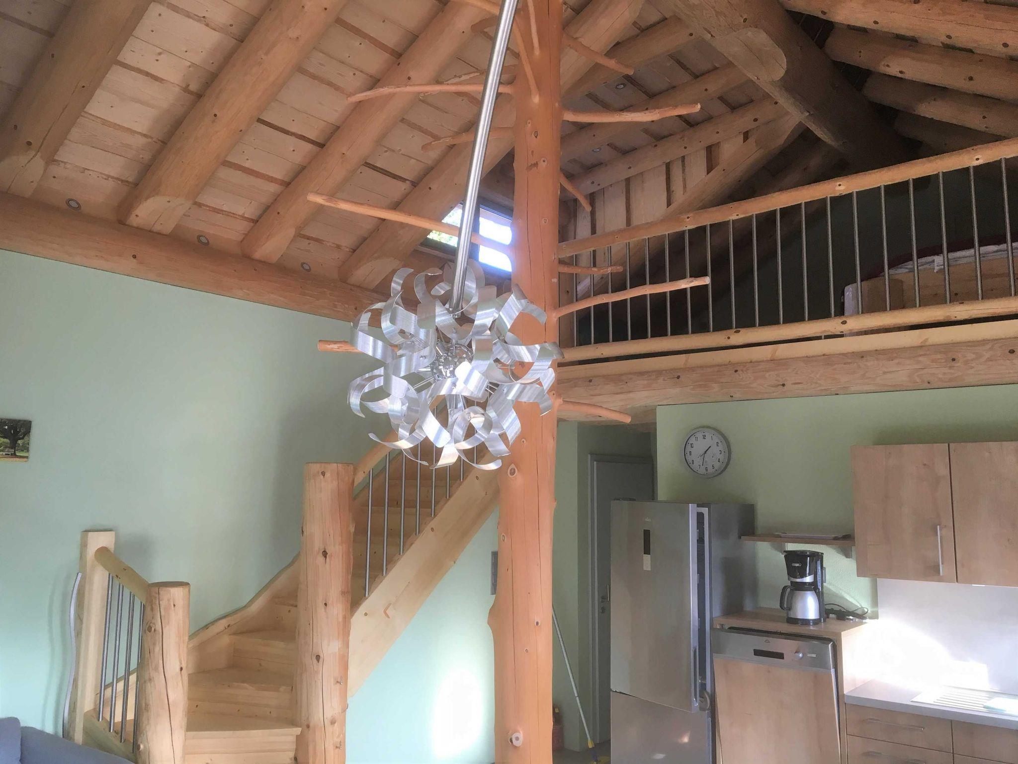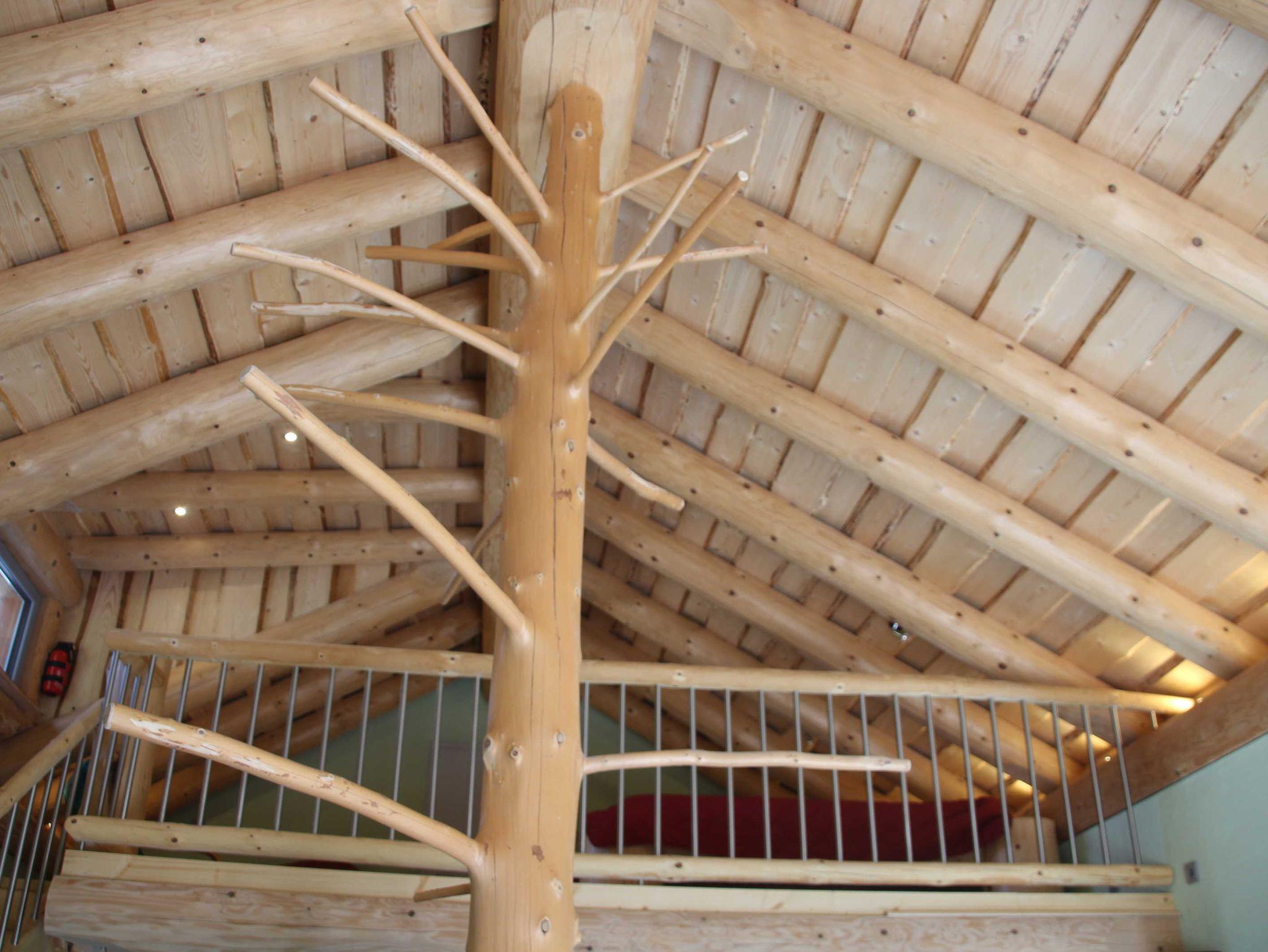 Die urige Außenansicht der großen Tannenstämme und der Lärchenverschalung gibt der Holzhauszeit einen Hüttencharakter. Innen setzt sich dieser mit einem offenen Dachstuhl mit Schwadenbrettern fort. Der zentral in der Mitte des Raumes stehende Stamm mit Ästen vermittelt den Eindruck einer Forsthütte. Die offene Galerie mit Fenster zum Wald ist ein bevorzugter Platz zum Lesen und Entspannen, oder einfach nur Musikhören.