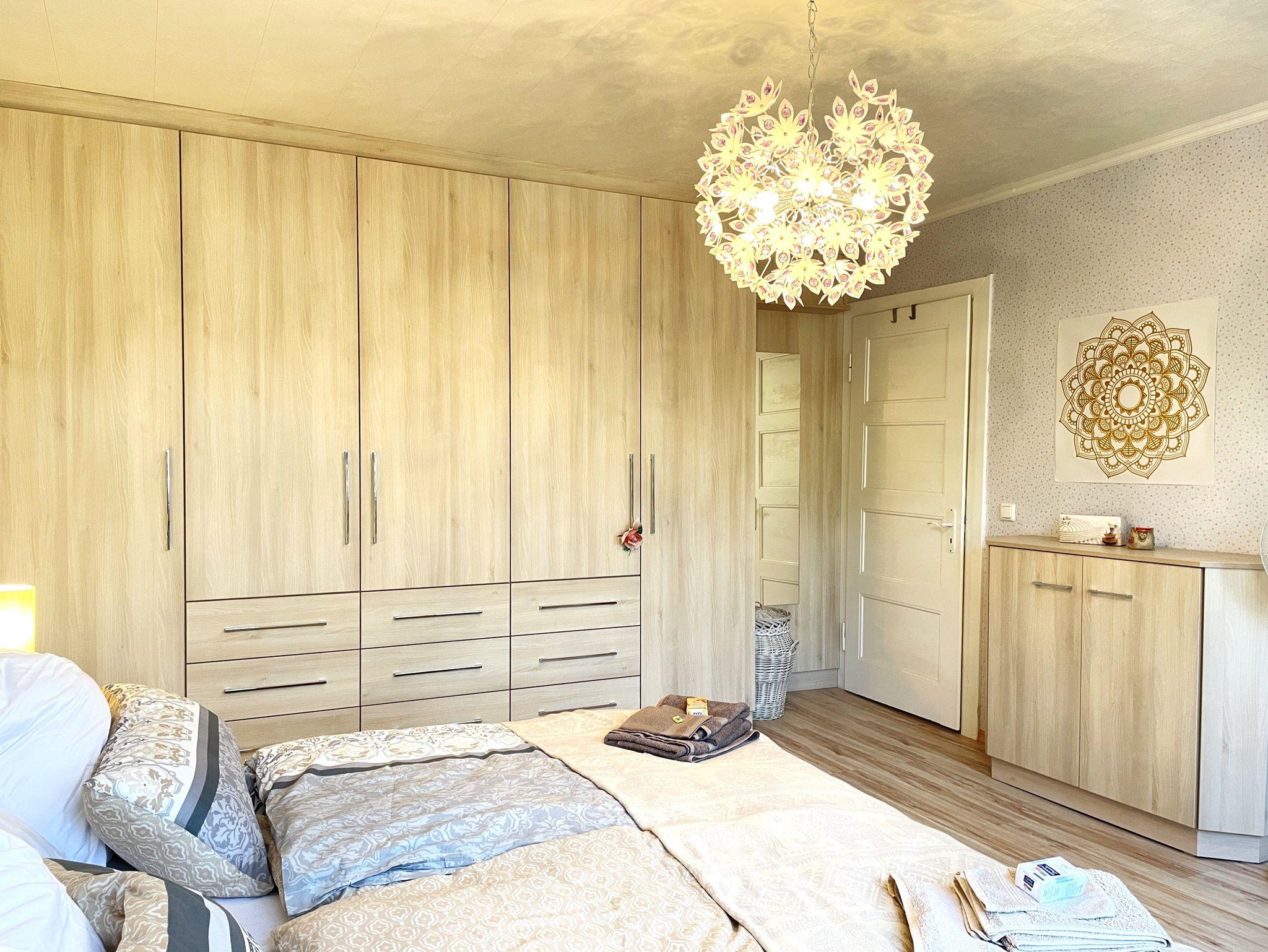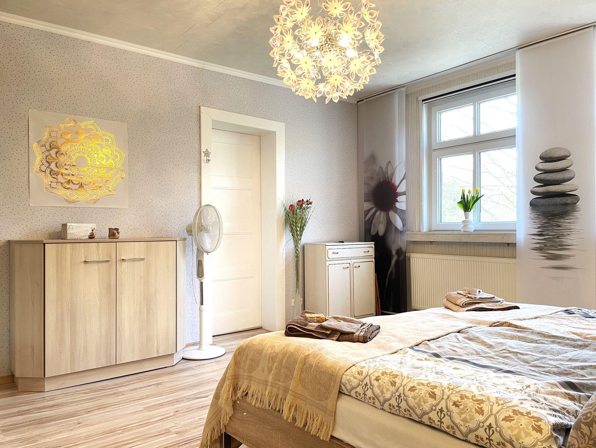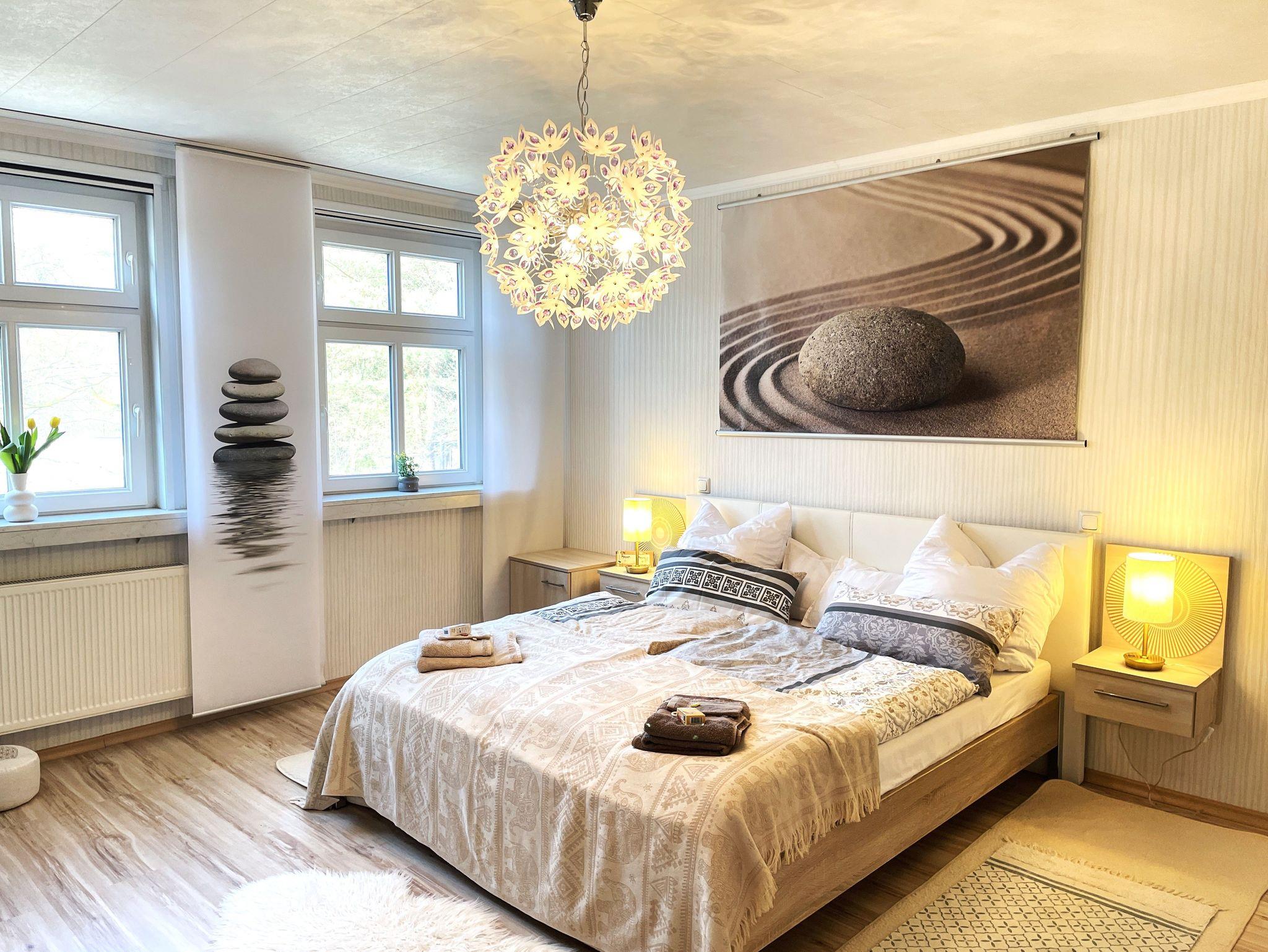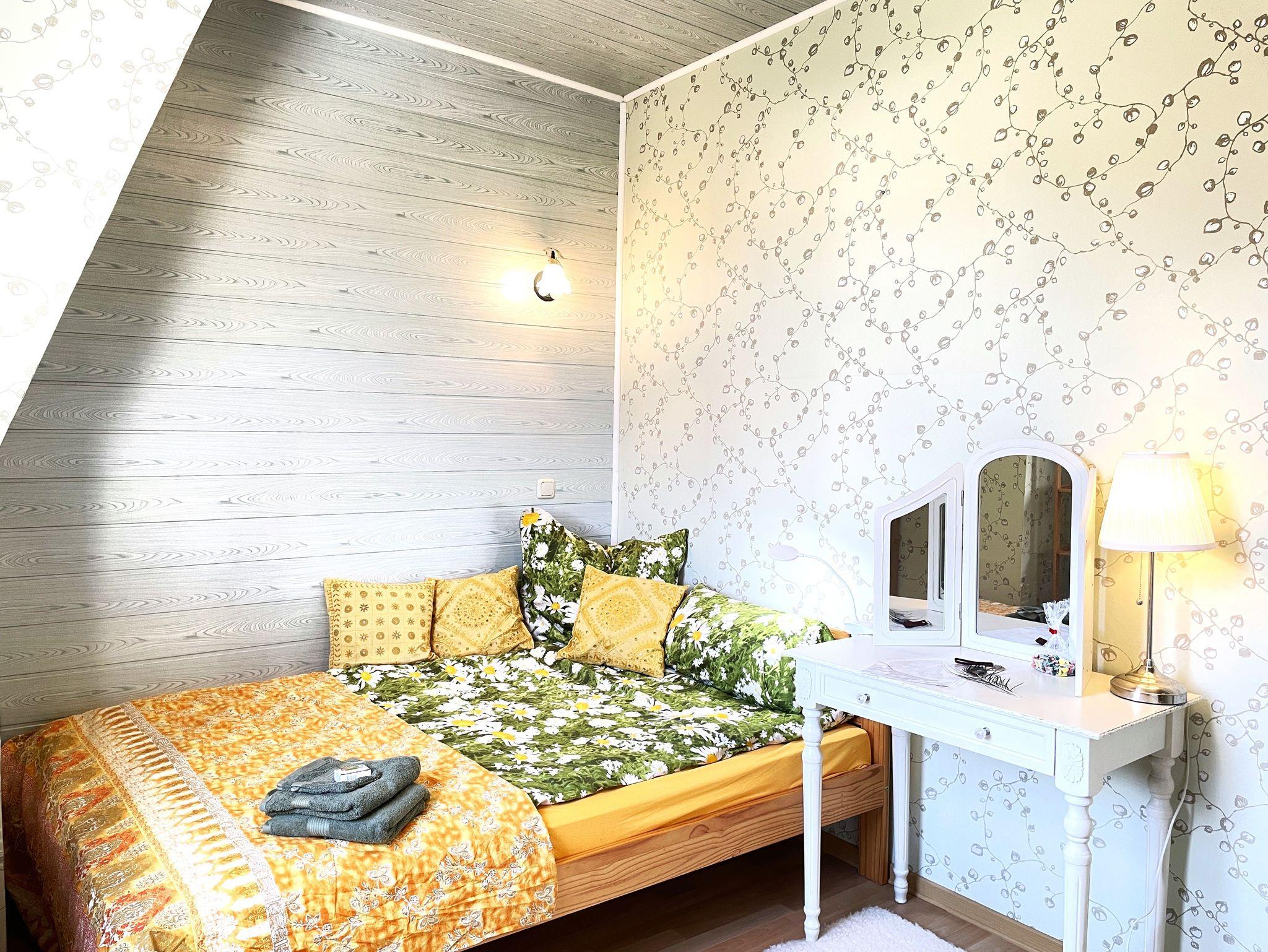 Zwei liebevoll eingerichtete Schlafzimmer sorgen für erholsamen Schlaf: ein Doppelbett (180×200cm) und ein weiteres Bett (140×200cm). Das Bad ist mit Badewanne, Dusche, Waschbecken und WC ausgestattet. Auf Wunsch kann eine Waschmaschine genutzt werden.