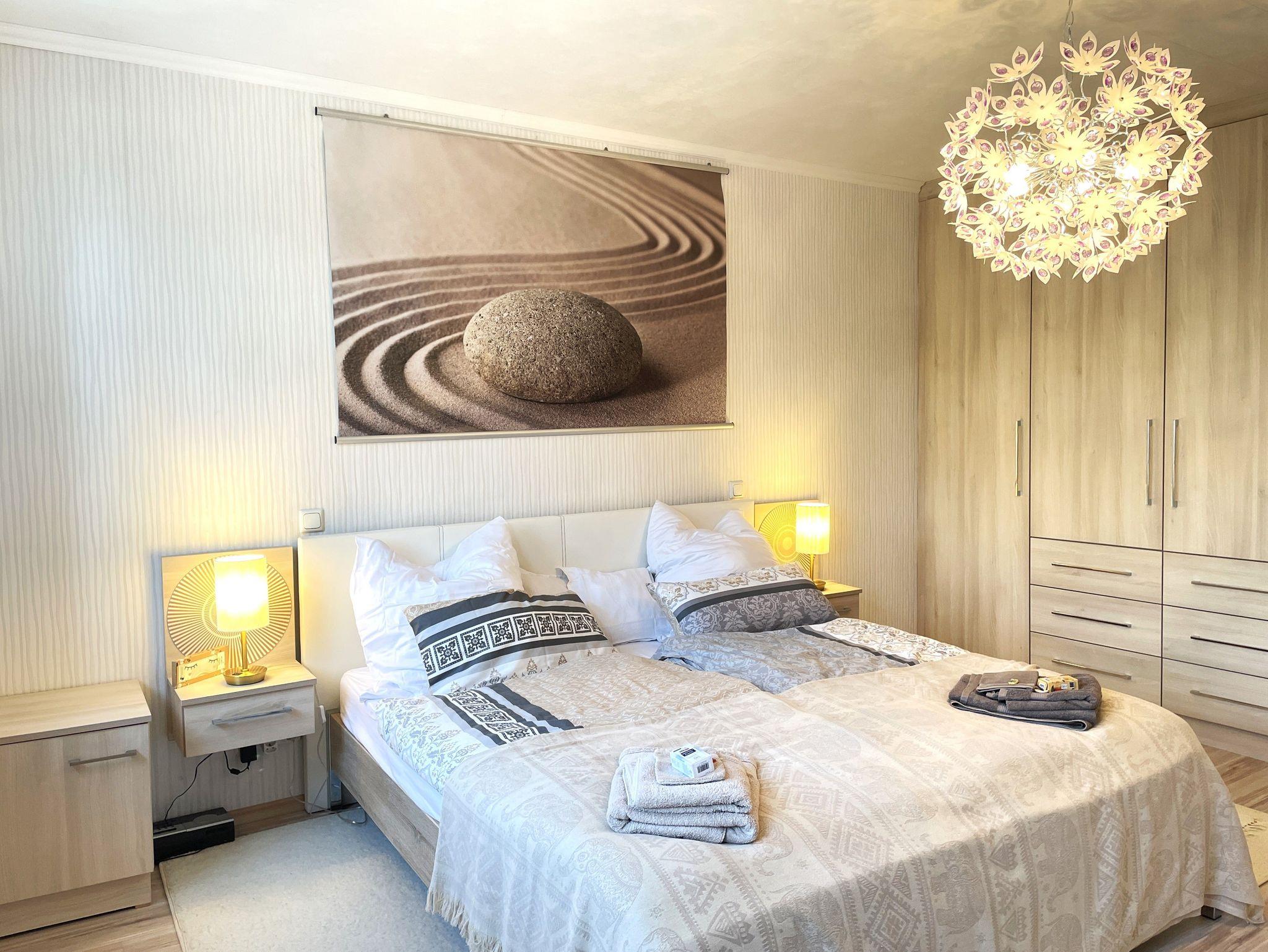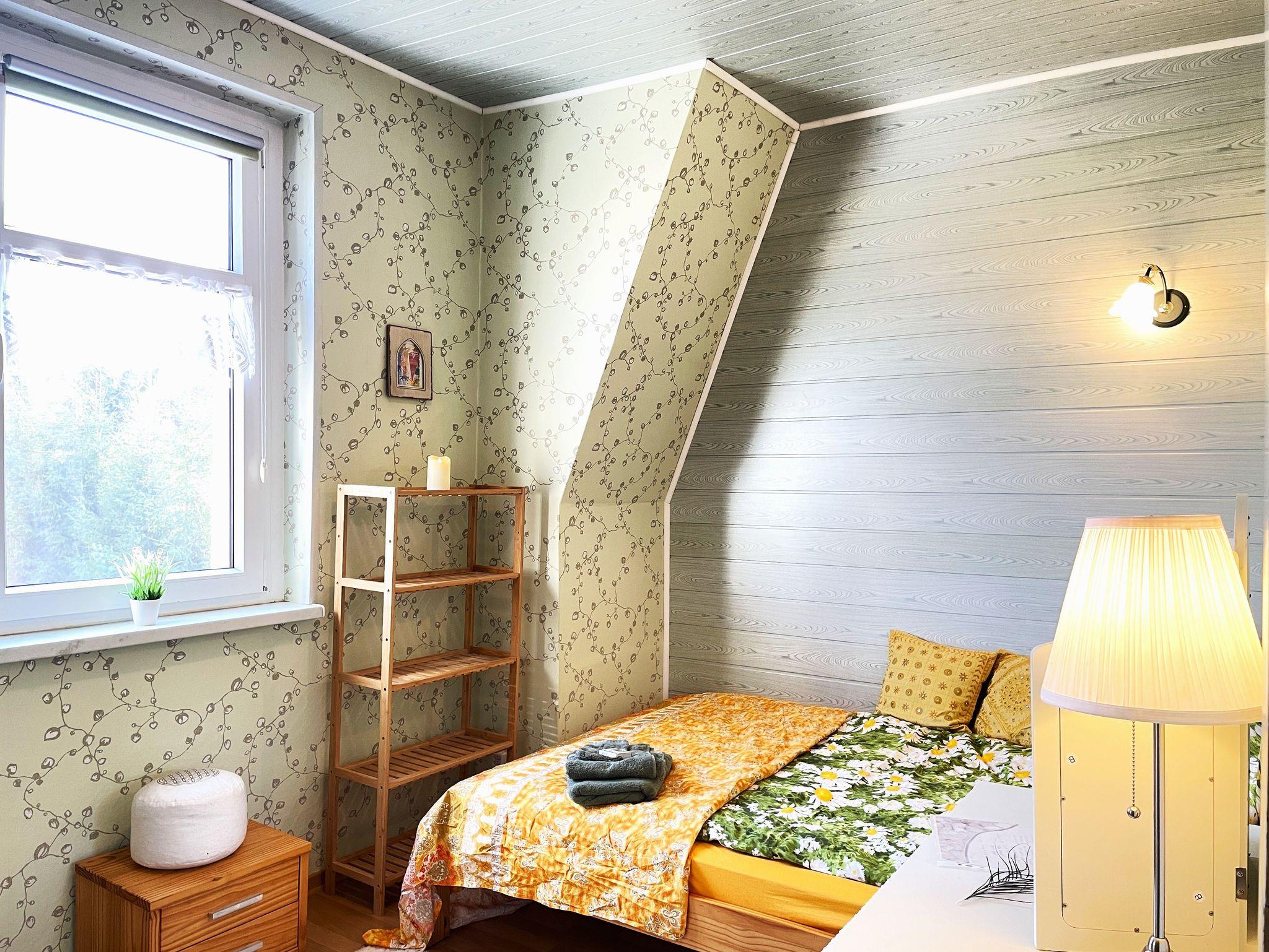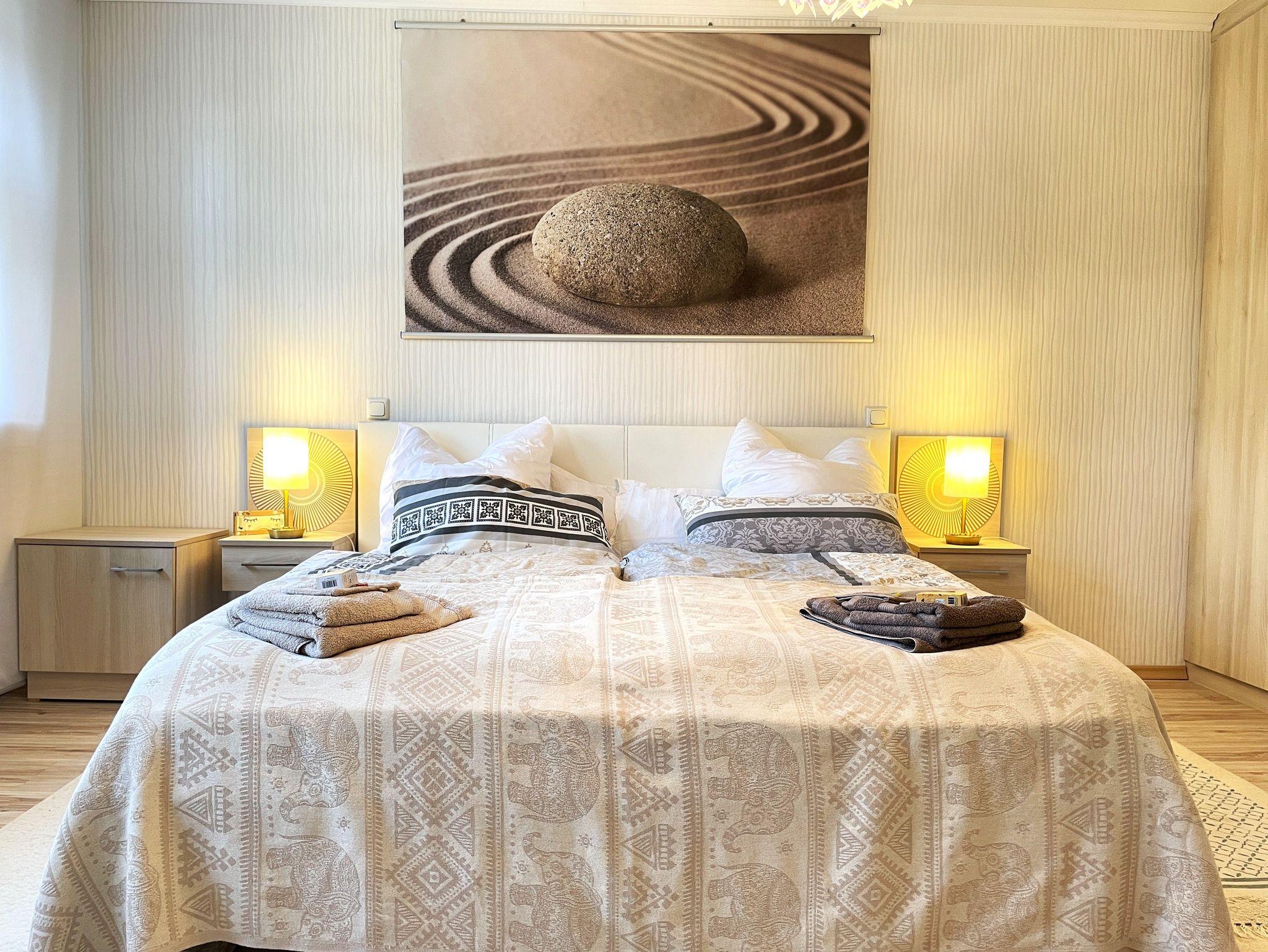 Zwei liebevoll eingerichtete Schlafzimmer sorgen für erholsamen Schlaf: ein Doppelbett (180×200cm) und ein weiteres Bett (140×200cm). Das Bad ist mit Badewanne, Dusche, Waschbecken und WC ausgestattet. Auf Wunsch kann eine Waschmaschine genutzt werden.