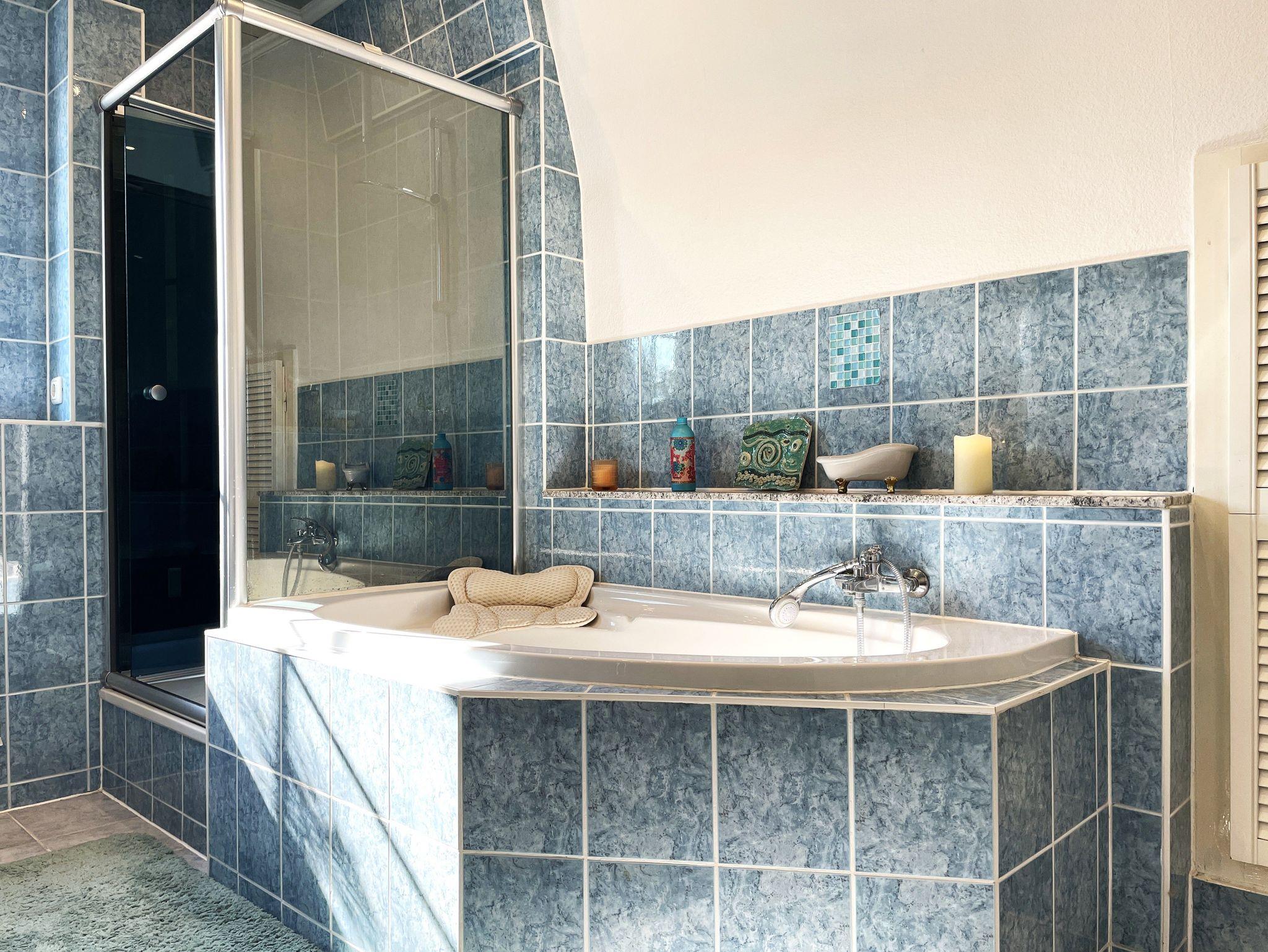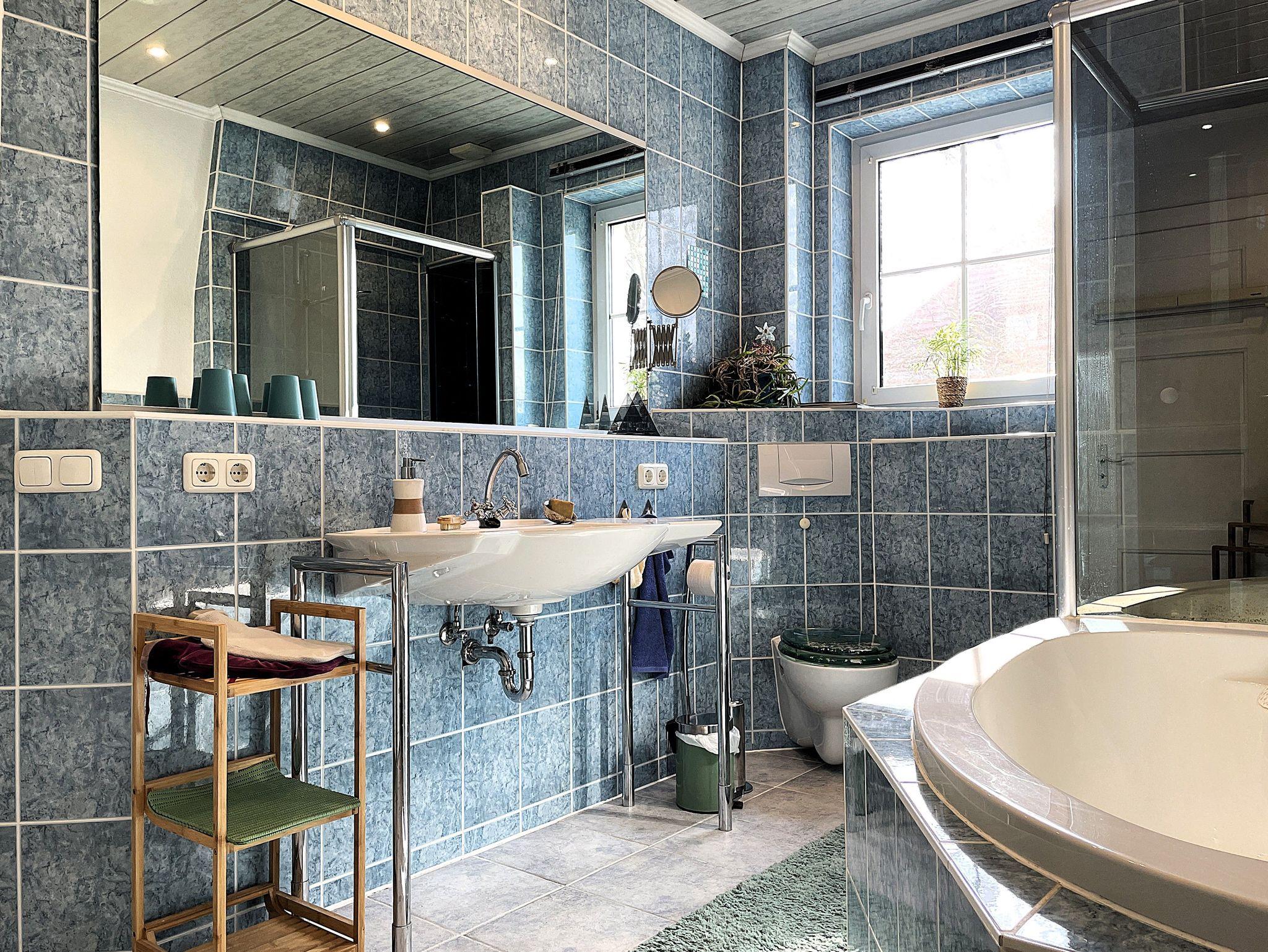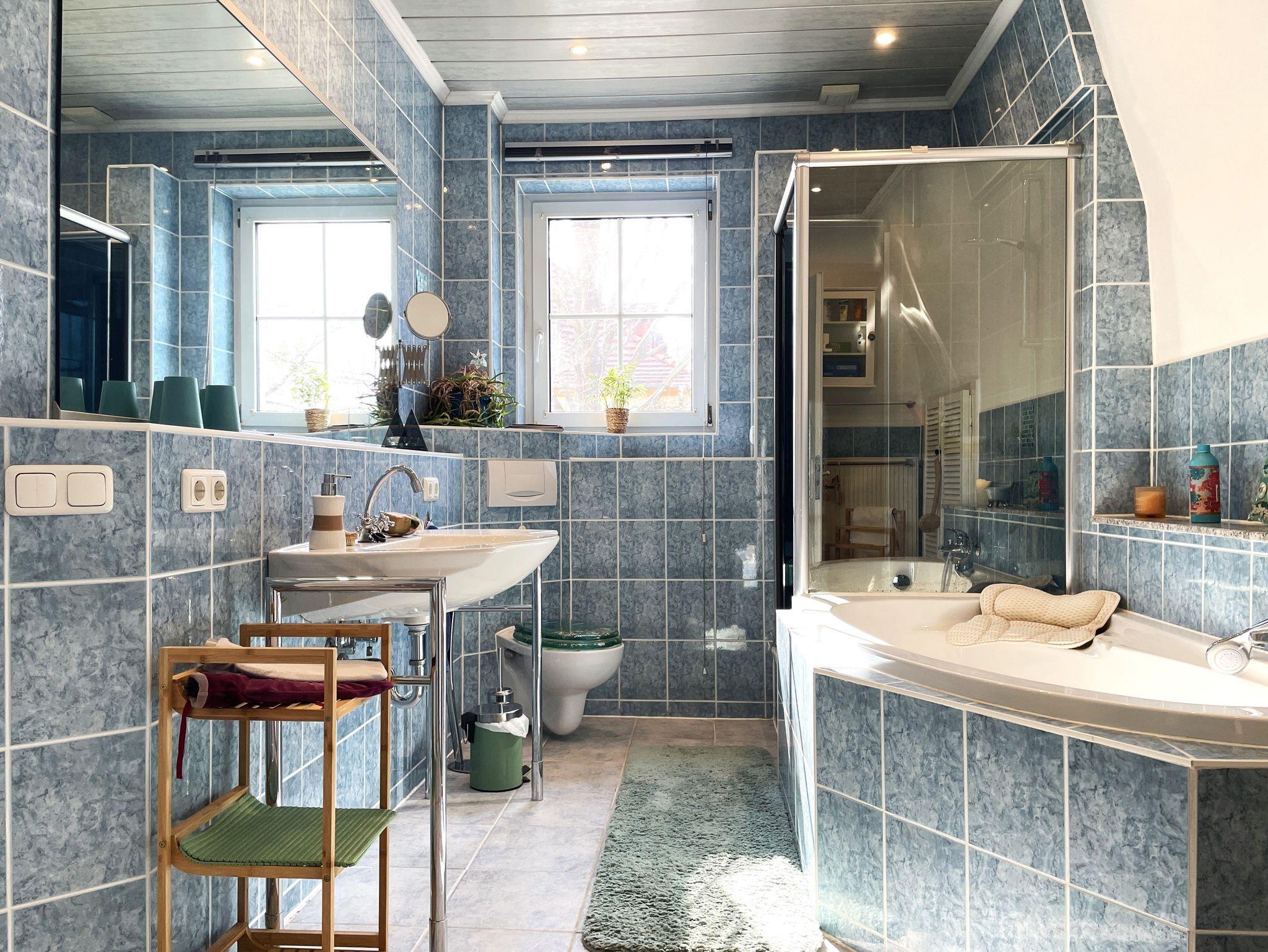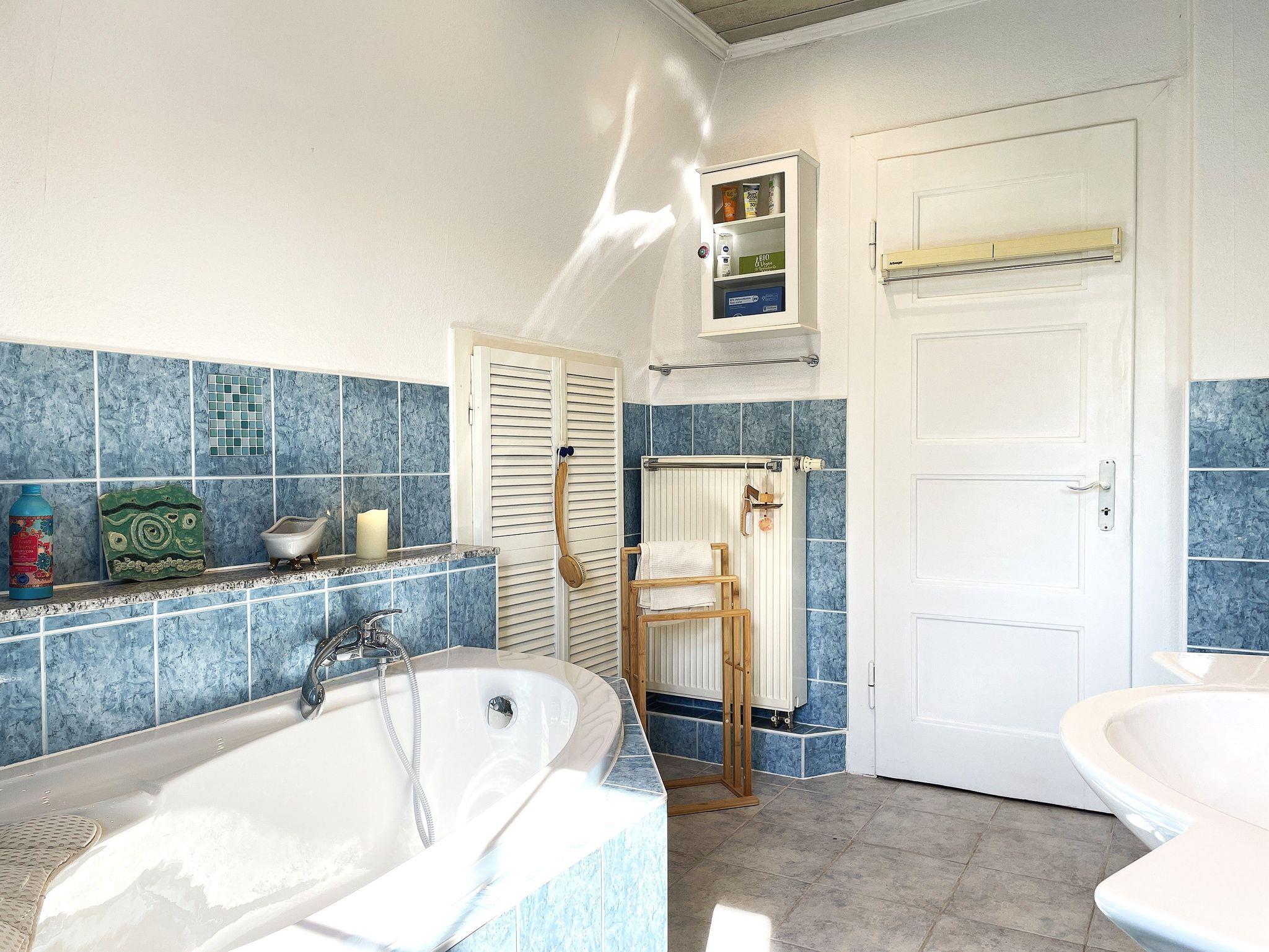 Zwei liebevoll eingerichtete Schlafzimmer sorgen für erholsamen Schlaf: ein Doppelbett (180×200cm) und ein weiteres Bett (140×200cm). Das Bad ist mit Badewanne, Dusche, Waschbecken und WC ausgestattet. Auf Wunsch kann eine Waschmaschine genutzt werden.