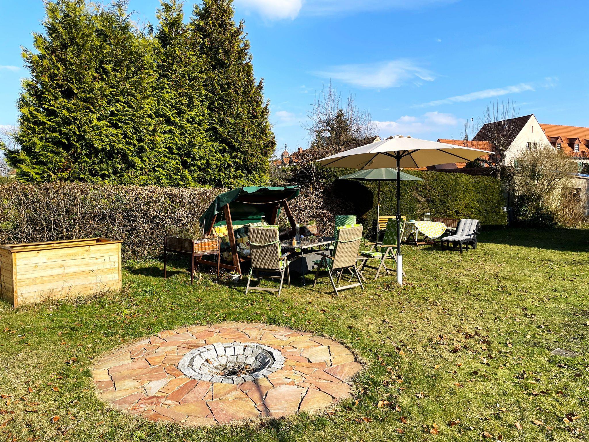Im Garten lädt eine Feuerstelle zu entspannten Abenden im Freien ein – perfekt für gesellige Stunden unter dem Sternenhimmel.