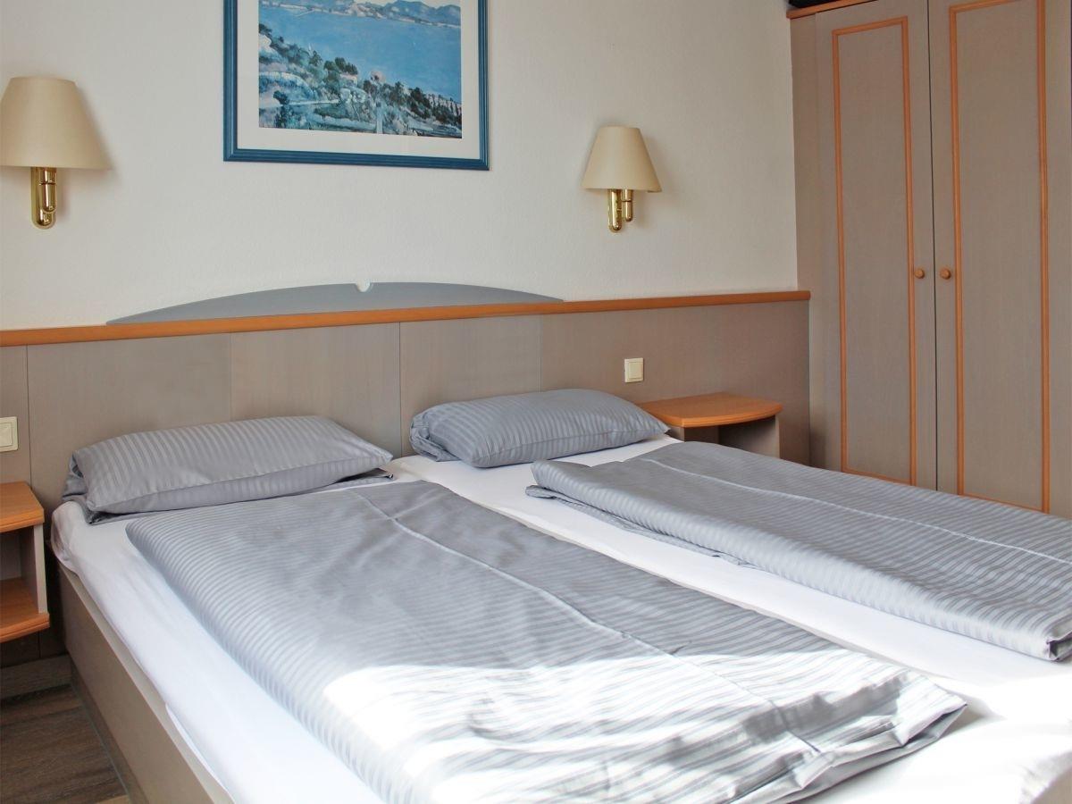 Doppelbett und geräumiger Kleiderschrank. Auch von diesem Zimmer aus haben Sie Zutritt zur Terrasse.
