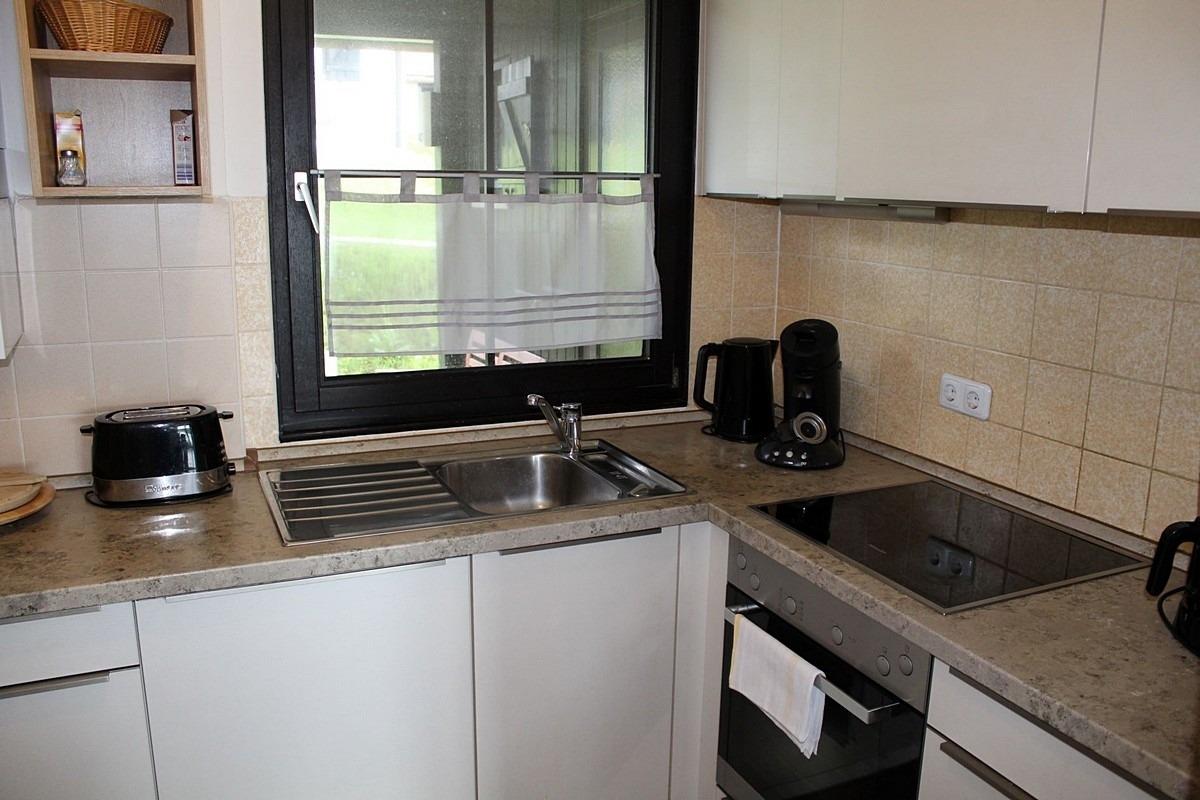 Voll ausgestattete Küche: Kühlschrank mit Gefrierfach, Geschirrspüler, Herd (Cerankochfeld), Backofen, Wasserkocher, Toaster, Kaffee- und Senseomaschine, Besteck, Geschirr, Gläser, Töpfe und alle gebräuchlichen Küchenutensilien.