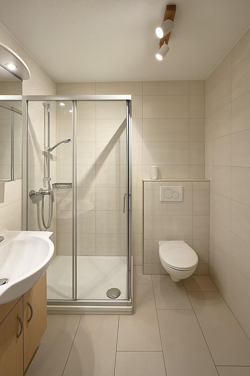 Badezimmer: Dusche, WC und Waschtisch
