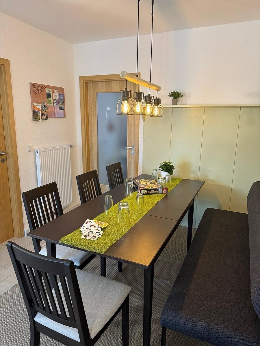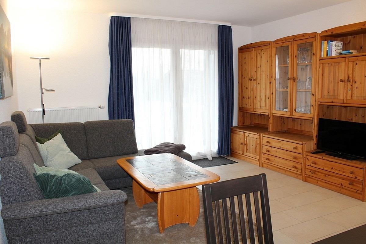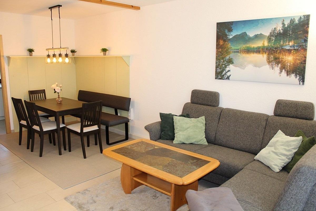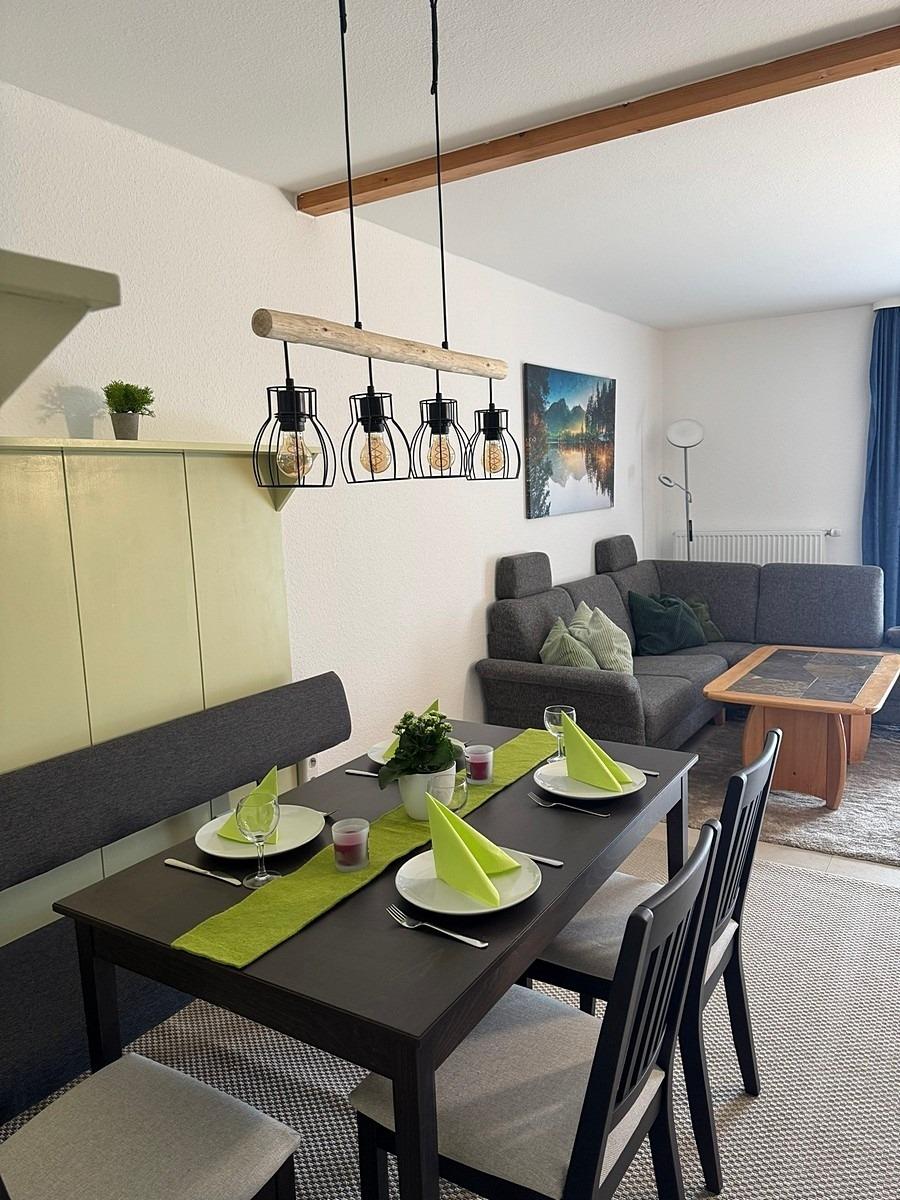 Wohn- Esszimmer: Polstersitzgruppe mit Schlafcouch, Essgruppe, TV, Radio, Telefon, WLAN-Internetanschluss