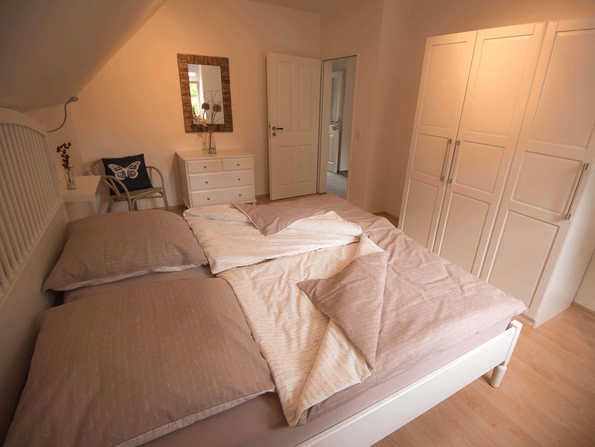 Im Obergeschoss befinden sich zwei Schlafzimmer, eines mit einem Doppelbett und das andere mit zwei getrennt stehenden Betten, sowie ein Lesezimmer mit Couch und Flachbild TV.