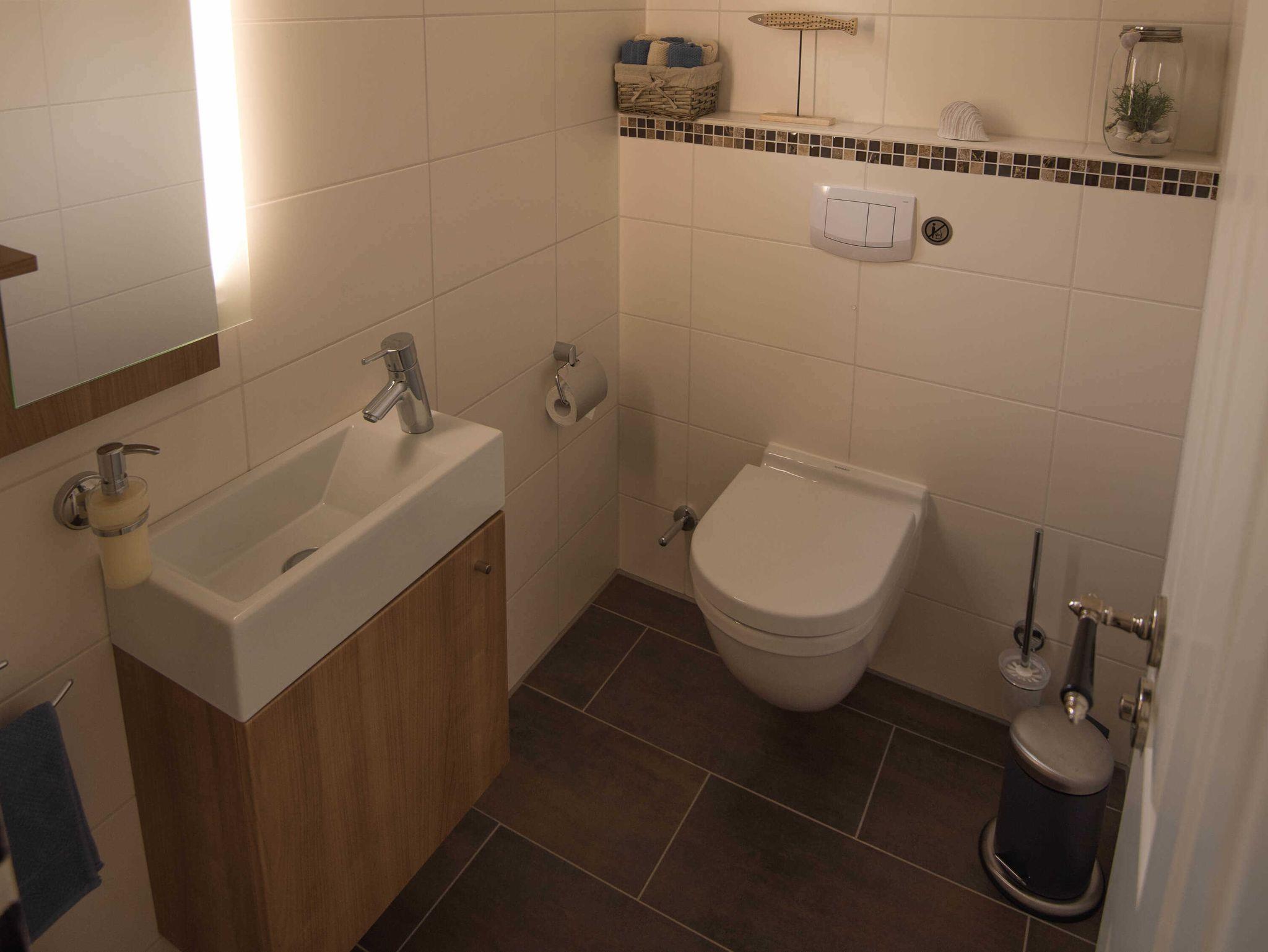 Das moderne Badezimmer verfügt über Dusche/WC, Waschtisch, Handtuchheizkörper und Fußbodenheizung.