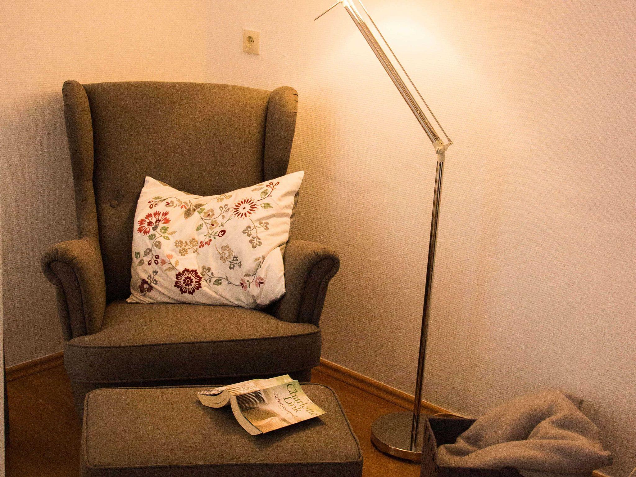 Wohnzimmer: Gemütliche Sitzecke, Leseecke, Flachbild-TV, DVD Player, Wii, Play Station, iPod-Dockingstation