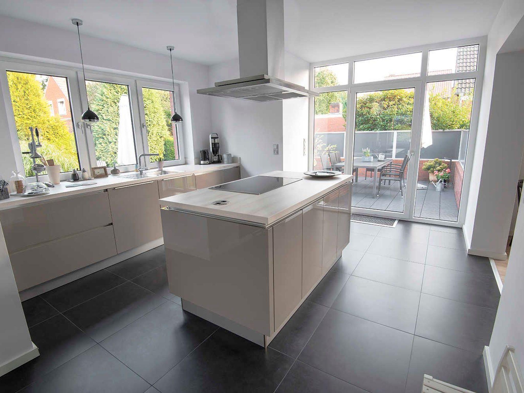 Großzügig ausgestattete Küche mit angrenzendem offenen Ess- und Wohnbereich.