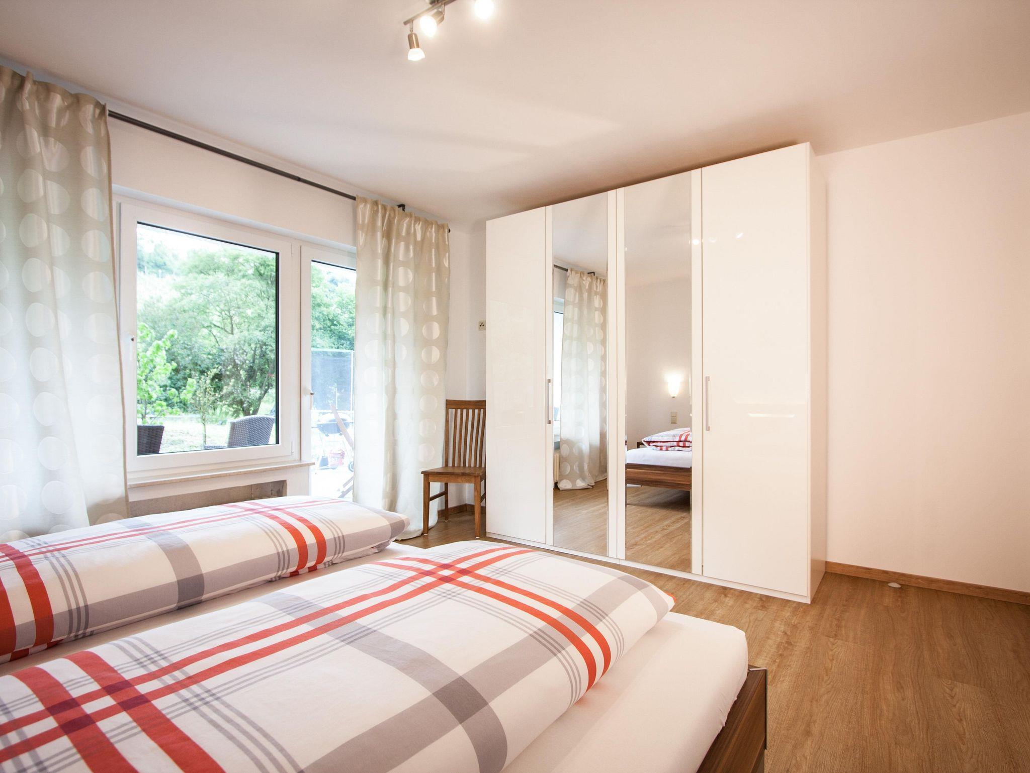 Unsere Komfort-Ferienwohnung bietet Ihnen alles, für einen erholsamen Urlaub an der Mosel an. In der komplett ausgestatten Küche mit Esstisch finden Sie folgendes vor: Backofen, Geschirrspülmaschine, Elektroherd, Kühlschrank mit Gefrierfach, Mikrowelle, Wasserkocher, Toaster, Kaffeemaschine und vieles mehr. Über den Flur erreichen Sie das helle Wohnzimmer. Die einladende Wohnlandschaft ist der Eye-Catcher im Raum. Zudem finden Sie hier ein SAT-TV, eine Hifi Anlage und vieles mehr vor. Zwei Doppelschlafzimmer, jeweils mit einem Kleiderschrank ausgestattet und großen Fenstern zur Terrasse finden Sie vor. Das Badezimmer ist mit einer ebenerdiger Dusche, Handtuchwärmer, Spiegel und WC ausgestattet.