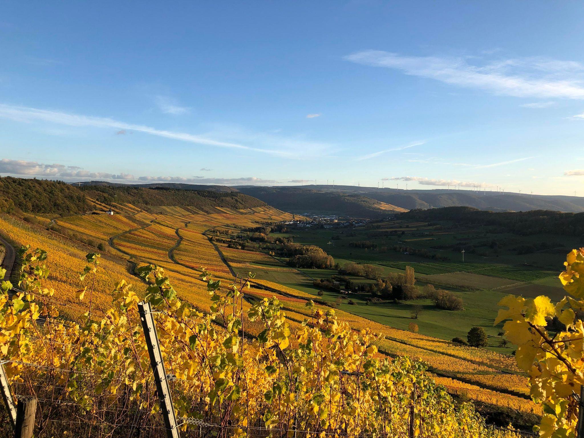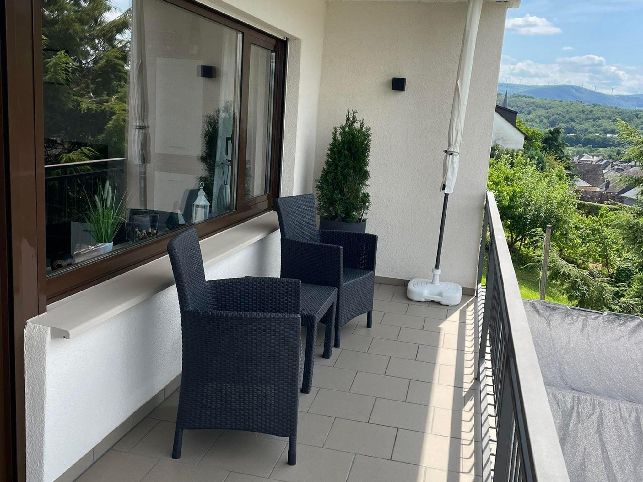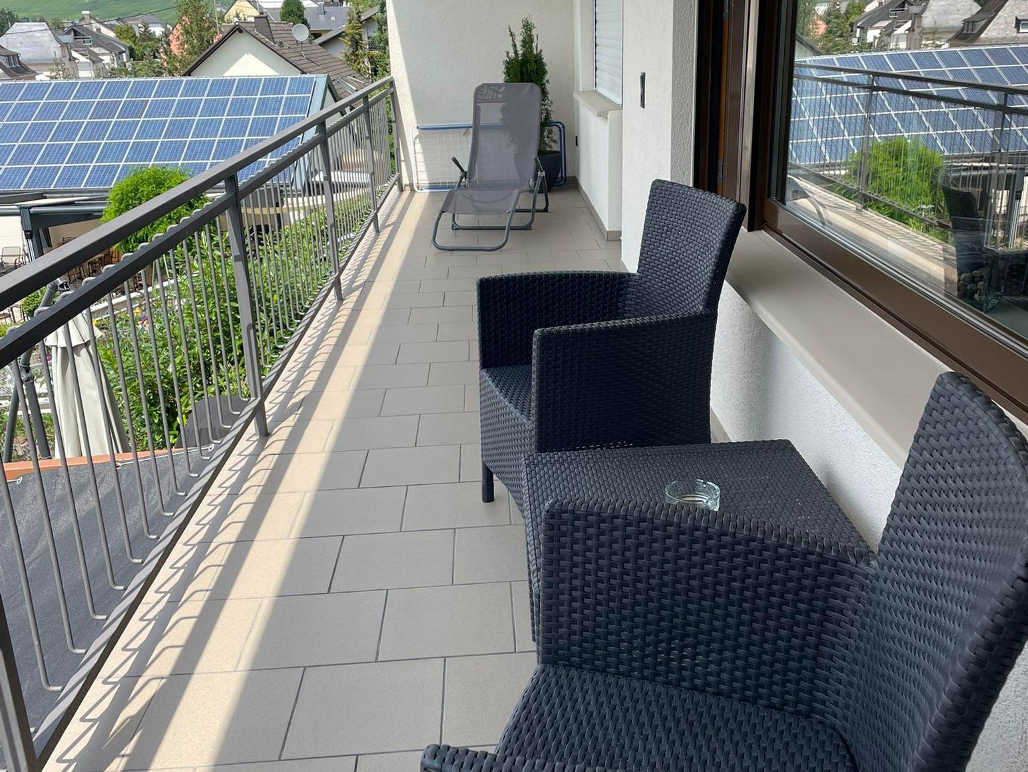 Unsere modern eingerichtete Ferienwohnung verfügt über einen großen Balkon mit tollem Blick auf den Ort und die umliegenden Weinberge.