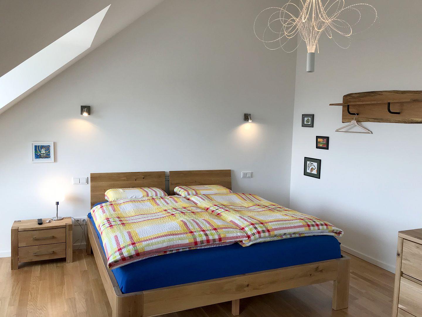 Ein Aufzug bringt Sie bequem vom Erdgeschoss ins 1. Obergeschoss. Innerhalb der Maisonette führt eine Treppe zu den beiden Schlafzimmern im oberen Bereich. Das erste Schlafzimmer ist mit einem Doppelbett ausgestattet, das zweite bietet ebenfalls ein Doppelbett sowie eine zusätzliche Schlafcouch. Beide Schlafzimmer verfügen über moderne Klimaanlagen und sorgen so auch an warmen Tagen für angenehmen Schlafkomfort. Bei Bedarf kann zudem die hochwertige Schlafcouch im Wohnbereich als zusätzliche Übernachtungsmöglichkeit genutzt werden. Alle Fenster sind 3-fach isolierverglast und mit elektrisch steuerbaren Jalousien versehen – für erholsame Ruhe zu jeder Tageszeit.
