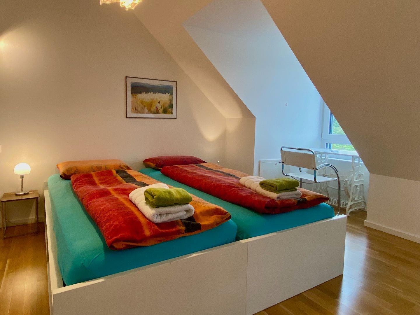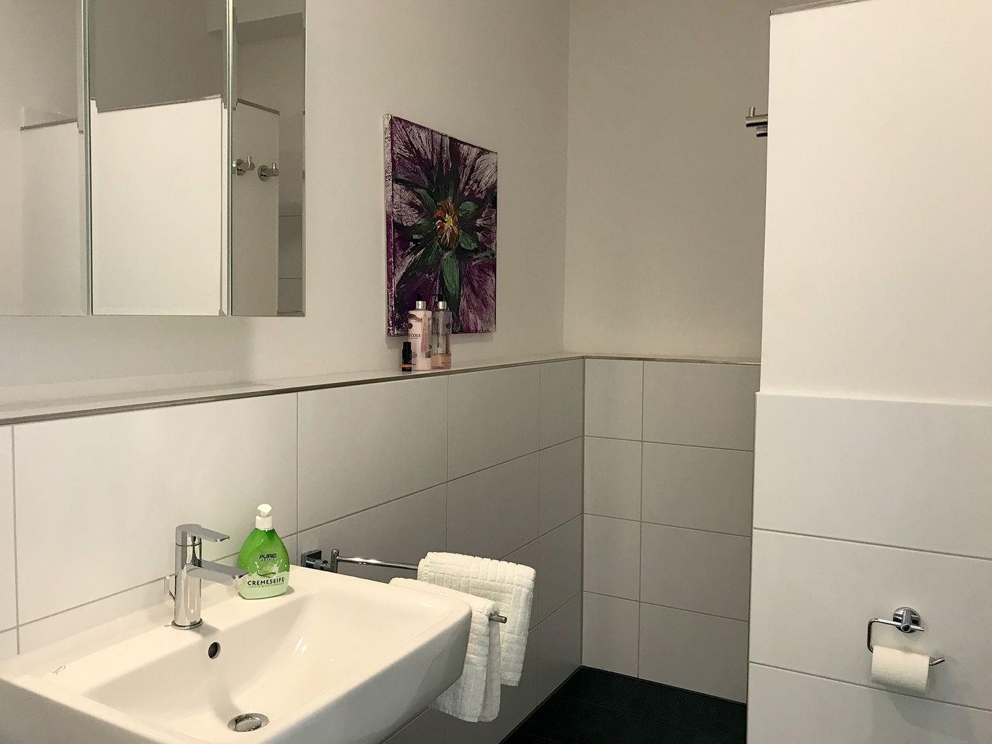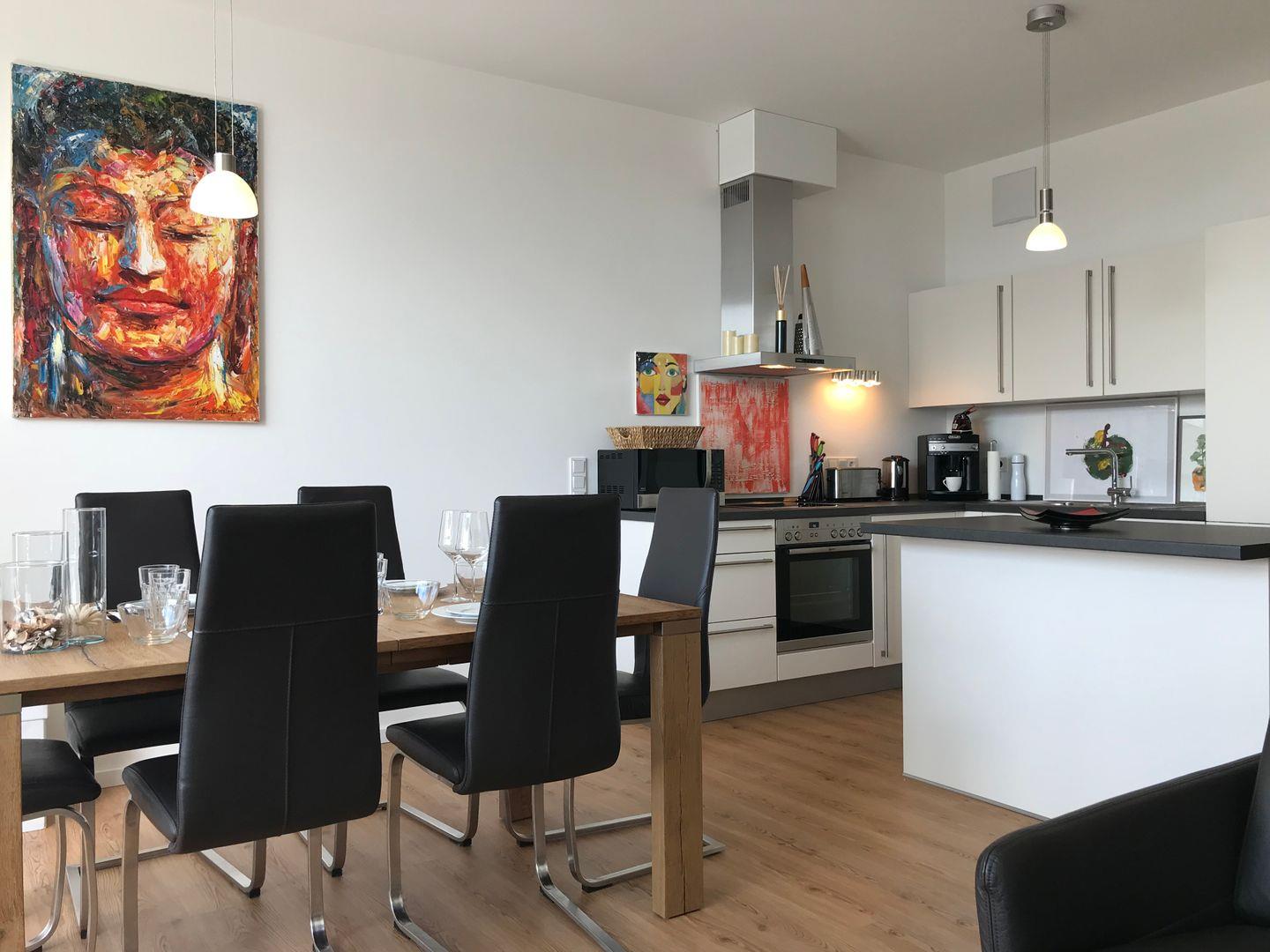 Die offene Küche ist sehr gut ausgestattet und lässt keine Wünsche offen: Cerankochfeld, Backofen, Spülmaschine, Kühlschrank, Mikrowelle, Wasserkocher, Kaffeemaschine sowie ausreichend Geschirr und Gläser stehen zur Verfügung. Das großzügige Badezimmer im unteren Bereich der Wohnung ist mit einer ebenerdigen Dusche ausgestattet. Zusätzlich gibt es ein separates Gäste-WC – besonders praktisch bei voller Belegung. In allen Räumen wurde hochwertiger Parkettboden oder Feinsteinzeug verlegt, und ein modernes Belüftungssystem sorgt automatisch für ein angenehmes Raumklima.