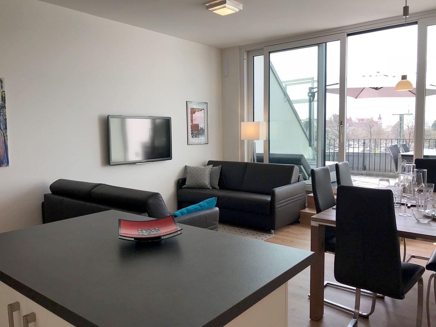 Lichtdurchflutete 3-Zimmer-Maisonette-Neubauwohnung mit großzügiger Süd-West-Terrasse und wunderschöner Seesicht – mitten in der historischen Altstadt von Lindau. Die Wohnung befindet sich im 2. und 3. Obergeschoss eines modernen Gebäudes und bietet auf ca. 93?m² Platz für bis zu fünf Personen. Ein besonderes Highlight ist die ca. 15?m² große Terrasse mit hochwertigen Loungemöbeln, Liegen und Sonnenschirm – ideal, um stimmungsvolle Sonnenuntergänge über dem Bodensee zu genießen.