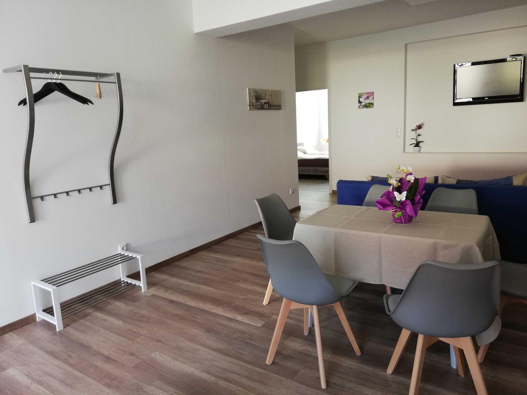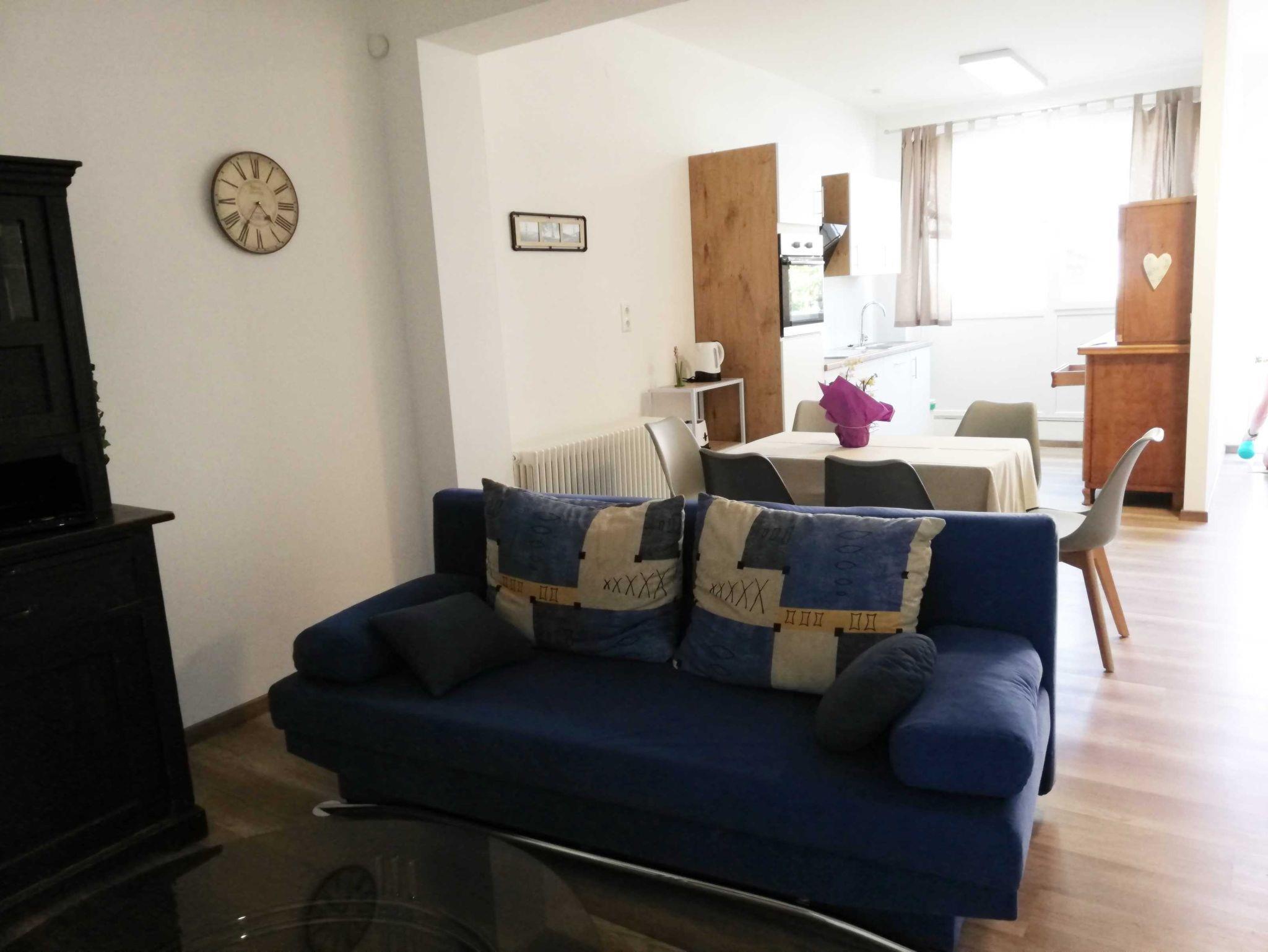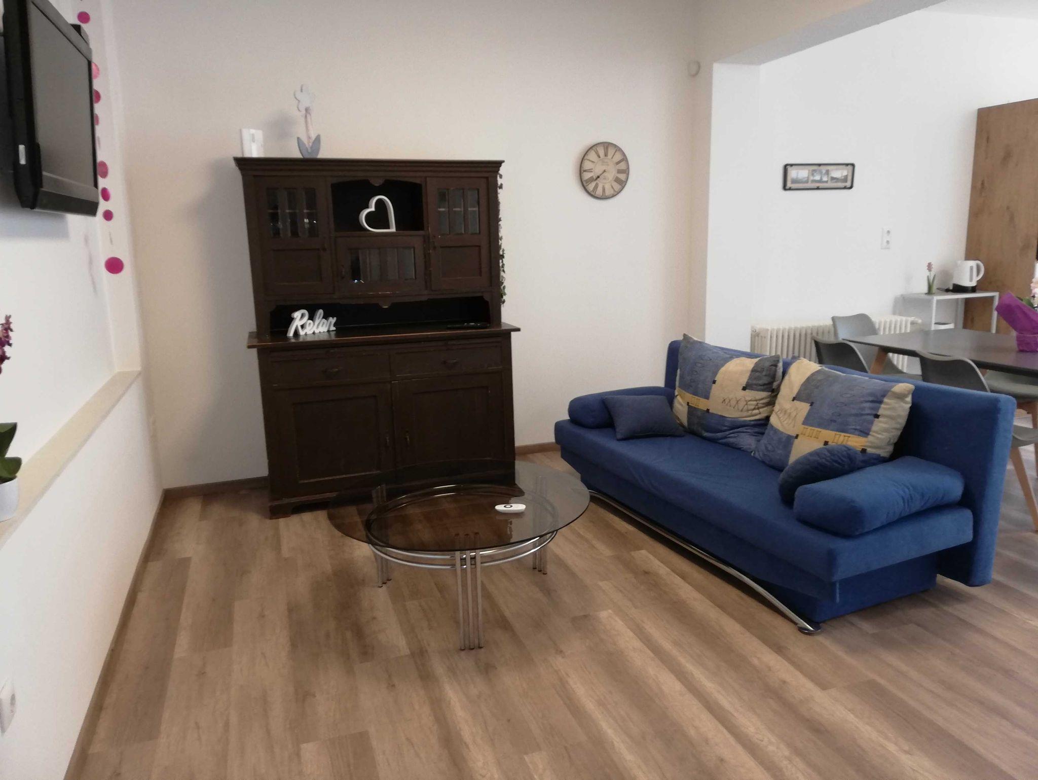 Die Ferienwohnung verfügt über zwei Schlafzimmer, einen Wohnbereich mit zusätzlicher Schlafcouch, eine offene und voll ausgestattete Küche mit Essplatz und ein Bad mit Dusche und WC. Das Wohnzimmer und die beiden Schlafzimmer sind mit Flat-TVs ausgestattet. Die Wohnung ist behindertenfreundlich gestaltet (Zugang nur über eine Stufe). Für unsere kleinen Gäste stehen ein Kinderbett und ein Hochstuhl bereit. Nähe Eleonoren-Klinik.