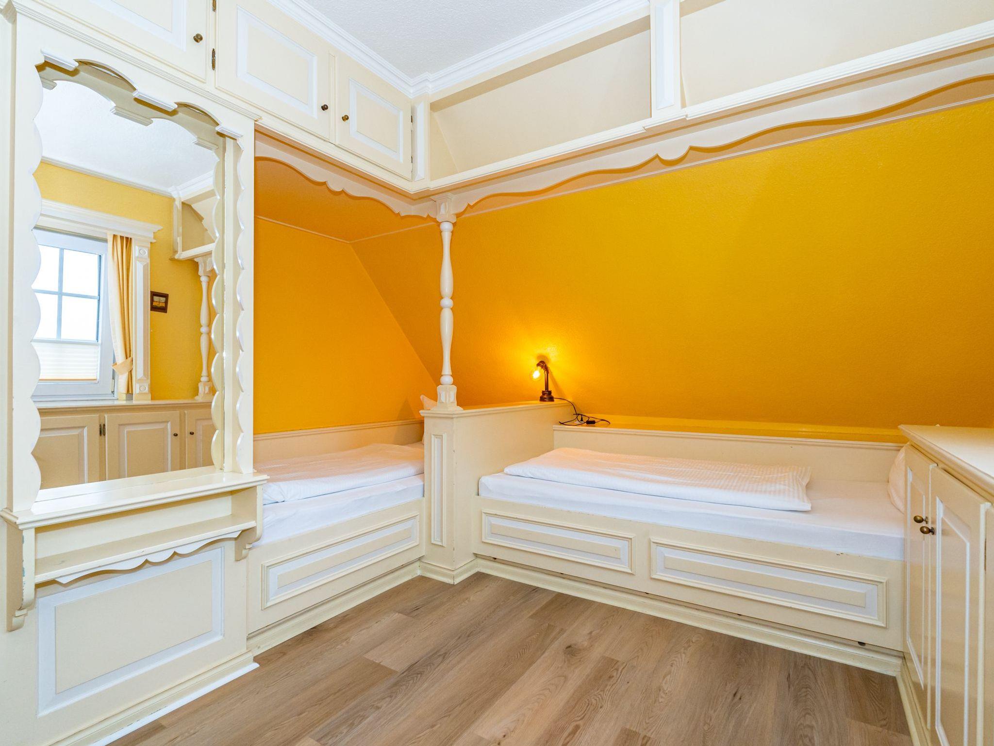 Das Apartment mit der Nummer sechs ist im 1. Obergeschoss zu finden und bietet auf 30 Quadratmeter Platz für 2 Personen. Im offen gestalteten Wohn- und Essbereich stehen 2 gemütliche Alkovenbetten. Das Bad ist ausgestattet mit Dusche, WC und Waschbecken.