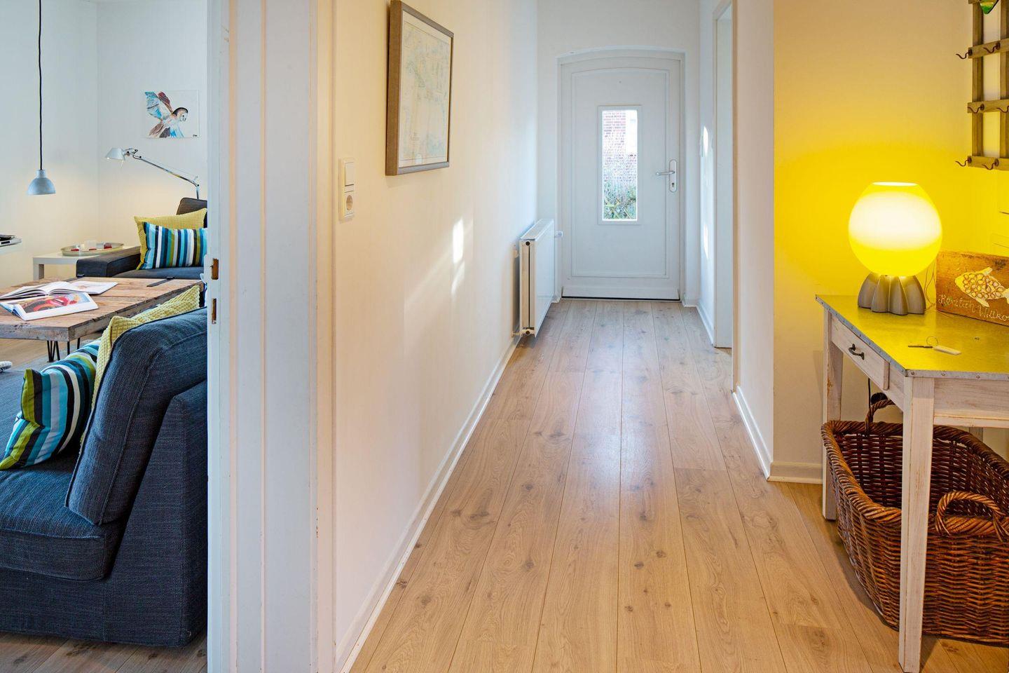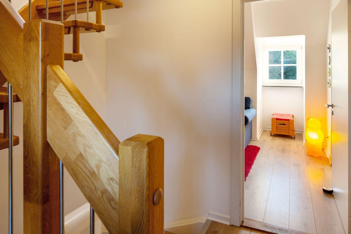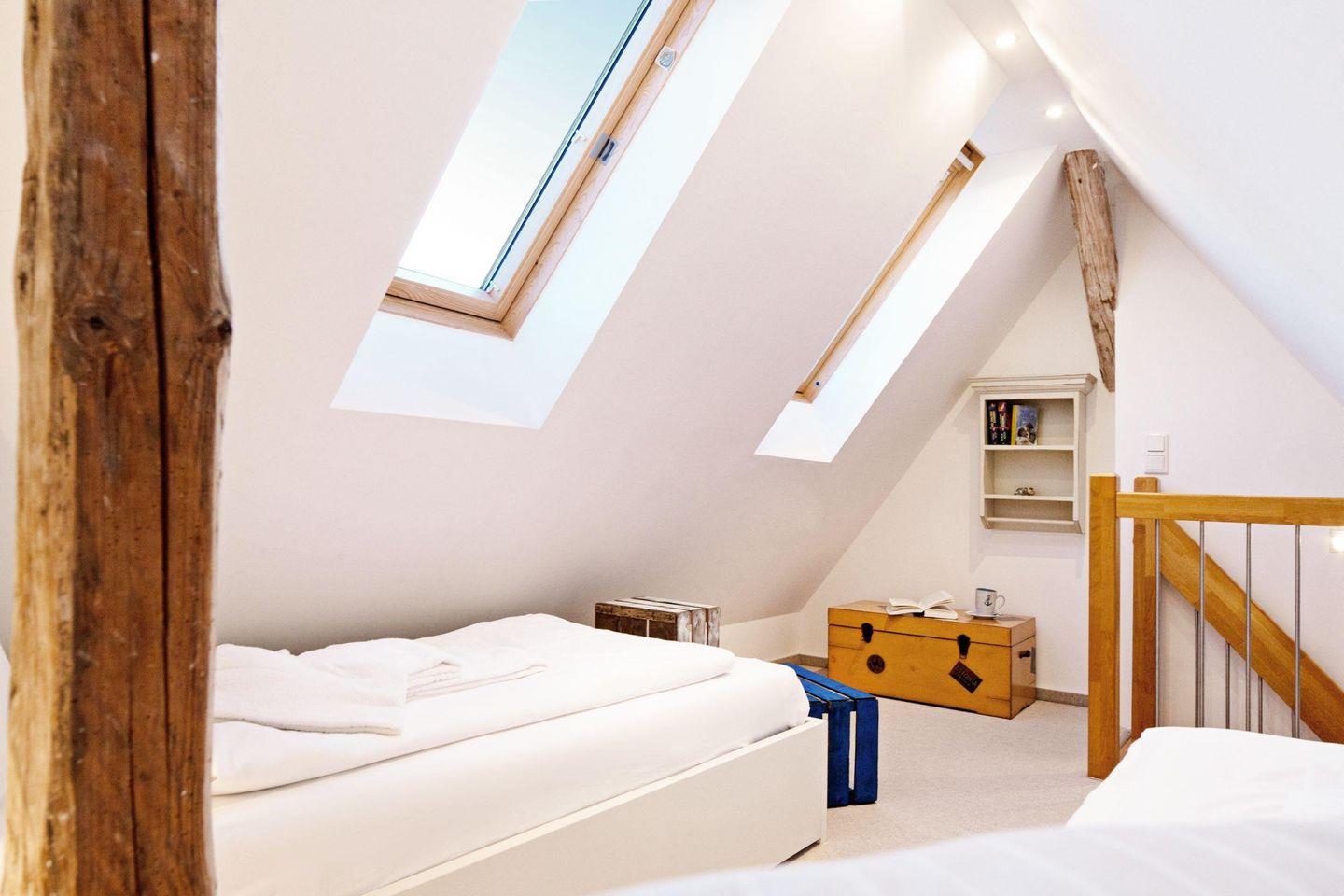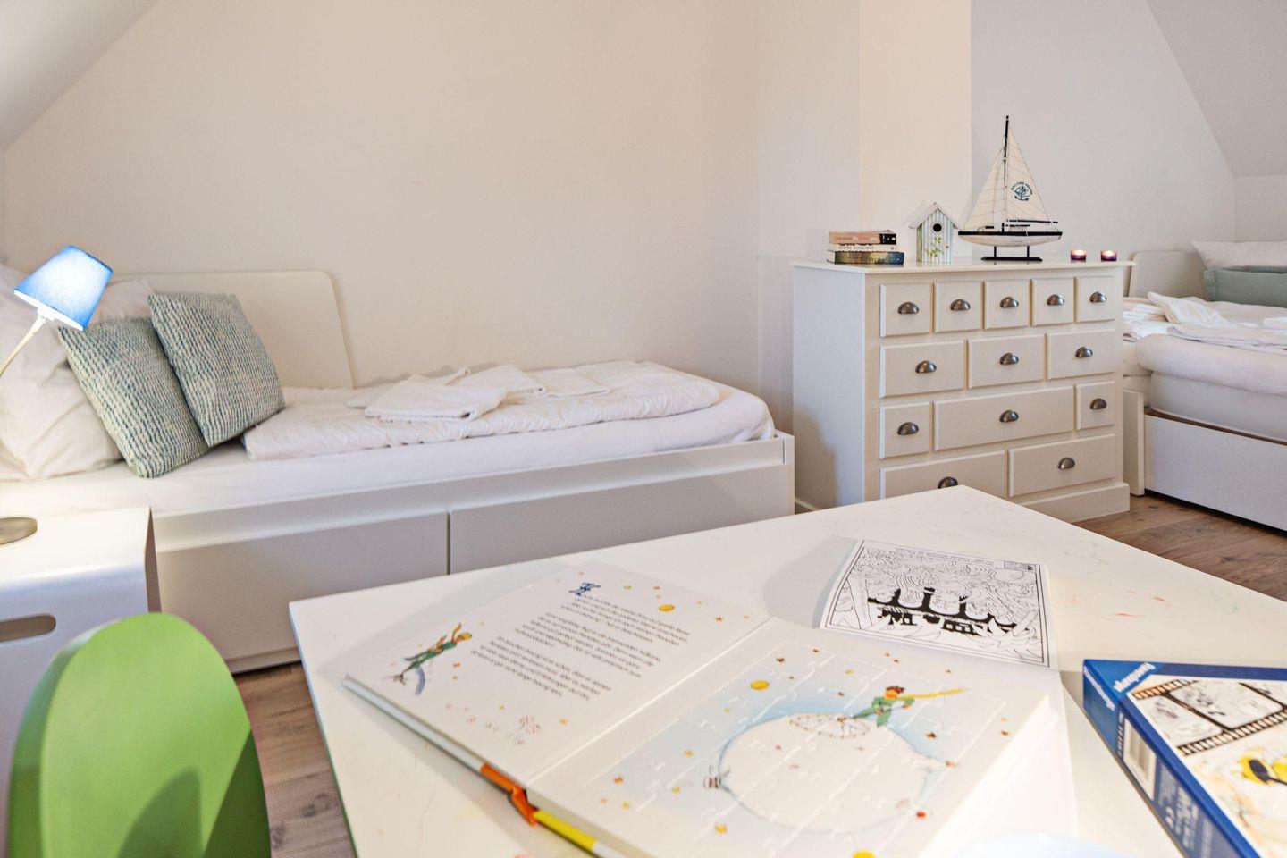 Mit drei Schlafzimmern, drei Bädern, einem Aufenthaltsraum mit Sofa und Fernseher und einem Wohnzimmer mit angrenzender offener Küche ist Platz für bis zu sechs Personen. Im 1. OG (geschlossene Treppe) befindet sich ein Schlafzimmer mit Doppelbett und ein Schlafzimmer mit zwei Einzelbetten, die auch zu einem Doppelbett ausgezogen werden können. In das Dachgeschoss führt eine eher stark ansteigende, offene Treppe mit einem weiteren Schlafzimmer mit zwei Einzelbetten. Im Außenbereich lädt Ihr sonniger Garten mit großer Terrasse mit Strandkorb und Gartenmöbeln zum Relaxen ein.