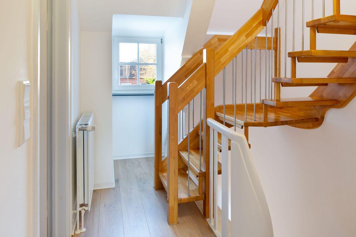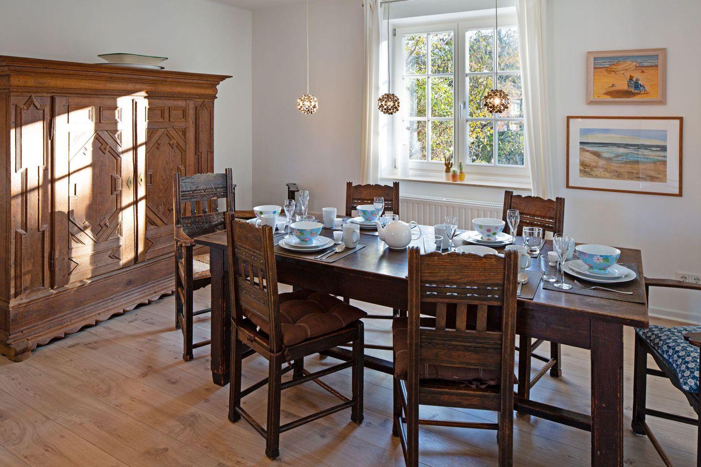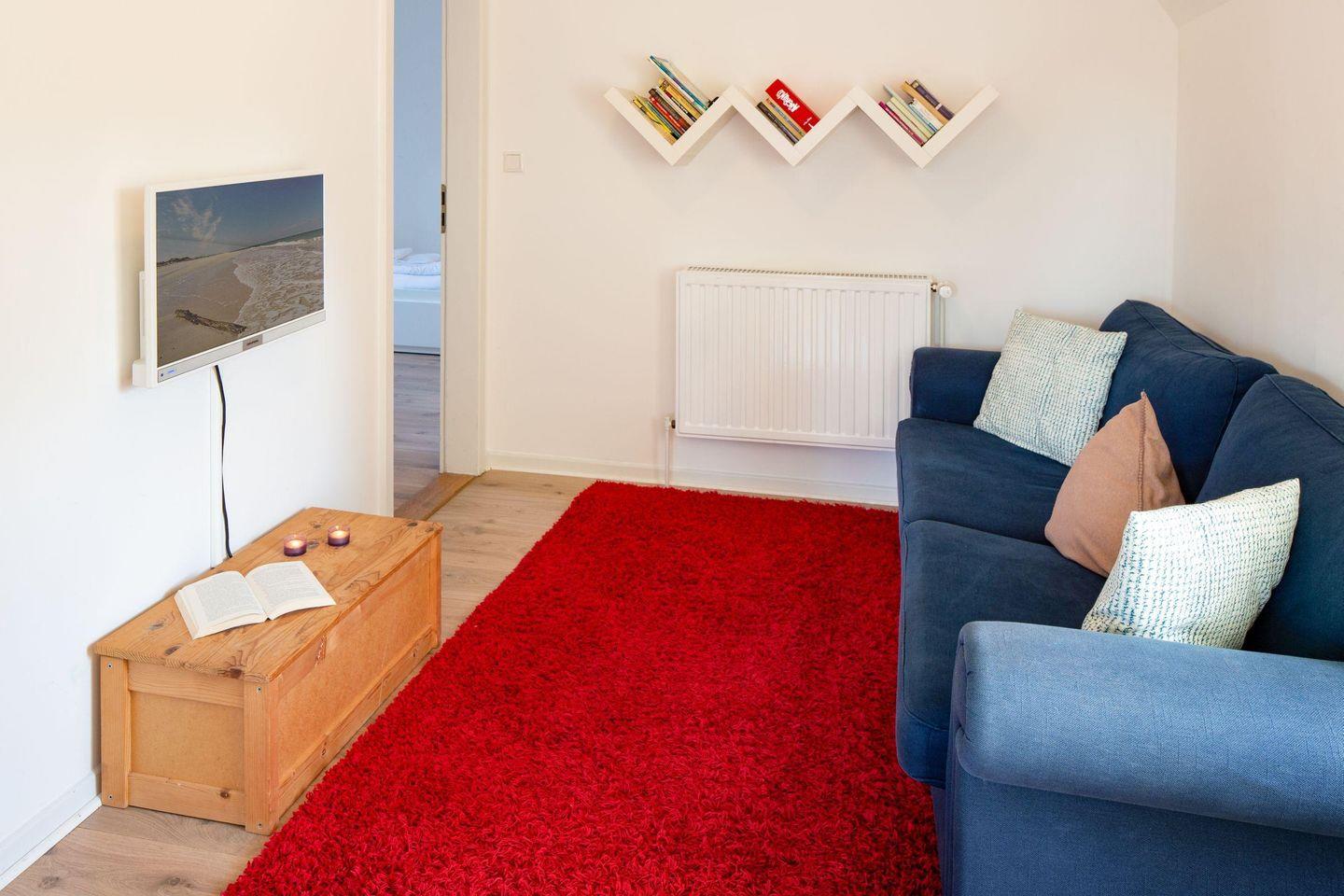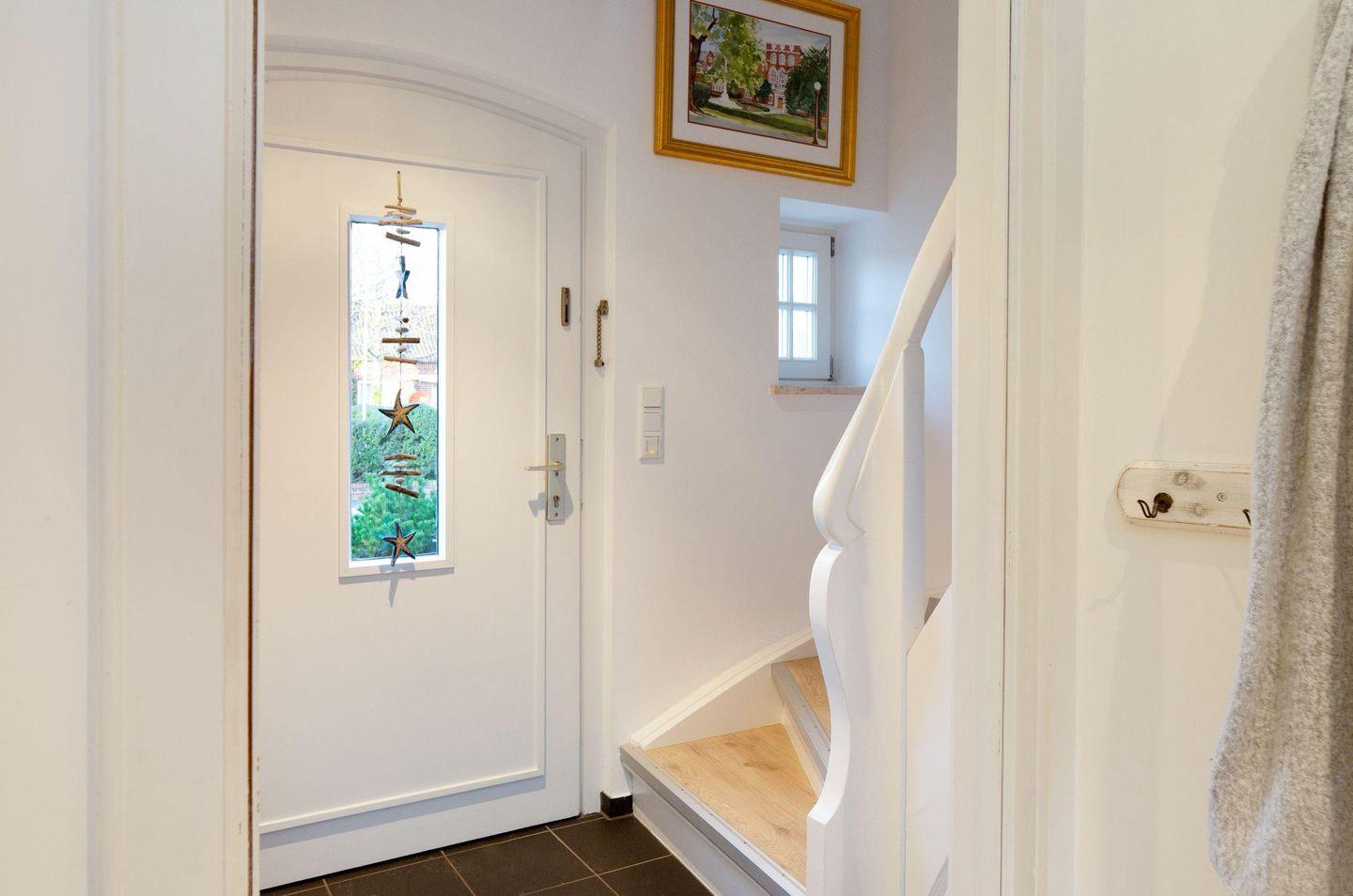 Mit drei Schlafzimmern, drei Bädern, einem Aufenthaltsraum mit Sofa und Fernseher und einem Wohnzimmer mit angrenzender offener Küche ist Platz für bis zu sechs Personen. Im 1. OG (geschlossene Treppe) befindet sich ein Schlafzimmer mit Doppelbett und ein Schlafzimmer mit zwei Einzelbetten, die auch zu einem Doppelbett ausgezogen werden können. In das Dachgeschoss führt eine eher stark ansteigende, offene Treppe mit einem weiteren Schlafzimmer mit zwei Einzelbetten. Im Außenbereich lädt Ihr sonniger Garten mit großer Terrasse mit Strandkorb und Gartenmöbeln zum Relaxen ein.