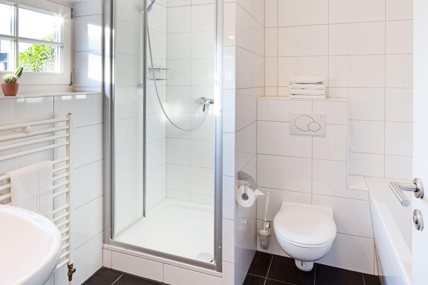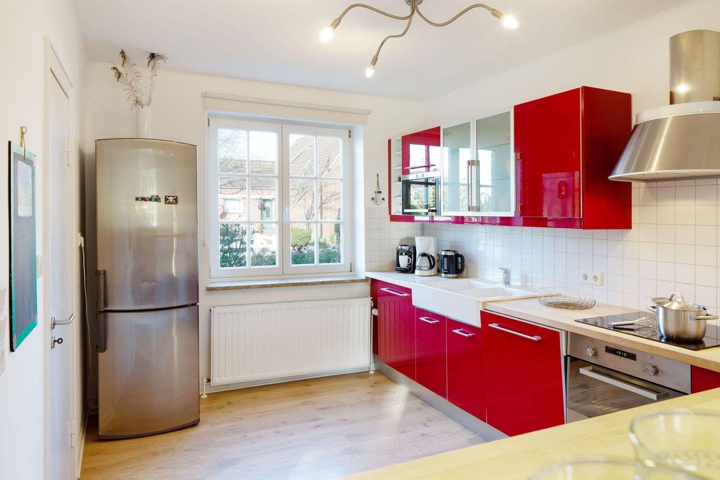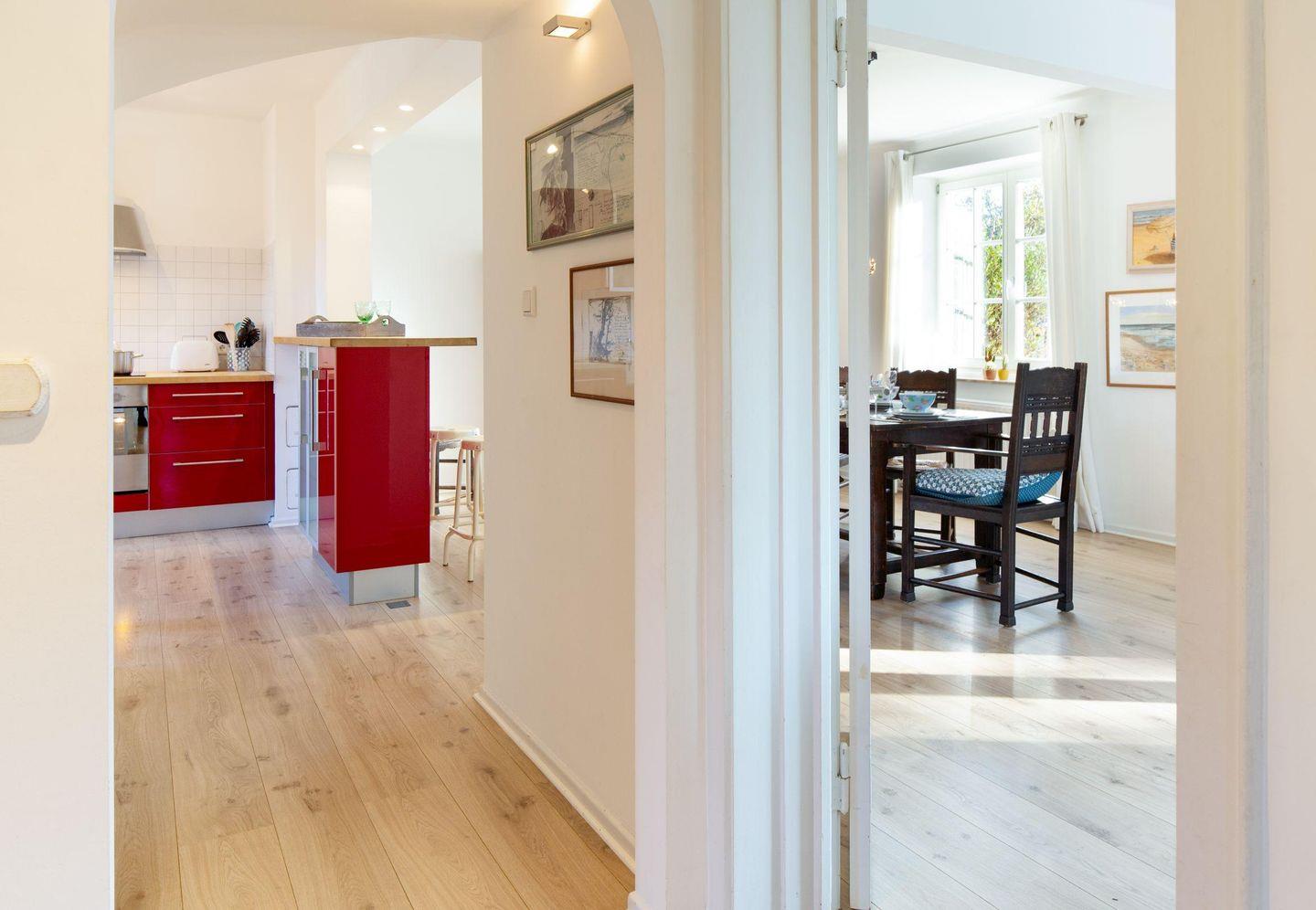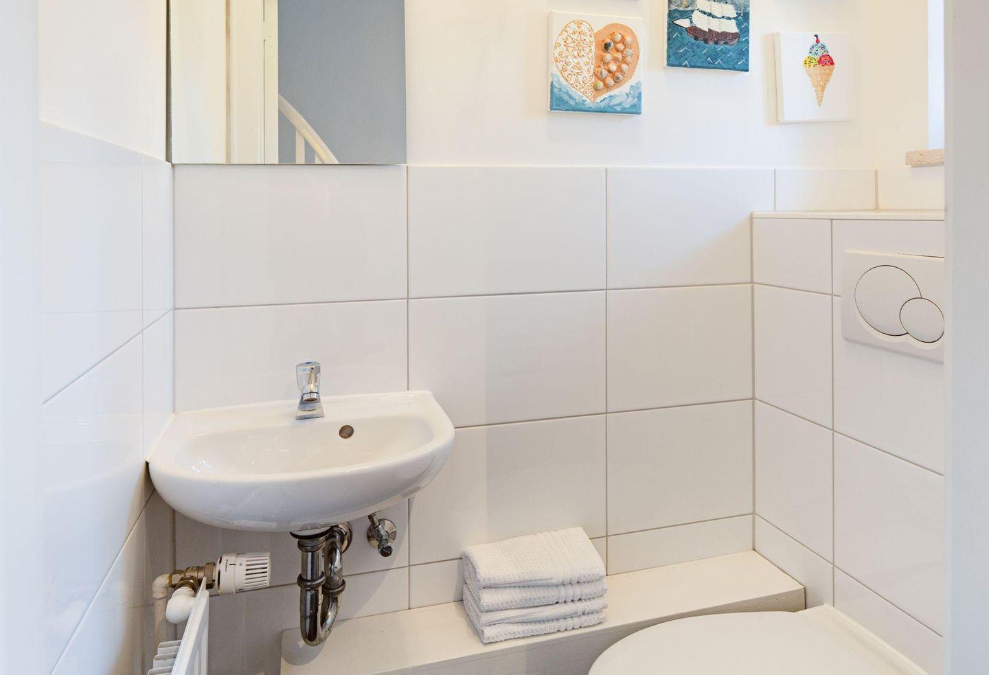 Mit drei Schlafzimmern, drei Bädern, einem Aufenthaltsraum mit Sofa und Fernseher und einem Wohnzimmer mit angrenzender offener Küche ist Platz für bis zu sechs Personen. Im 1. OG (geschlossene Treppe) befindet sich ein Schlafzimmer mit Doppelbett und ein Schlafzimmer mit zwei Einzelbetten, die auch zu einem Doppelbett ausgezogen werden können. In das Dachgeschoss führt eine eher stark ansteigende, offene Treppe mit einem weiteren Schlafzimmer mit zwei Einzelbetten. Im Außenbereich lädt Ihr sonniger Garten mit großer Terrasse mit Strandkorb und Gartenmöbeln zum Relaxen ein.