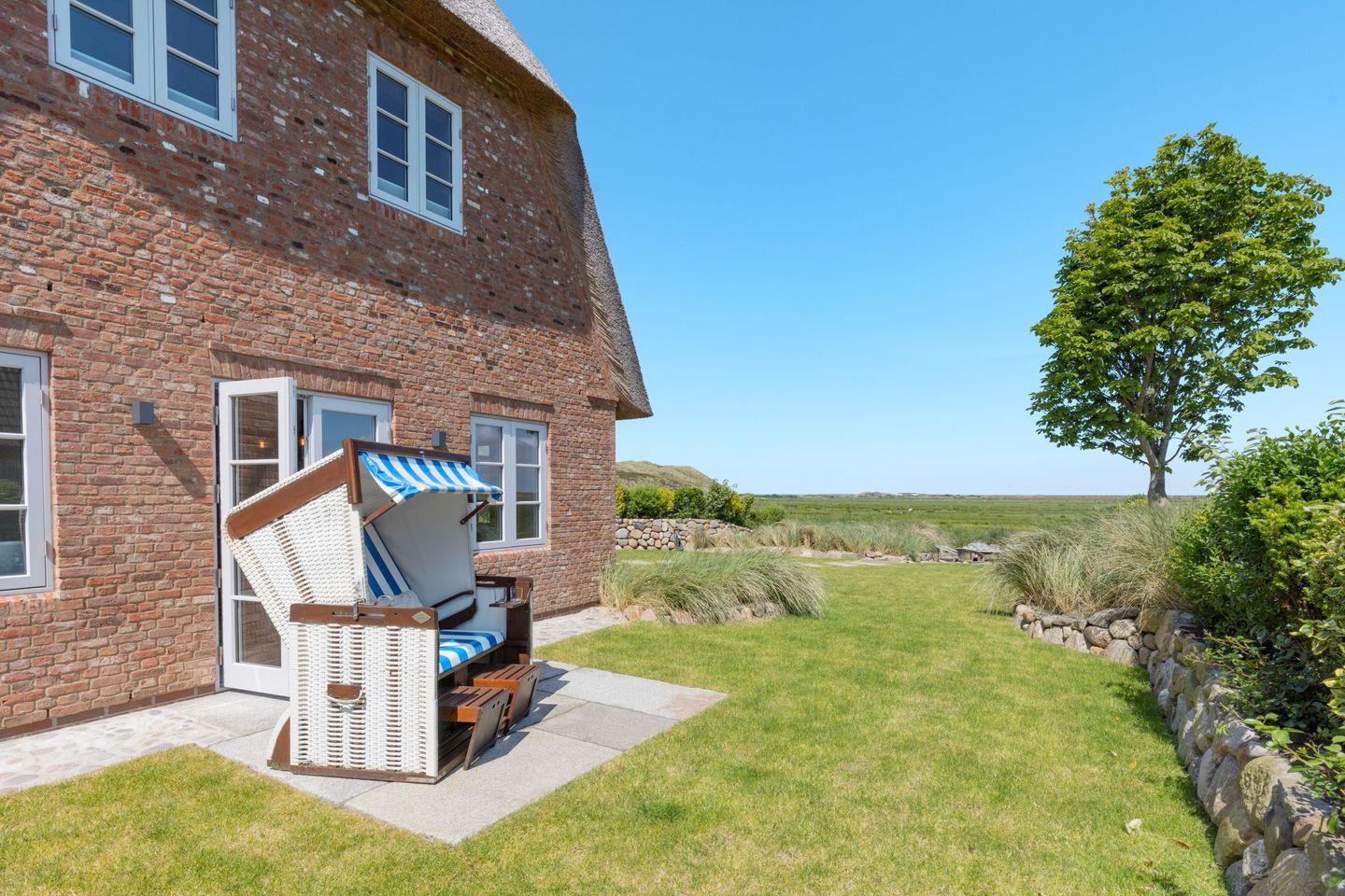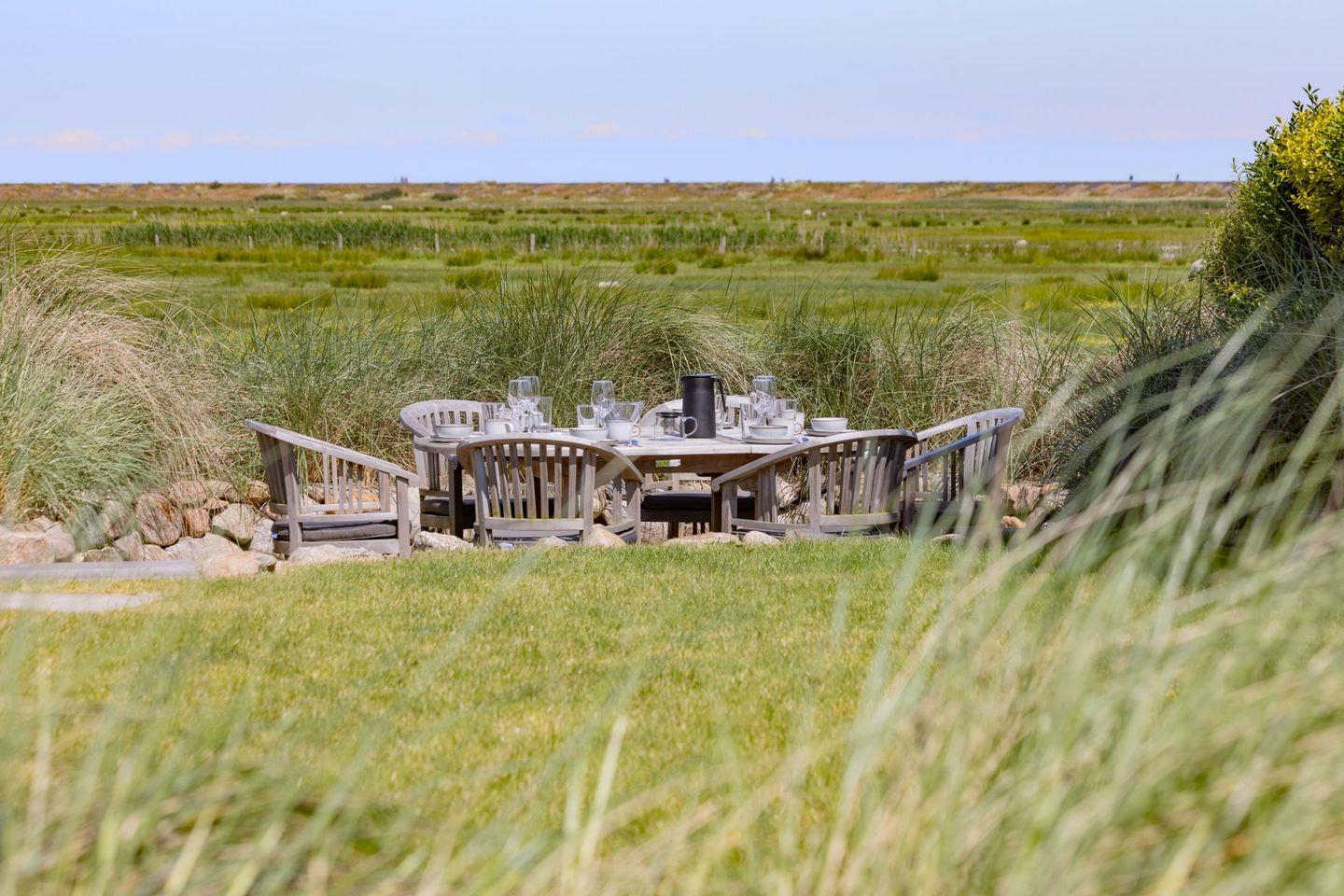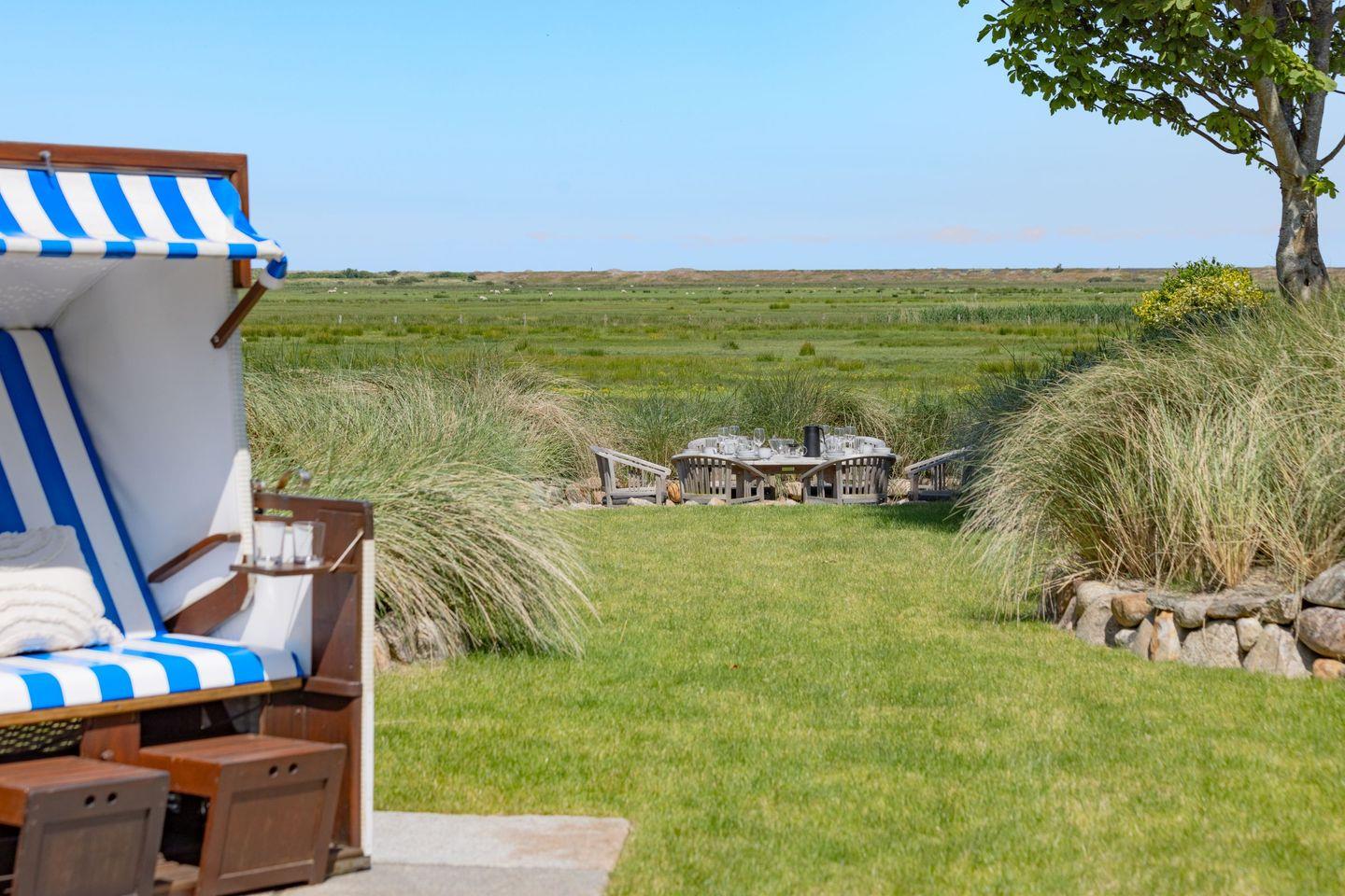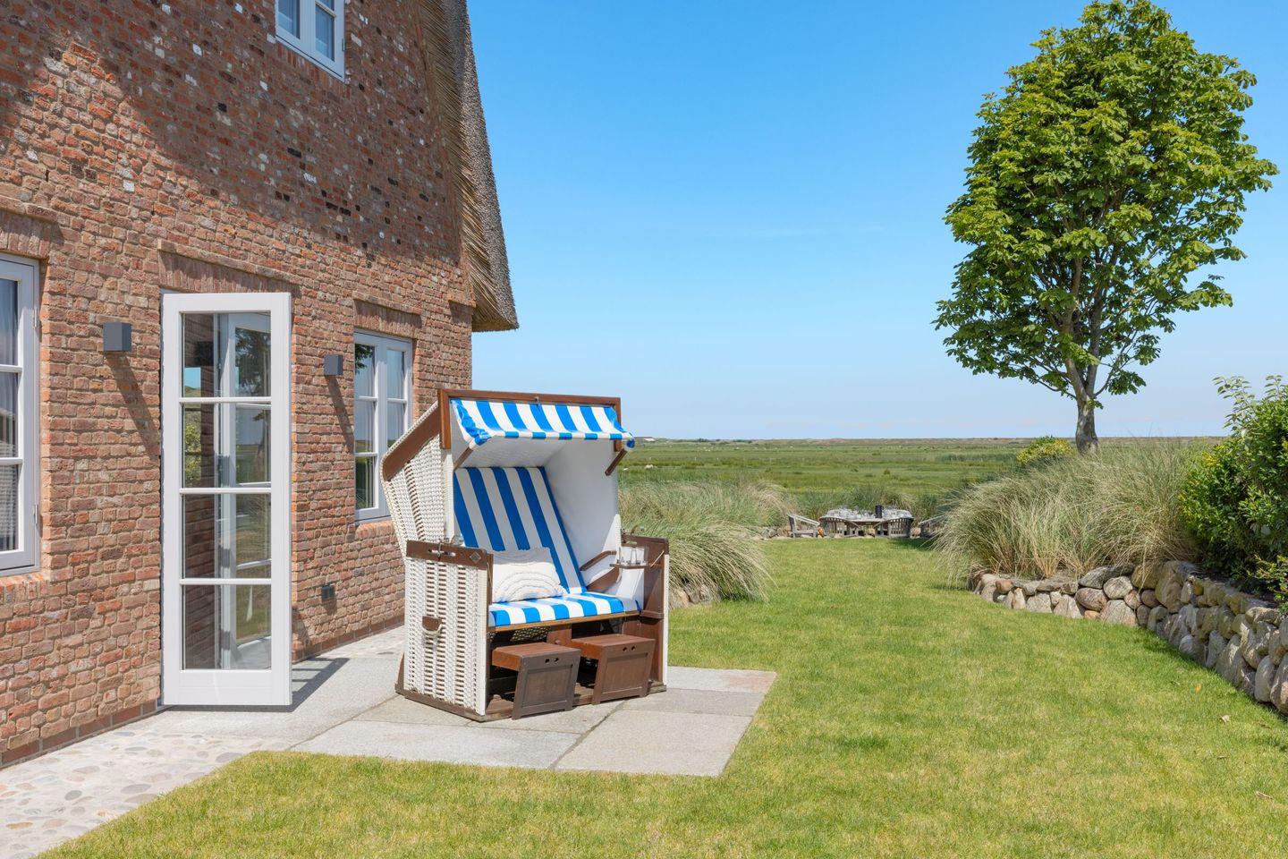 Ein besonderes Highlight ist der großzügige Außenbereich: Der weitläufige Garten mit zwei Terrassen eröffnet Ihnen einen direkten Blick auf das Naturschutzgebiet. Hier können Sie die Ruhe der Umgebung und die frische Nordseeluft in vollen Zügen genießen. Gartenmöbel sowie ein Strandkorb stehen Ihnen saisonal zur Verfügung und laden zum Verweilen im Freien ein.