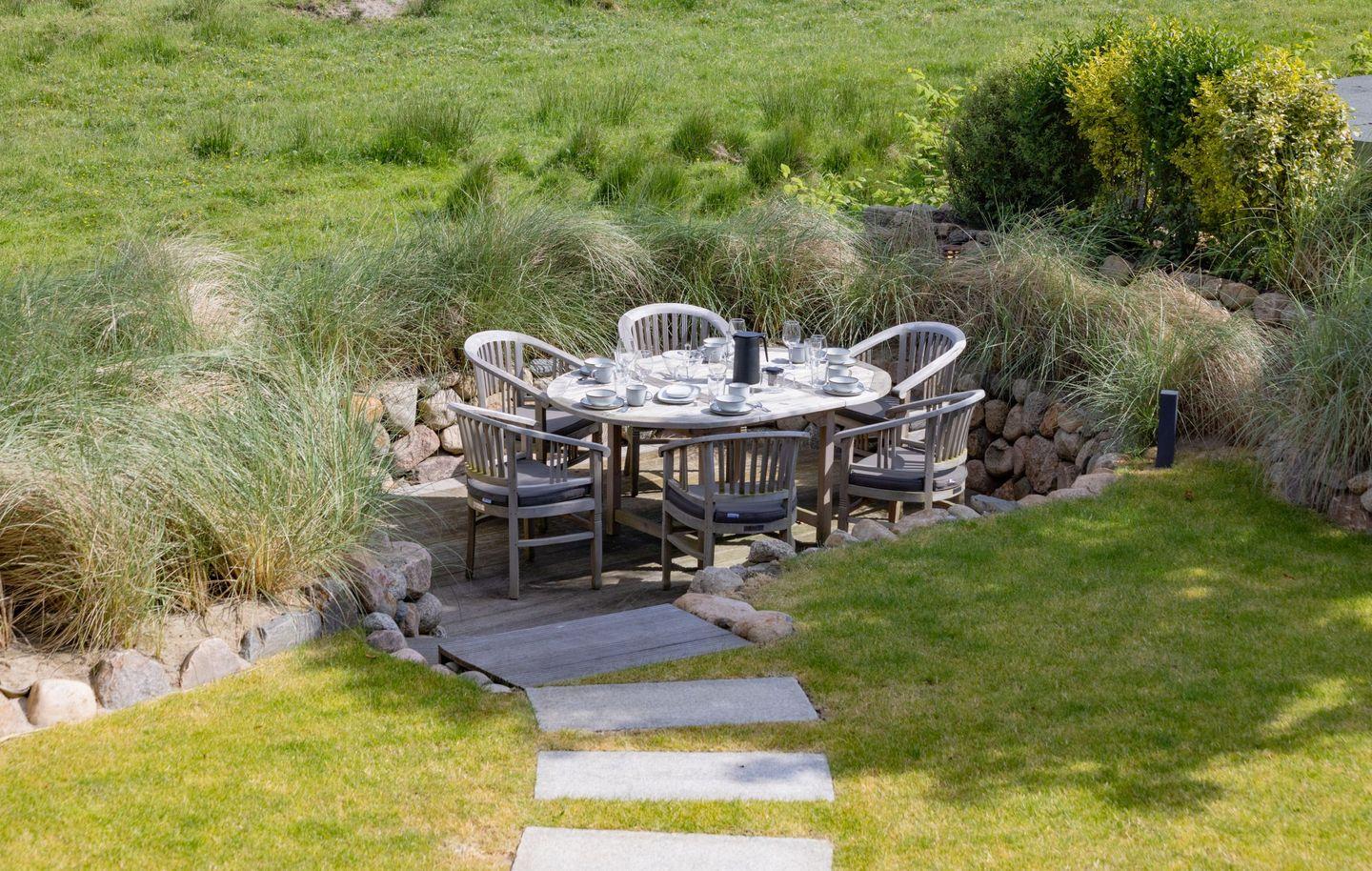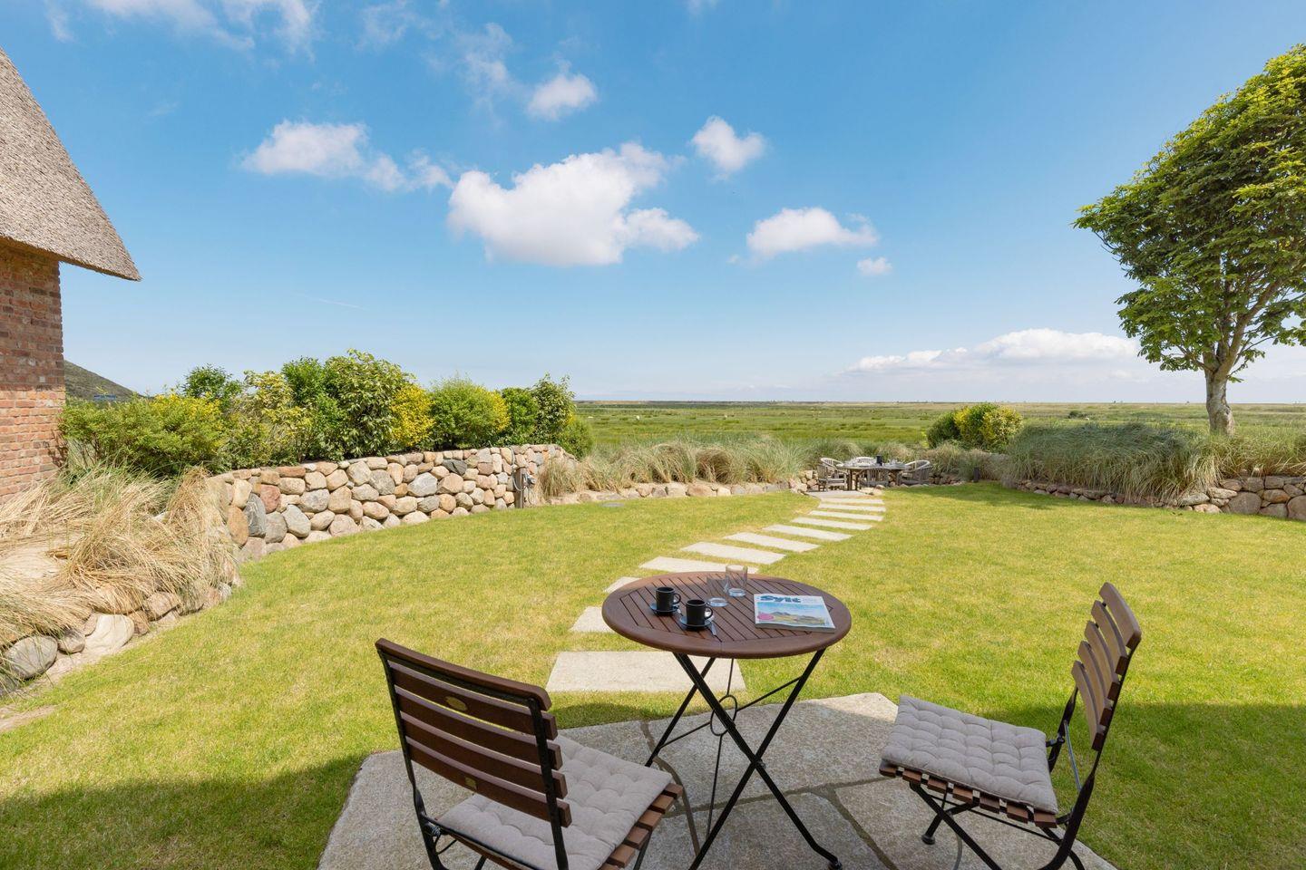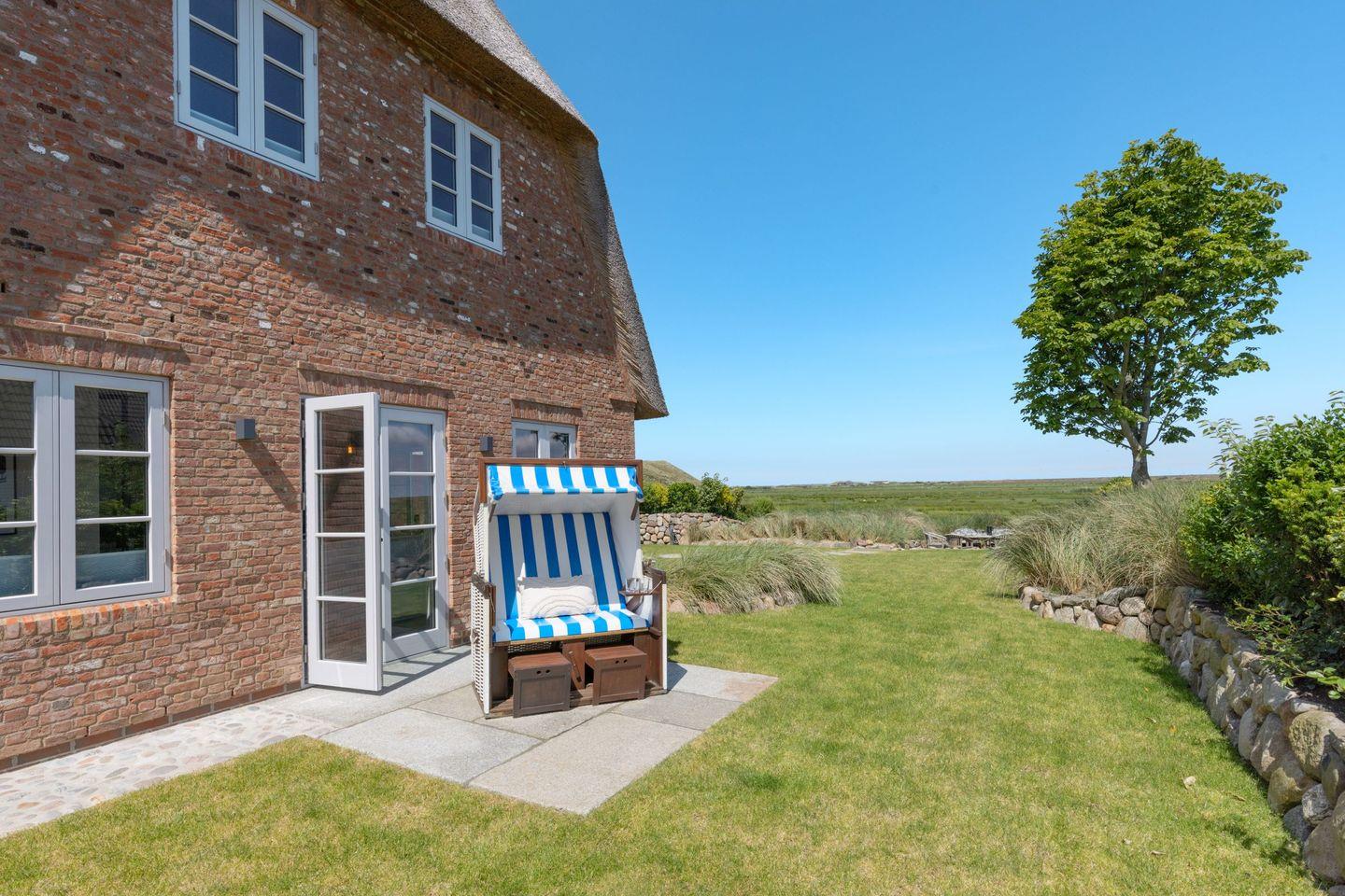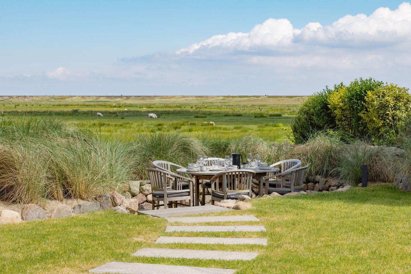 Ein besonderes Highlight ist der großzügige Außenbereich: Der weitläufige Garten mit zwei Terrassen eröffnet Ihnen einen direkten Blick auf das Naturschutzgebiet. Hier können Sie die Ruhe der Umgebung und die frische Nordseeluft in vollen Zügen genießen. Gartenmöbel sowie ein Strandkorb stehen Ihnen saisonal zur Verfügung und laden zum Verweilen im Freien ein.