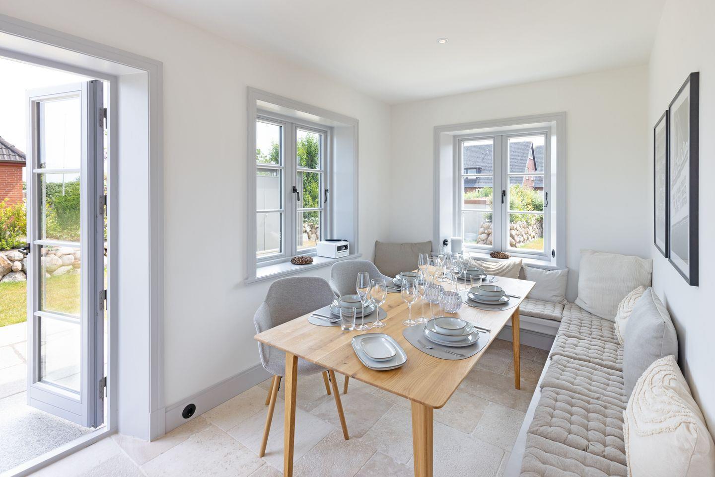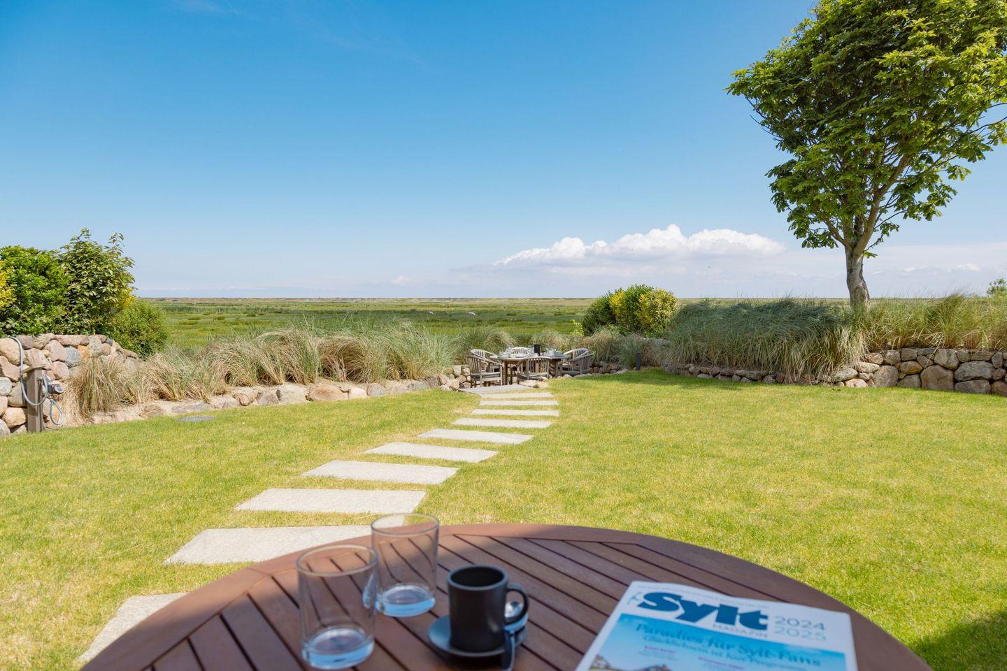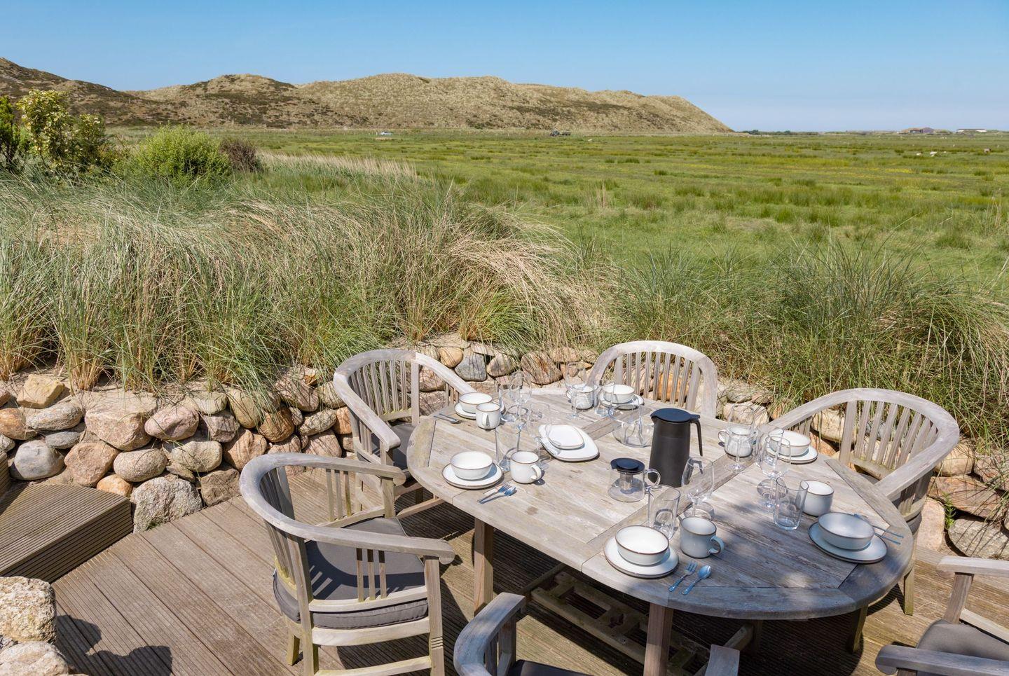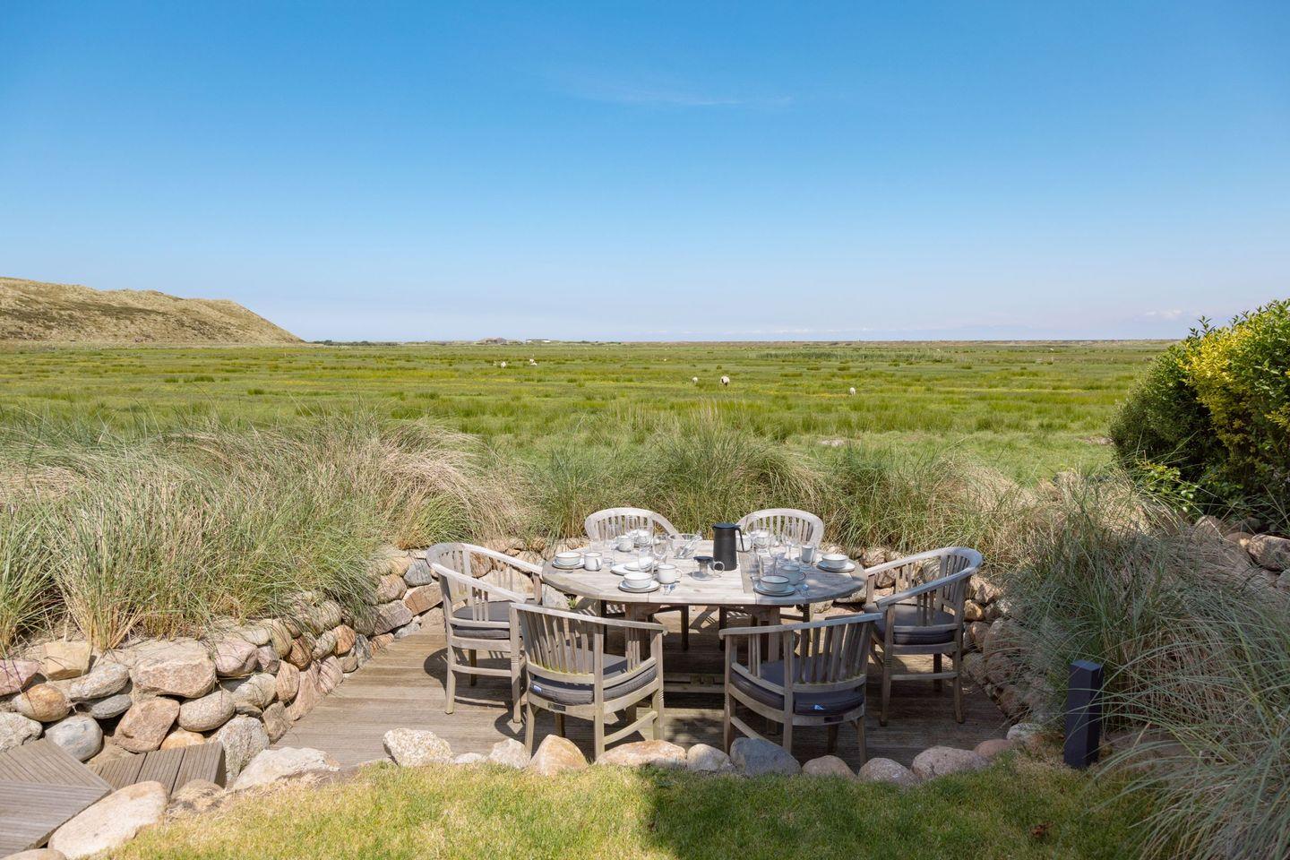 Ein besonderes Highlight ist der großzügige Außenbereich: Der weitläufige Garten mit zwei Terrassen eröffnet Ihnen einen direkten Blick auf das Naturschutzgebiet. Hier können Sie die Ruhe der Umgebung und die frische Nordseeluft in vollen Zügen genießen. Gartenmöbel sowie ein Strandkorb stehen Ihnen saisonal zur Verfügung und laden zum Verweilen im Freien ein.