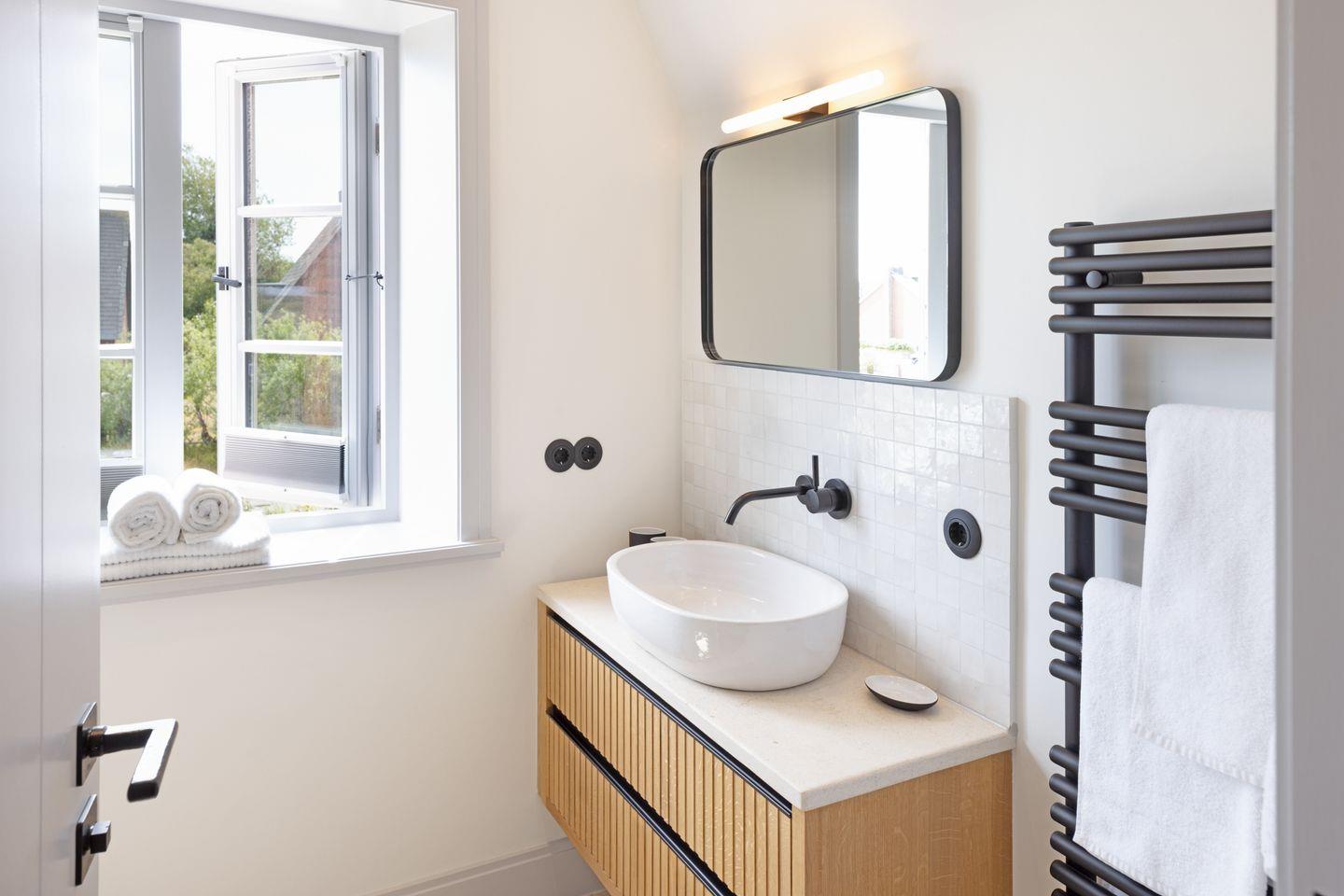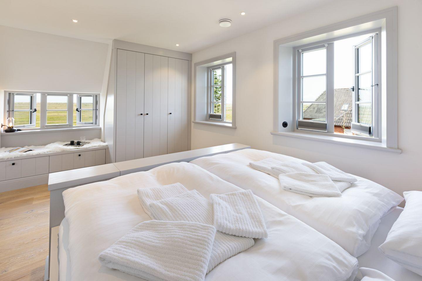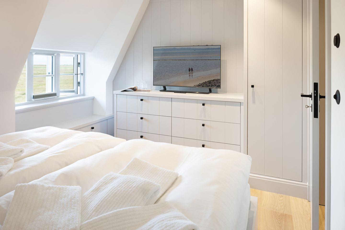Im Obergeschoss befinden sich zwei komfortable Schlafzimmer, jeweils ausgestattet mit Doppelbett und Fernseher. Beide Zimmer bieten einen herrlichen, freien Blick auf die Lister Fenne und schaffen eine besonders ruhige und erholsame Schlafatmosphäre. Ergänzt wird diese Etage durch ein modernes Badezimmer mit Dusche sowie ein weiteres Gäste-WC.