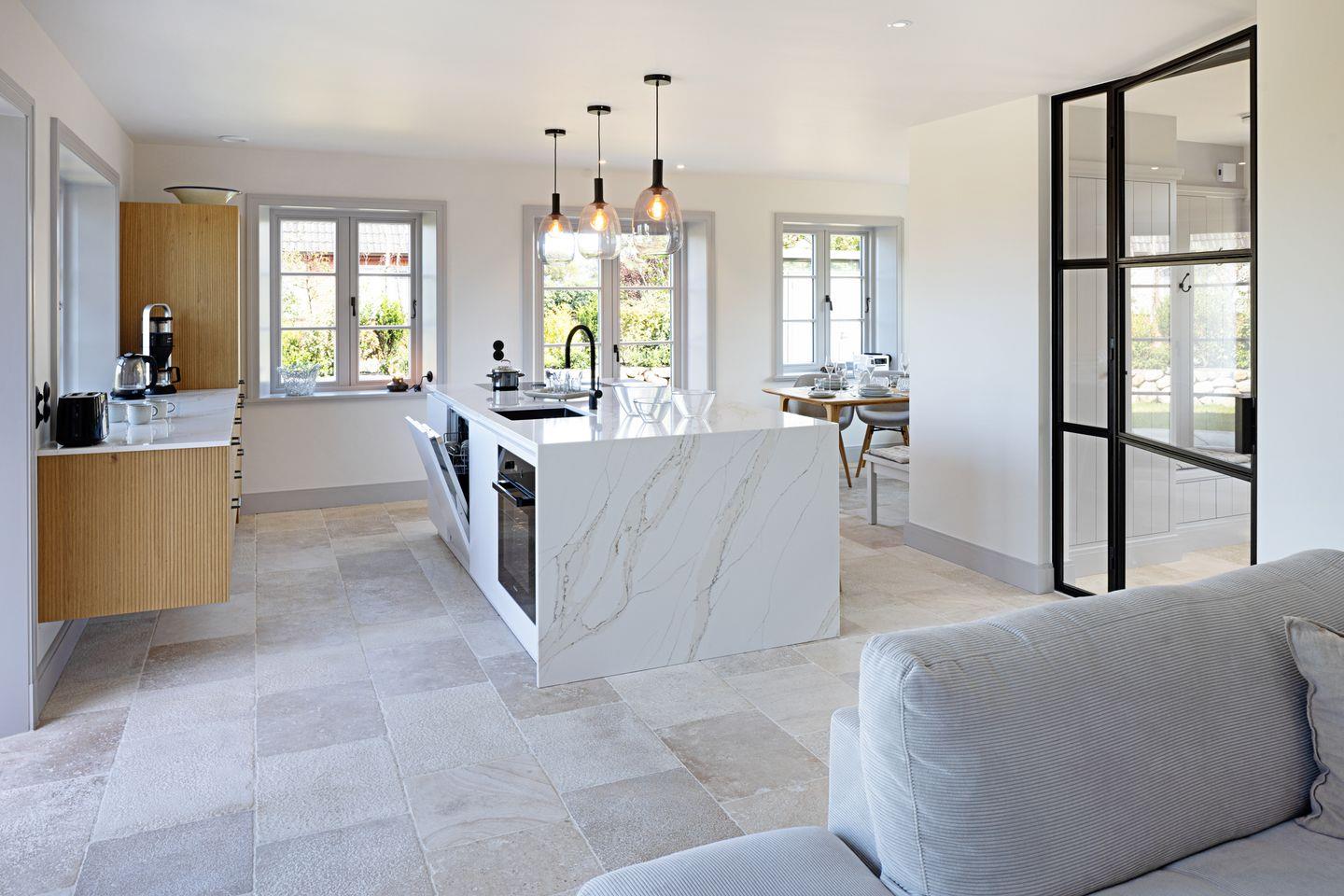 Das Haus erstreckt sich über mehrere Ebenen und verbindet modernes Wohnen mit einer warmen, einladenden Atmosphäre. Im Erdgeschoss erwartet Sie ein gemütlicher Wohnbereich mit Gaskamin und Flachbildfernseher, der zu entspannten Abenden einlädt. Die offene, moderne Küche mit angrenzendem Essbereich ist bestens ausgestattet und bietet ideale Voraussetzungen für gemeinsame Mahlzeiten. Ein Gäste-WC befindet sich ebenfalls auf dieser Etage.