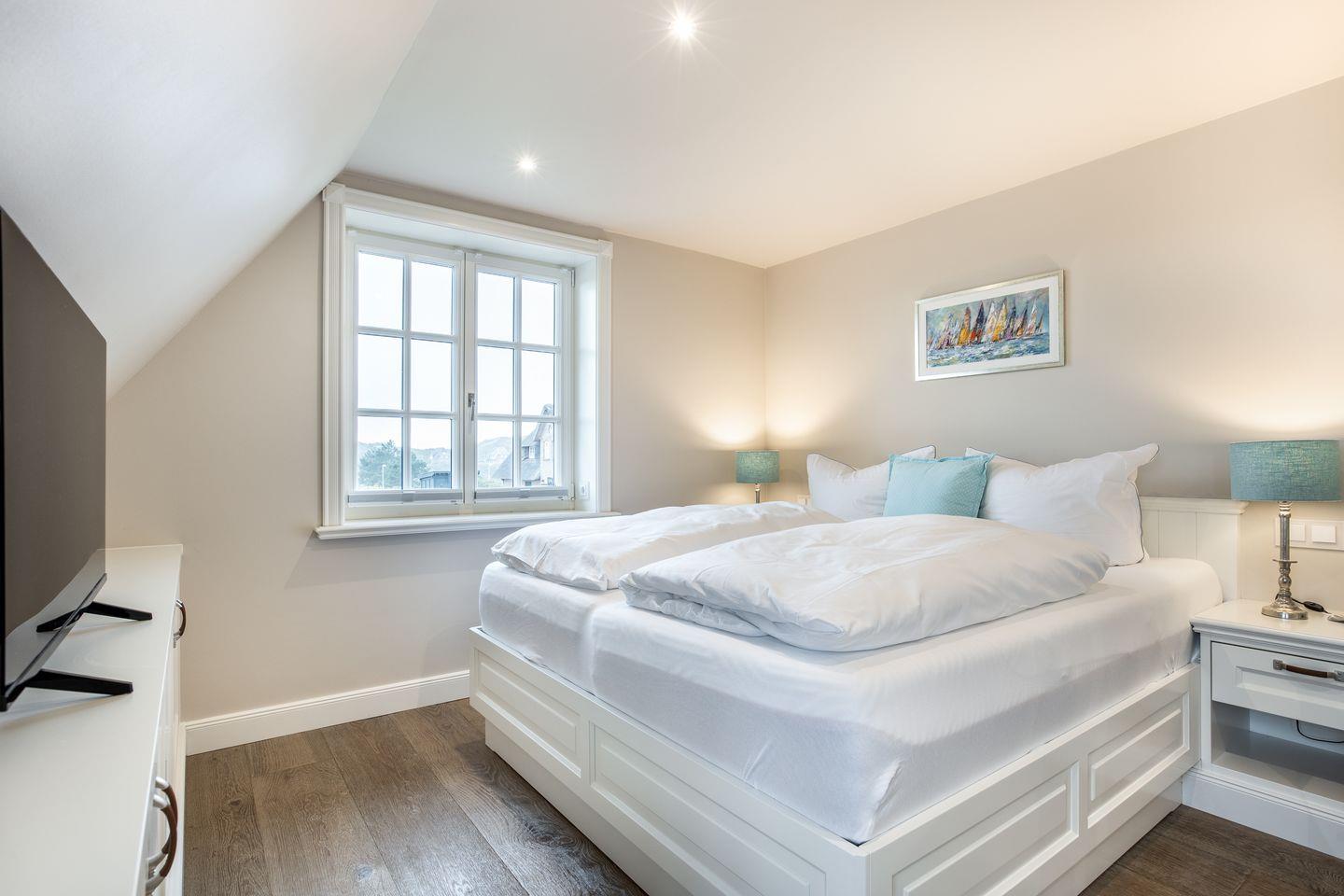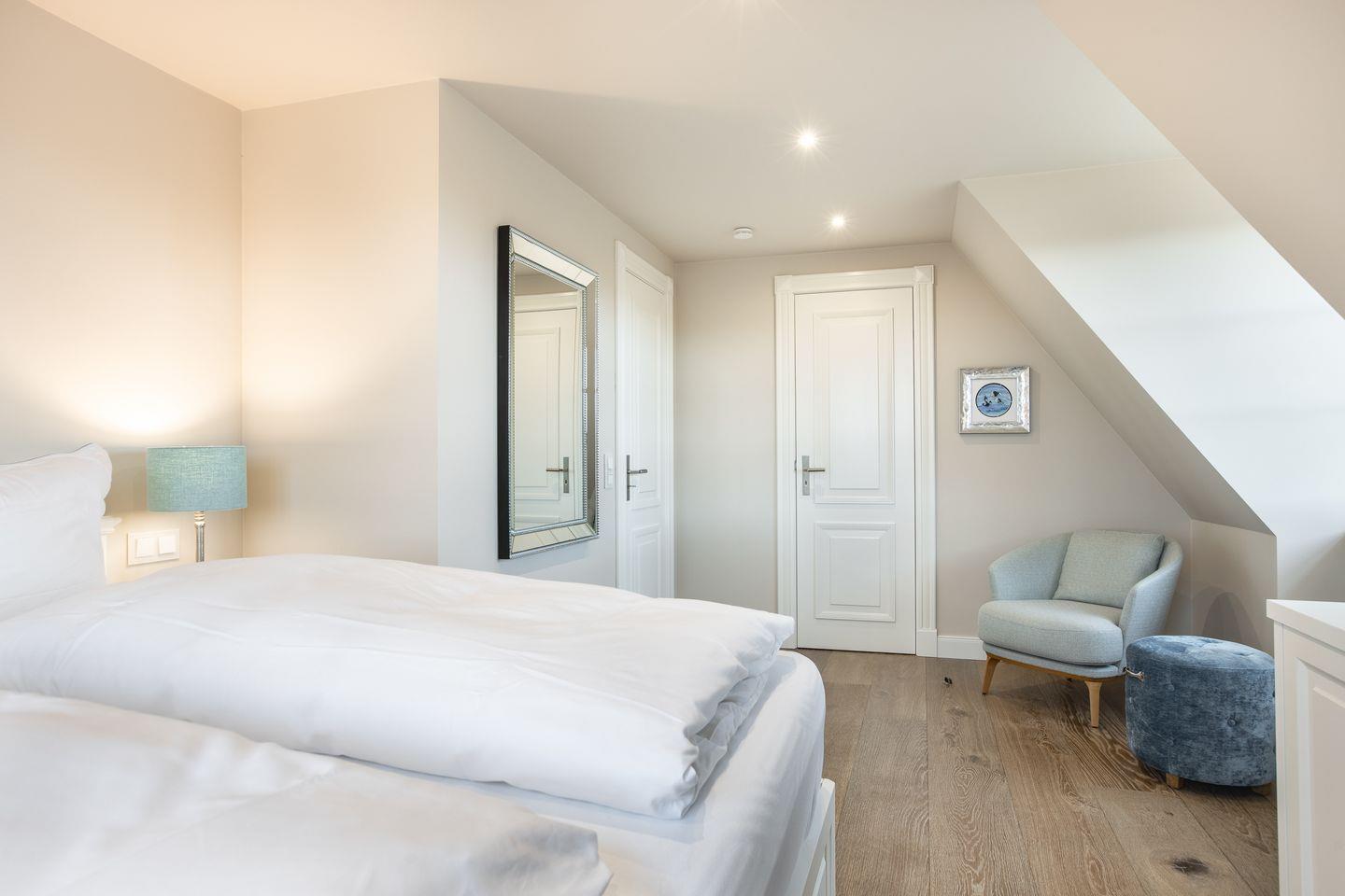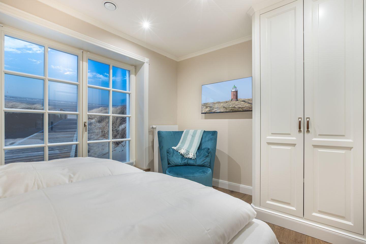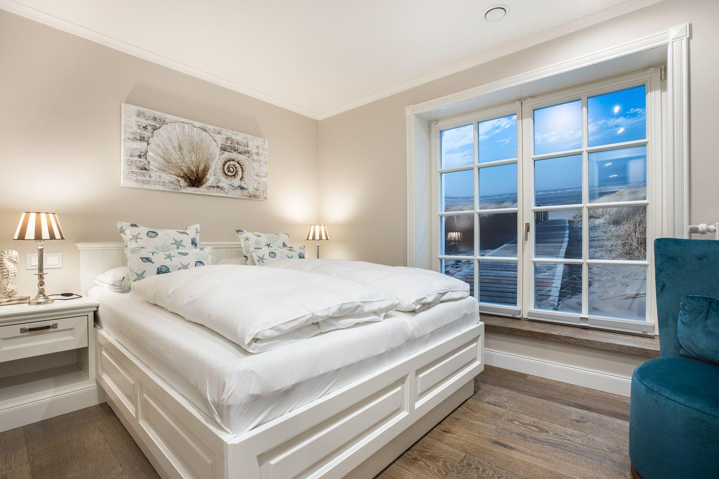 Im Obergeschoss befindet sich ein lichtdurchflutetes Schlafzimmer mit Doppelbett und Tempur Matratzen, begehbarem Kleiderschrank, Flatscreen-TV, Bose Sound System. Von dort können Sie einen Blick aufs Meer genießen. Im Bad erwartet Sie eine freistehende Badewanne und Dusche sowie ein separates WC.